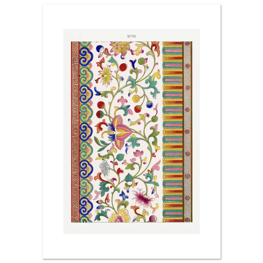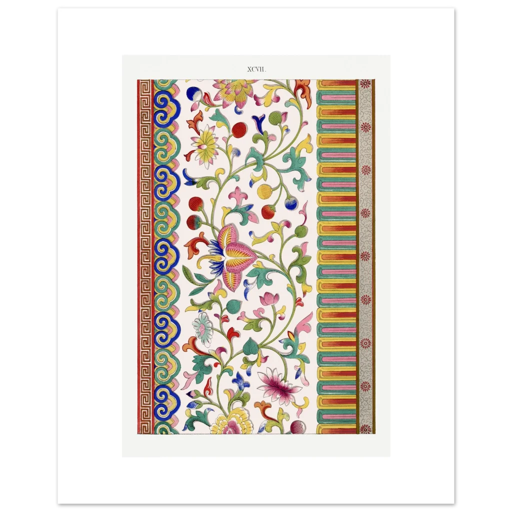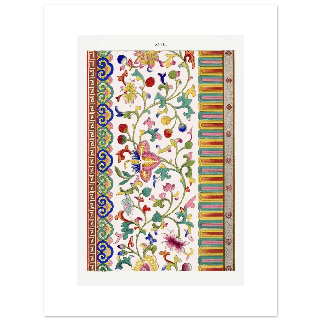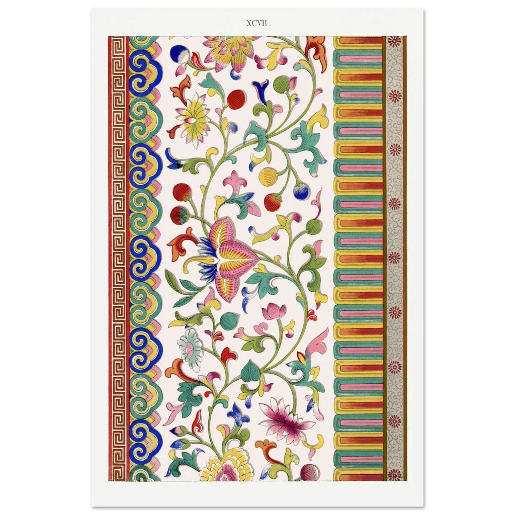 Bring the timeless elegance and vibrant energy of traditional Chinoiserie into your living space with this exquisite floral art print. Featuring a lively botanical vine adorned with colorful blooms, intricate leaves, and classic patterns like the Greek key and cloud motifs, this poster adds a sophisticated touch of artistic heritage. The rich color palette and detailed design will captivate any admirer of classic art, making it a focal point in any room.
