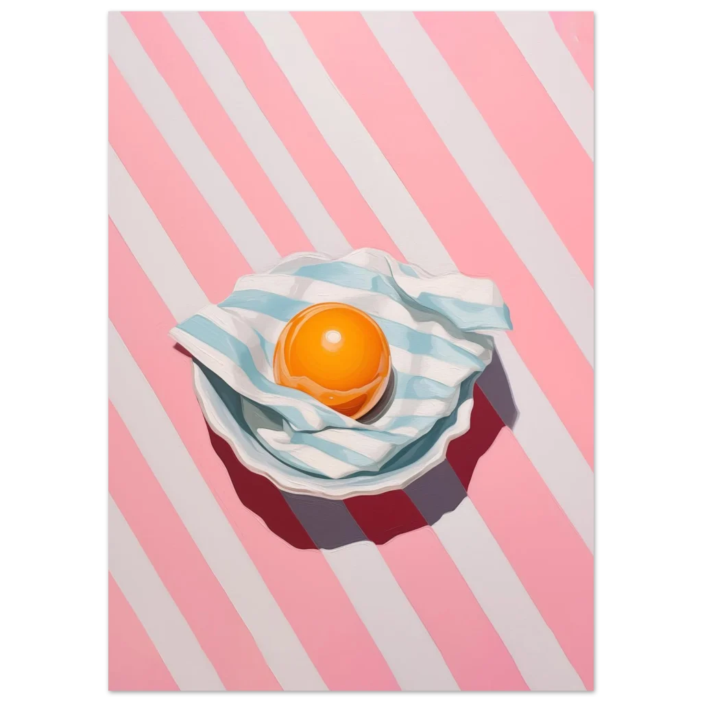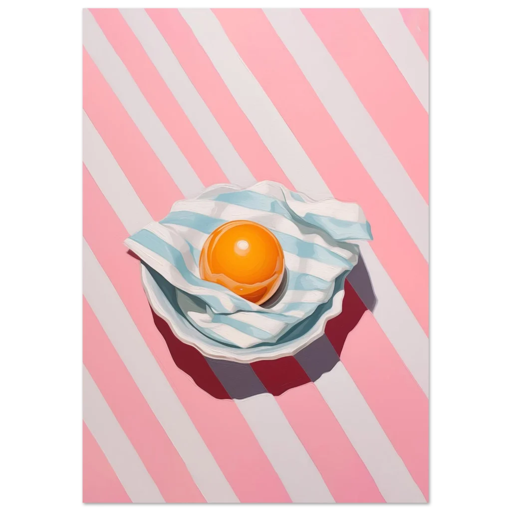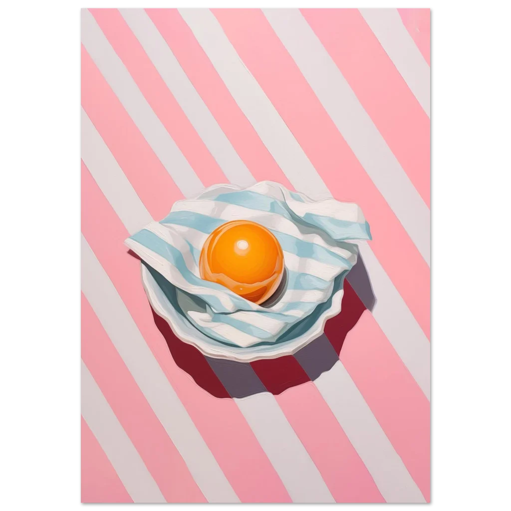 Brighten your space with a pop of playful charm! Our ‘Vibrant Egg Yolk on Candy Stripe’ poster brings a unique blend of modern art and whimsical delight to any room. Featuring a captivating egg yolk nestled on a striped blue and white cloth, all set against an energetic pink and white candy-striped background, this piece is a feast for the eyes. Its bold colors and contemporary style make it a perfect statement piece for kitchens, dining areas, or any space needing a touch of cheerful sophistication.