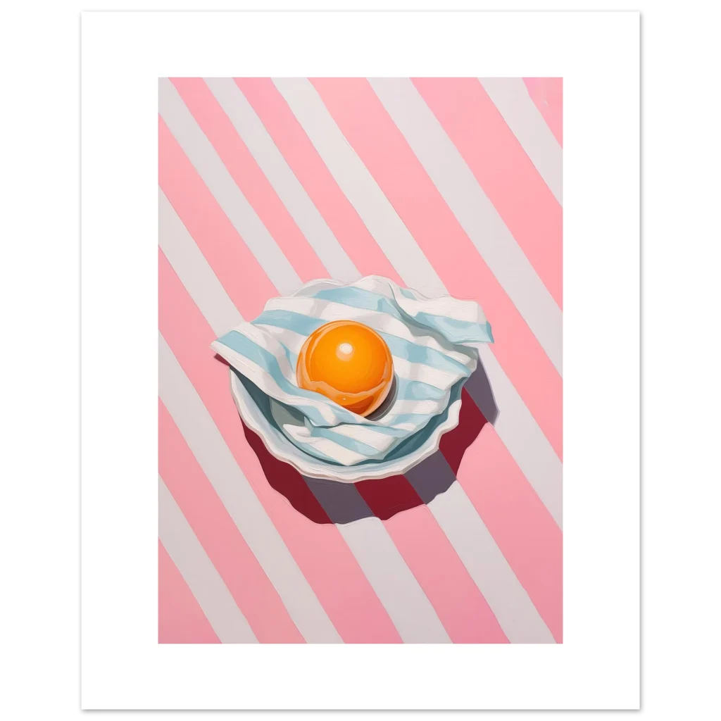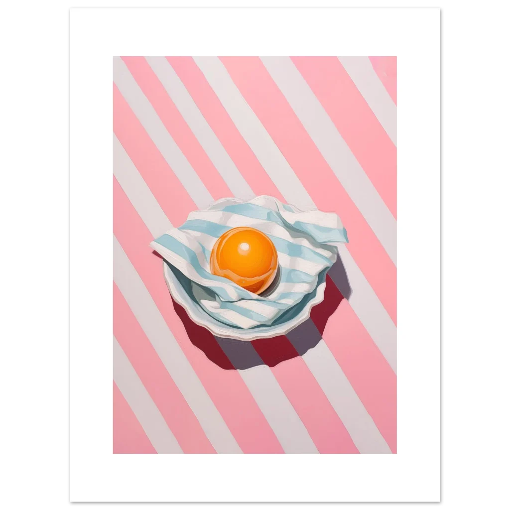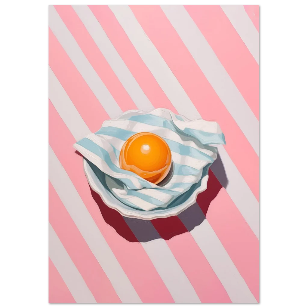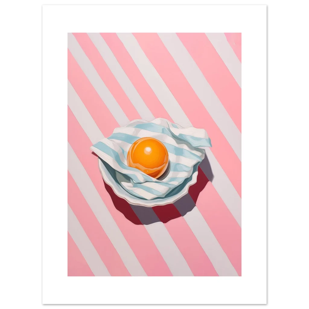Brighten your space with a pop of playful charm! Our ‘Vibrant Egg Yolk on Candy Stripe’ poster brings a unique blend of modern art and whimsical delight to any room. Featuring a captivating egg yolk nestled on a striped blue and white cloth, all set against an energetic pink and white candy-striped background, this piece is a feast for the eyes. Its bold colors and contemporary style make it a perfect statement piece for kitchens, dining areas, or any space needing a touch of cheerful sophistication.