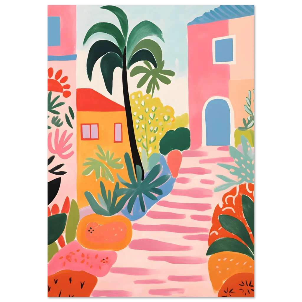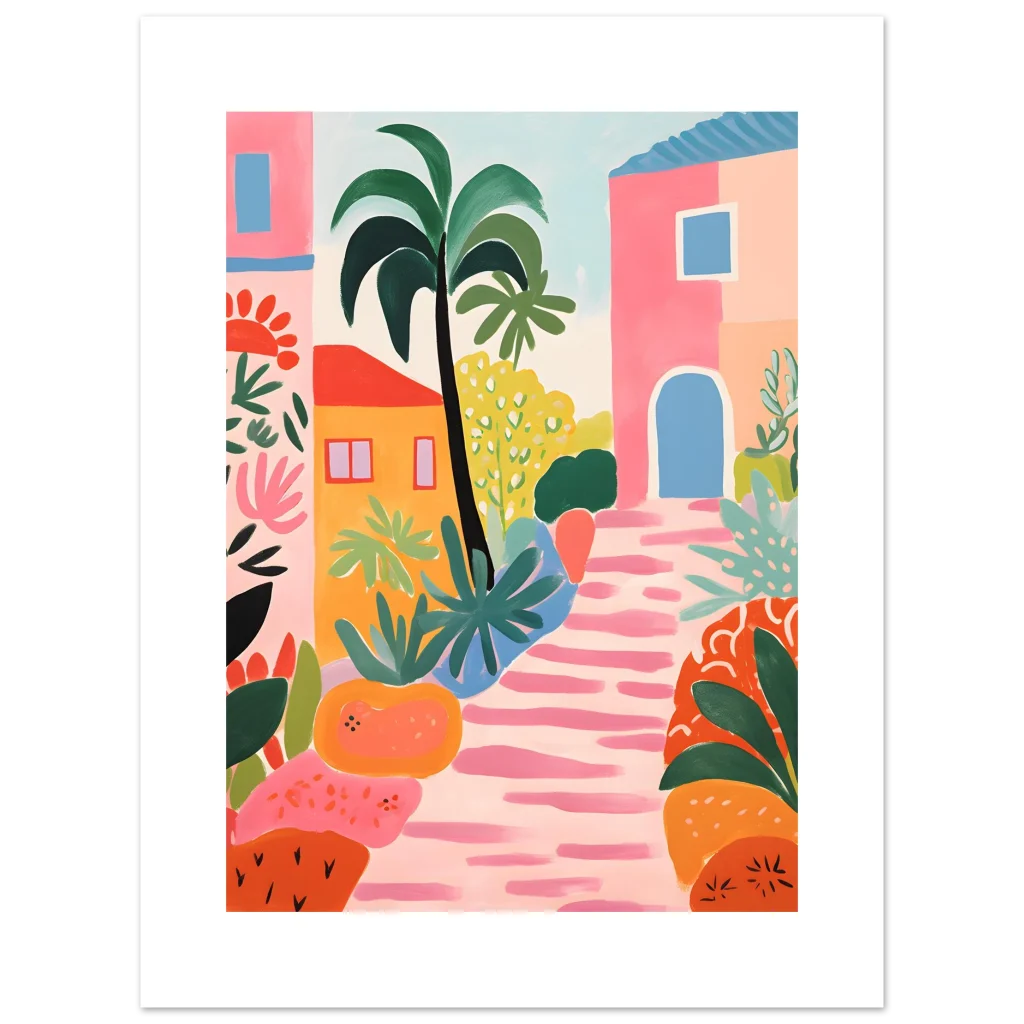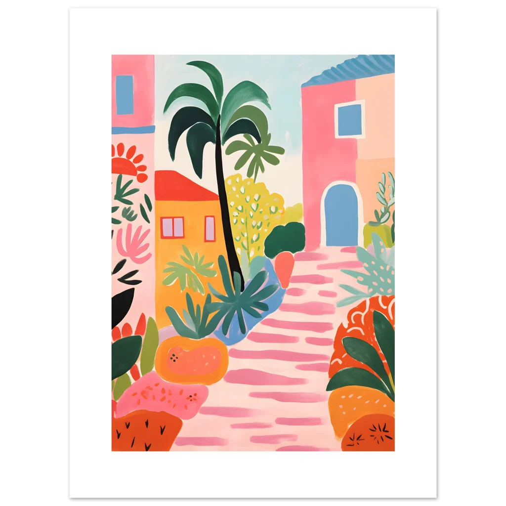 Bring the sun-drenched charm of a Mediterranean escape into your home with this vibrant art print. Featuring a playful palette of coral pinks, warm oranges, and lush greens, this piece evokes the joy of a hidden villa garden. Its abstract, painterly style captures the essence of a serene summer day, perfect for adding a pop of color and artistic flair to any room.