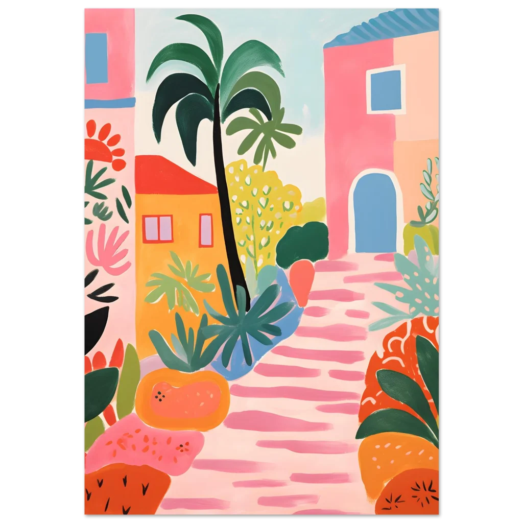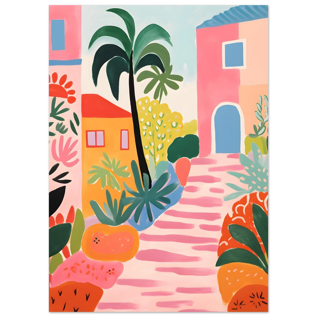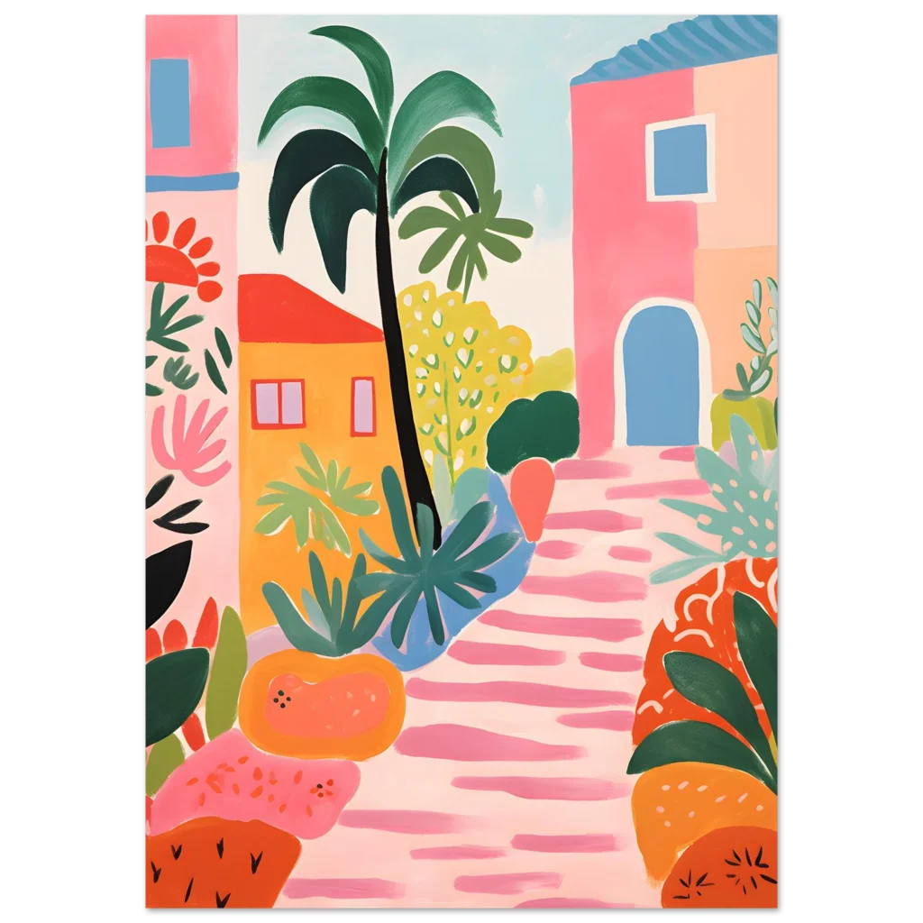 Bring the sun-drenched charm of a Mediterranean escape into your home with this vibrant art print. Featuring a playful palette of coral pinks, warm oranges, and lush greens, this piece evokes the joy of a hidden villa garden. Its abstract, painterly style captures the essence of a serene summer day, perfect for adding a pop of color and artistic flair to any room.