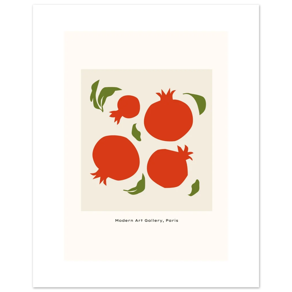 Infuse your space with a burst of timeless charm and modern simplicity with our Pomegranate Art Print. Inspired by the clean lines and bold colors of mid-century design, this piece features abstract pomegranates in a striking coral red against a soft, neutral background, accented by playful olive green leaves. It’s perfect for adding a touch of sophisticated whimsy to any room, bringing a feeling of warmth and artistic flair.