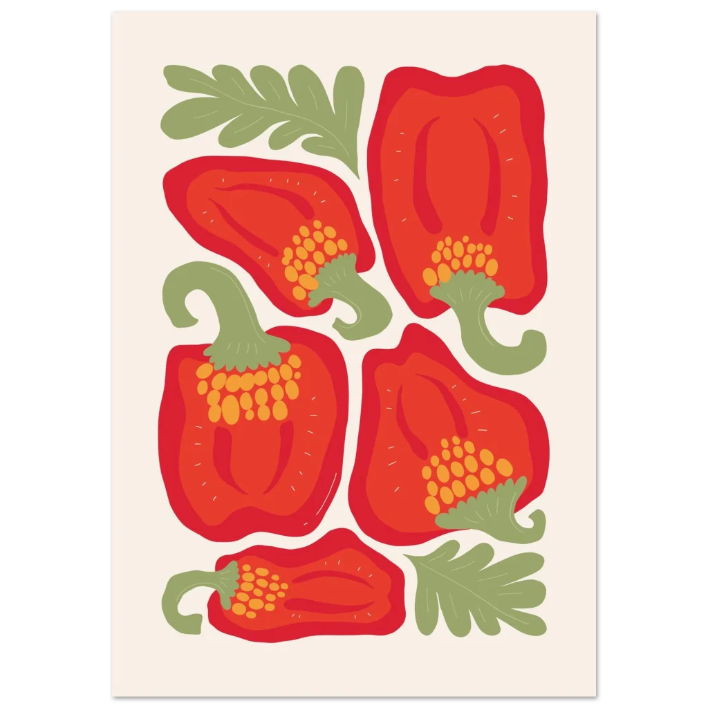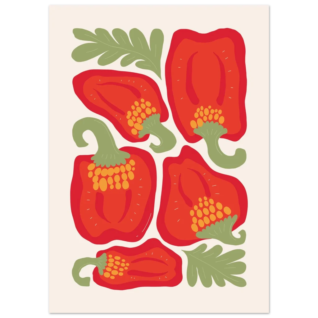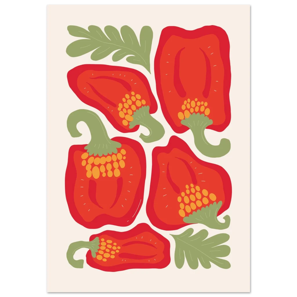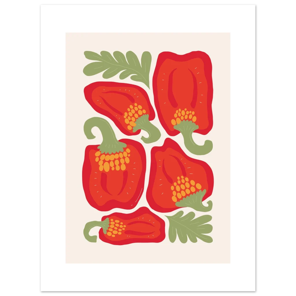 Infuse your living space with the fresh, vibrant energy of a bountiful harvest! Our “Vibrant Red Pepper Botanical Art Print” captures the delightful essence of sliced red peppers and lush green leaves in a charming, modern artistic style. The warm red and earthy green tones, set against a subtle cream background, bring a touch of rustic elegance and culinary inspiration to any room, particularly your kitchen or dining area.