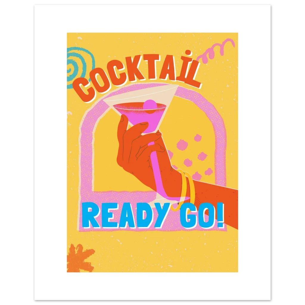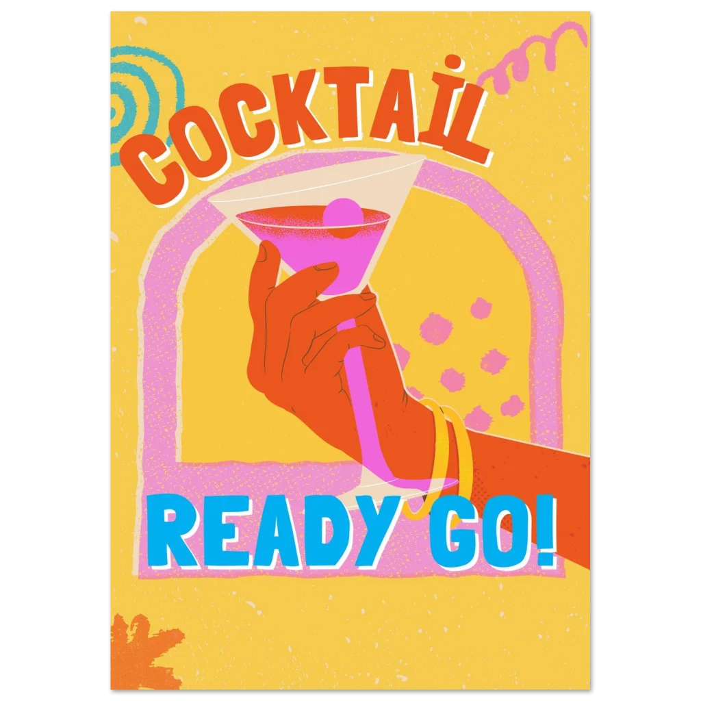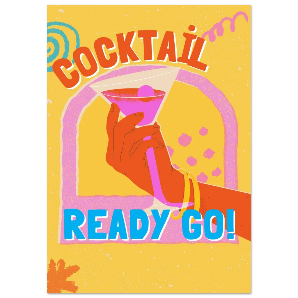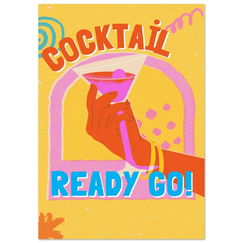 Bring the party to your walls with our ‘Cocktail Ready Go!’ art print! This vibrant poster, bursting with retro flair and a playful spirit, is designed to infuse any room with instant joy and a touch of vintage cool. The bold colors and energetic design make it a perfect statement piece for your living room, home bar, or office, inviting good times and a lively atmosphere.