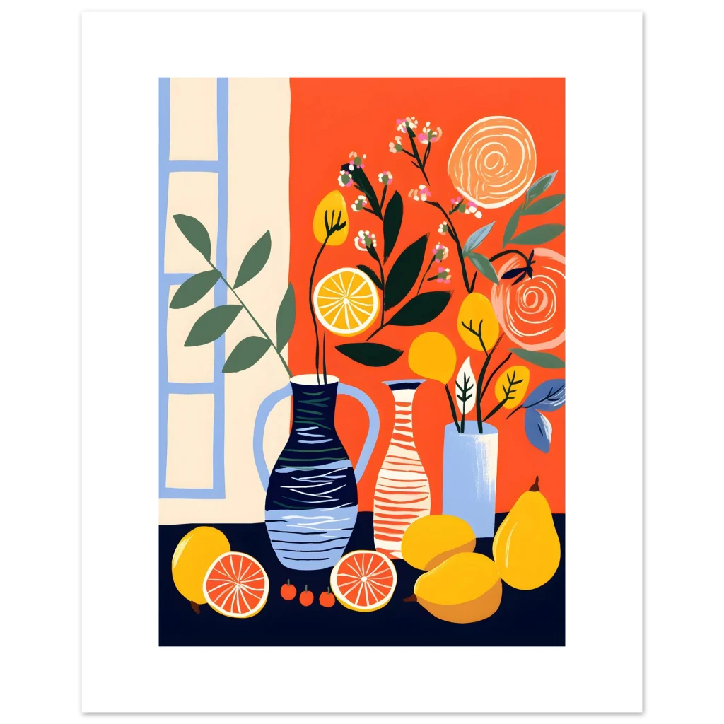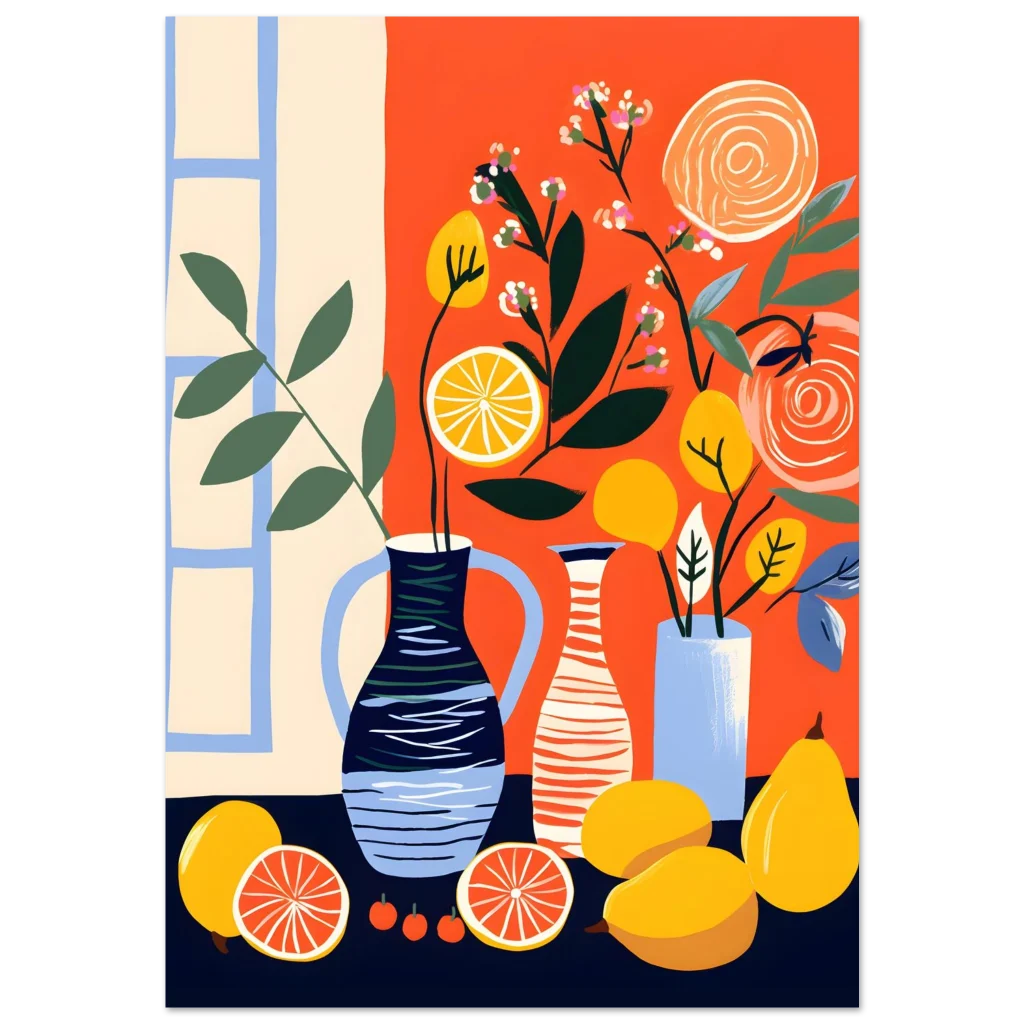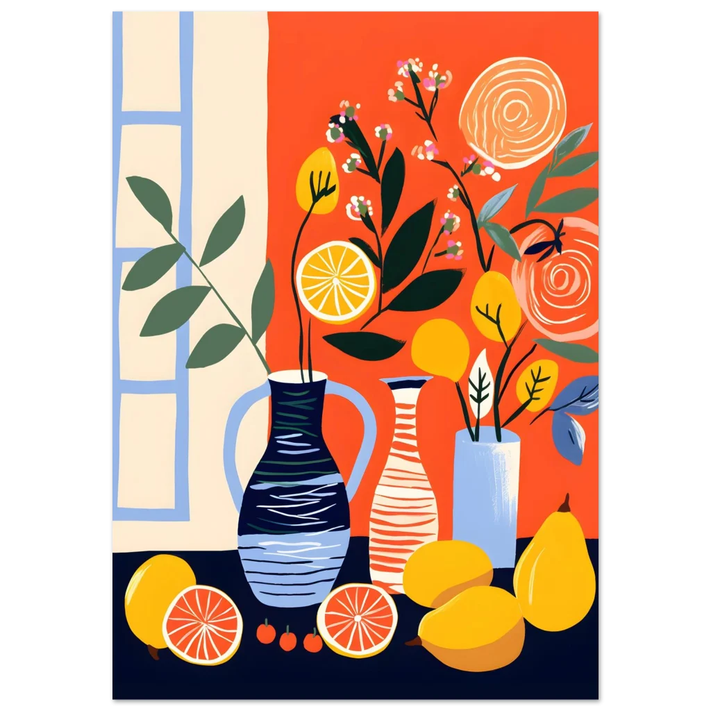 Infuse your living space with a burst of joyous color and timeless style! This vibrant still life botanical print captures the essence of mid-century modern design, bringing a lively and refreshing aesthetic to any room. With its bold oranges, serene blues, and sunny yellows, this poster is a perfect statement piece for those who appreciate art that feels both contemporary and classically chic.