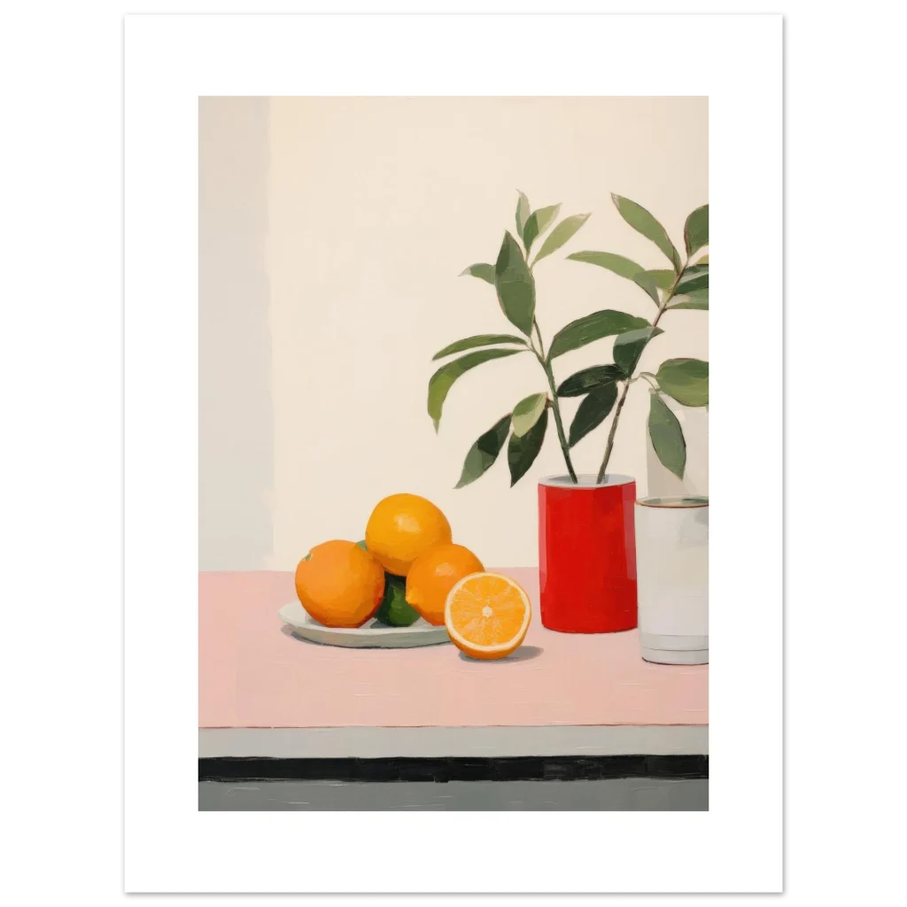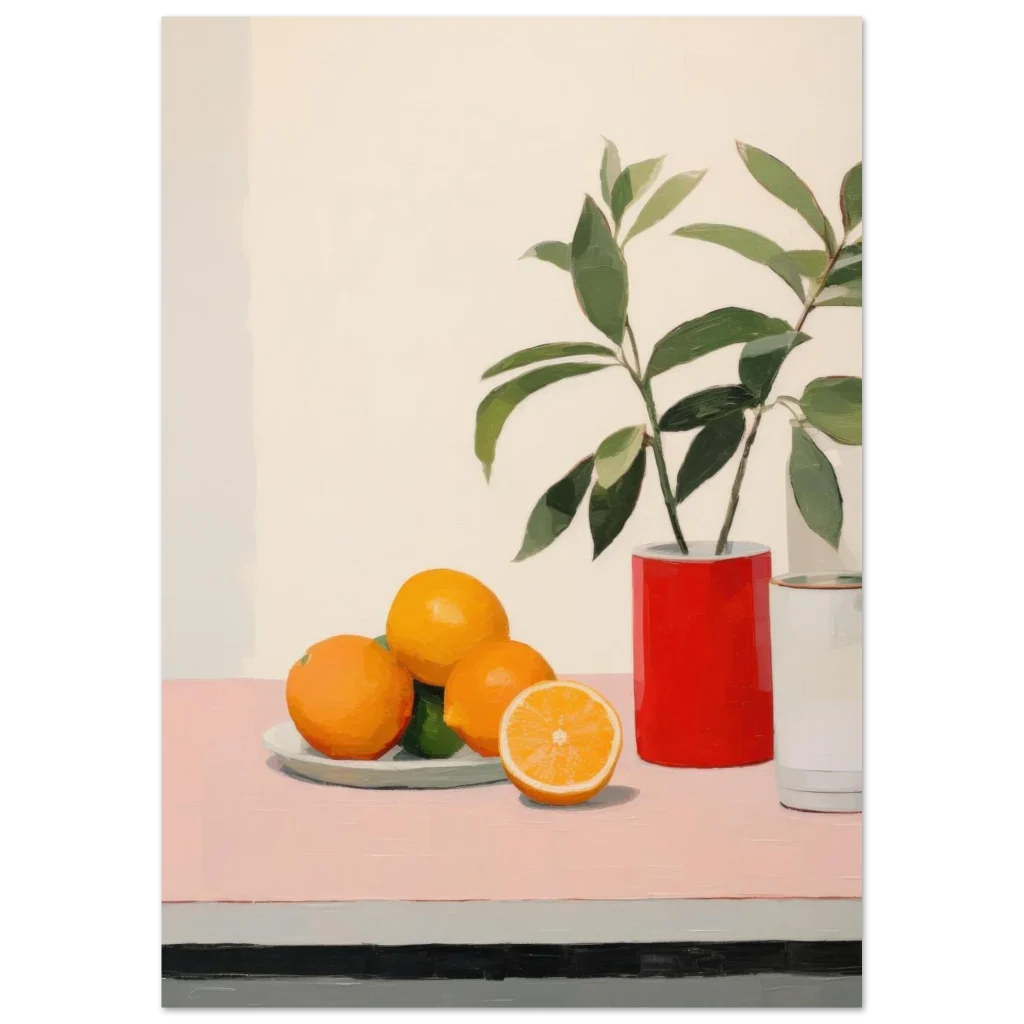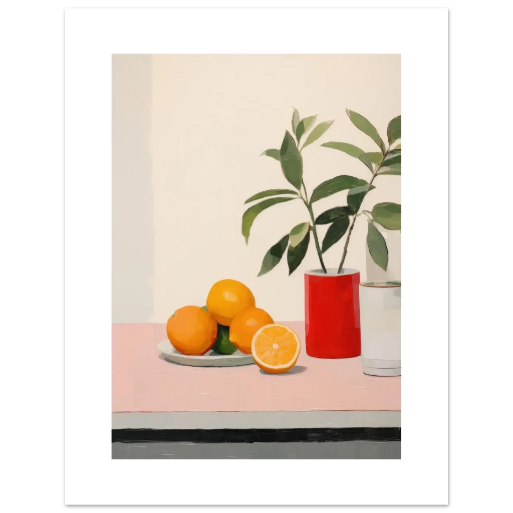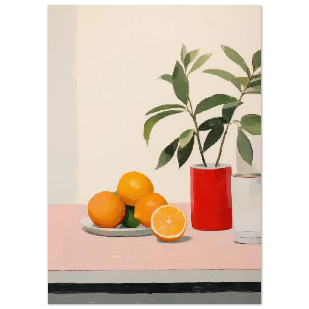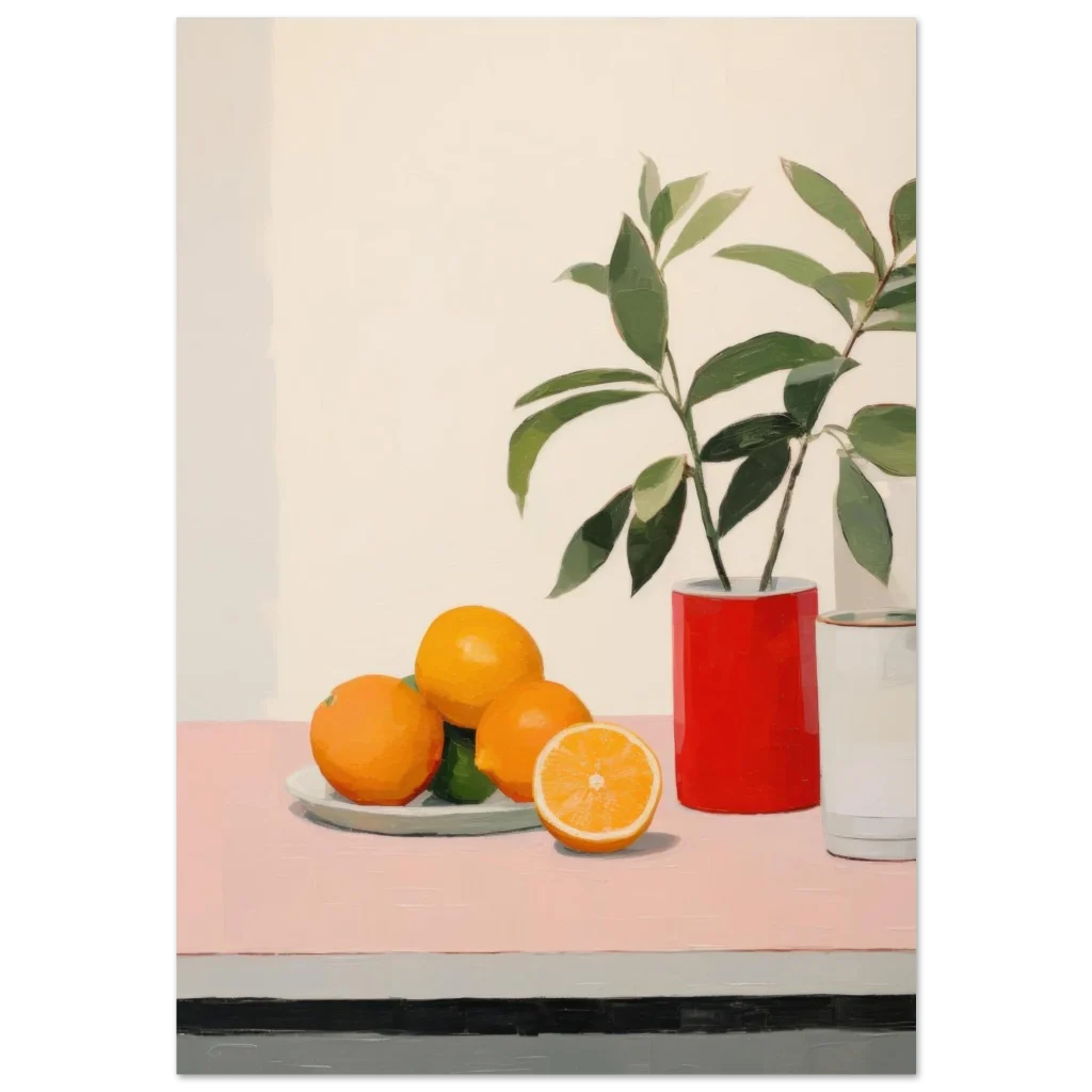 Bring a burst of modern elegance and fresh vitality to your space with our Vibrant Still Life poster. This artwork captures the playful harmony of vivid oranges and lush greens against a serene, minimalist backdrop, embodying a contemporary still life with bold brushstrokes and an inviting palette. It’s an ideal piece to add a touch of artistic flair and a pop of color to any room, reflecting a chic and refreshing aesthetic.