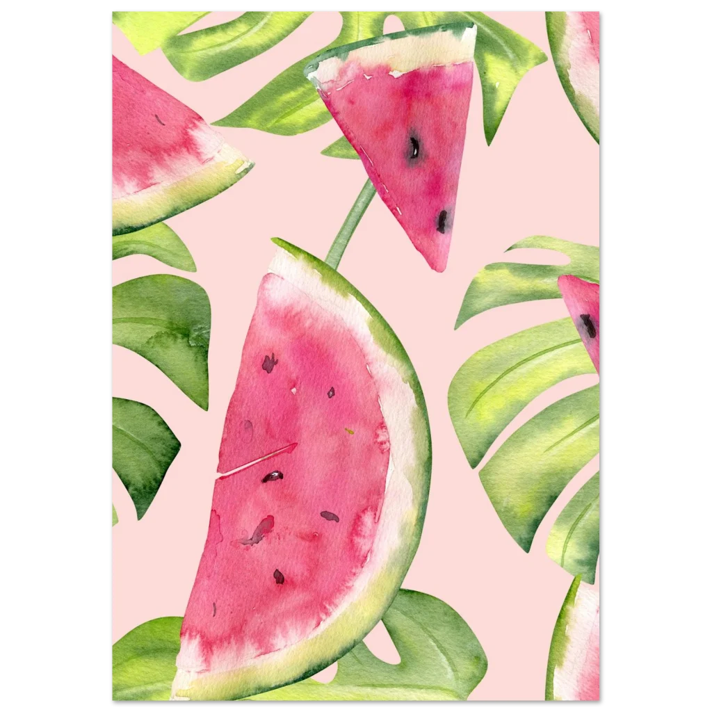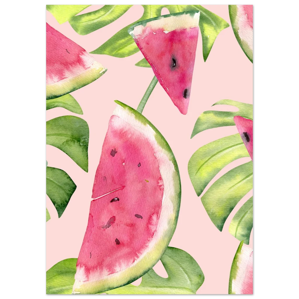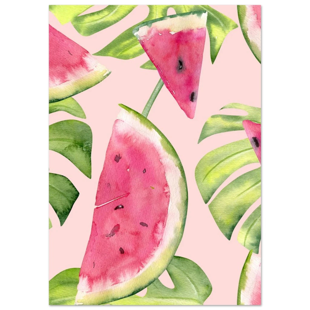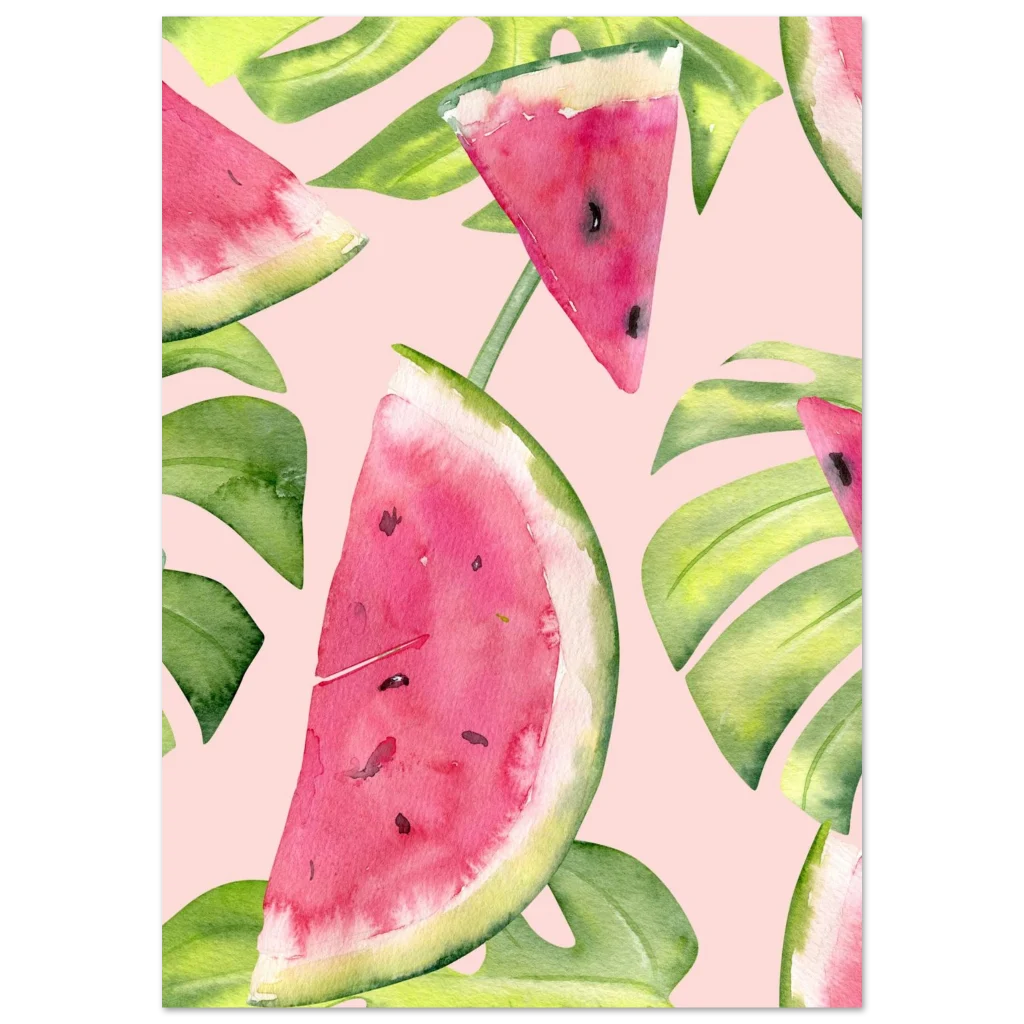 Infuse your space with a slice of summer joy and tropical vibes! Our Classic Semi-Glossy Paper Poster features a delightful watercolor design of fresh watermelon slices and lush monstera leaves, bursting with vibrant pinks and greens against a soft, playful background. This poster brings a refreshing, artistic touch that brightens any room and evokes sunny, carefree days.
