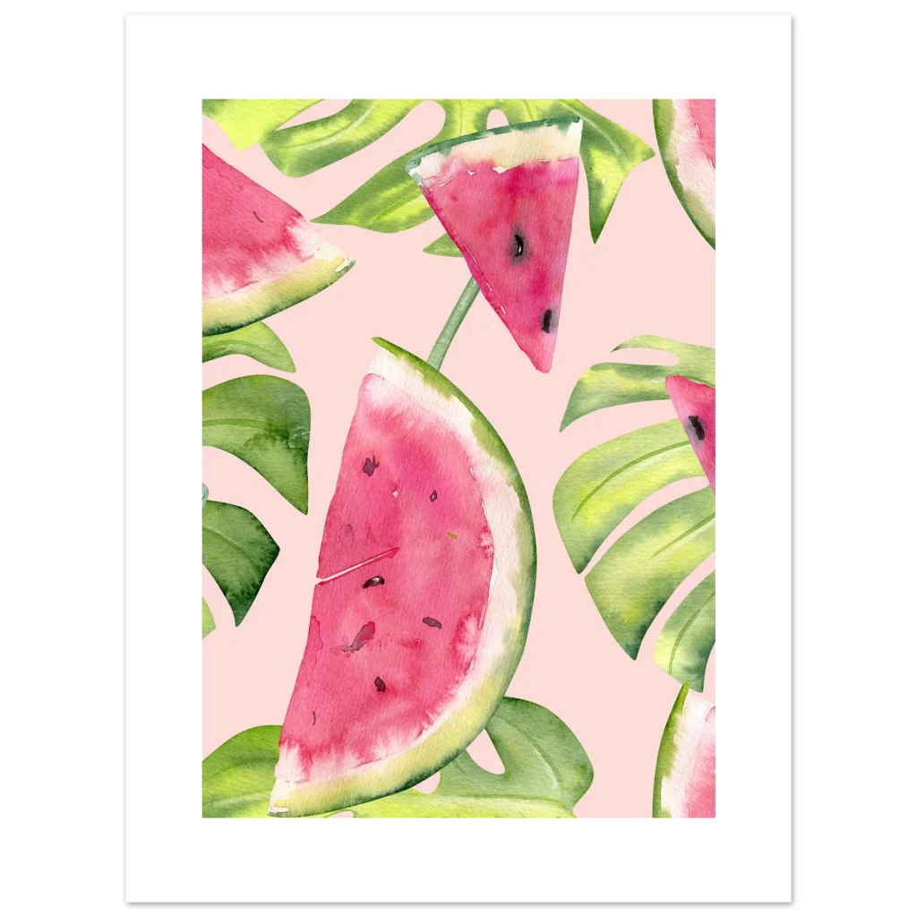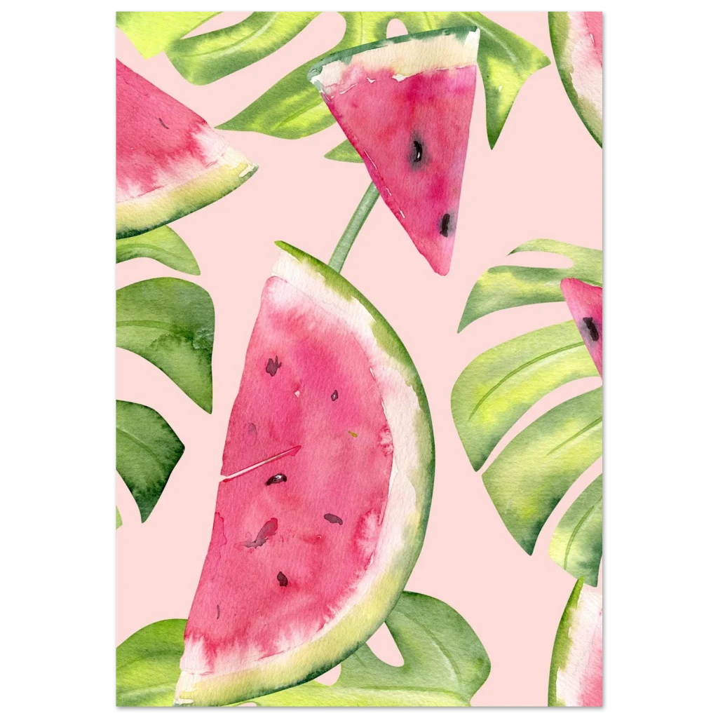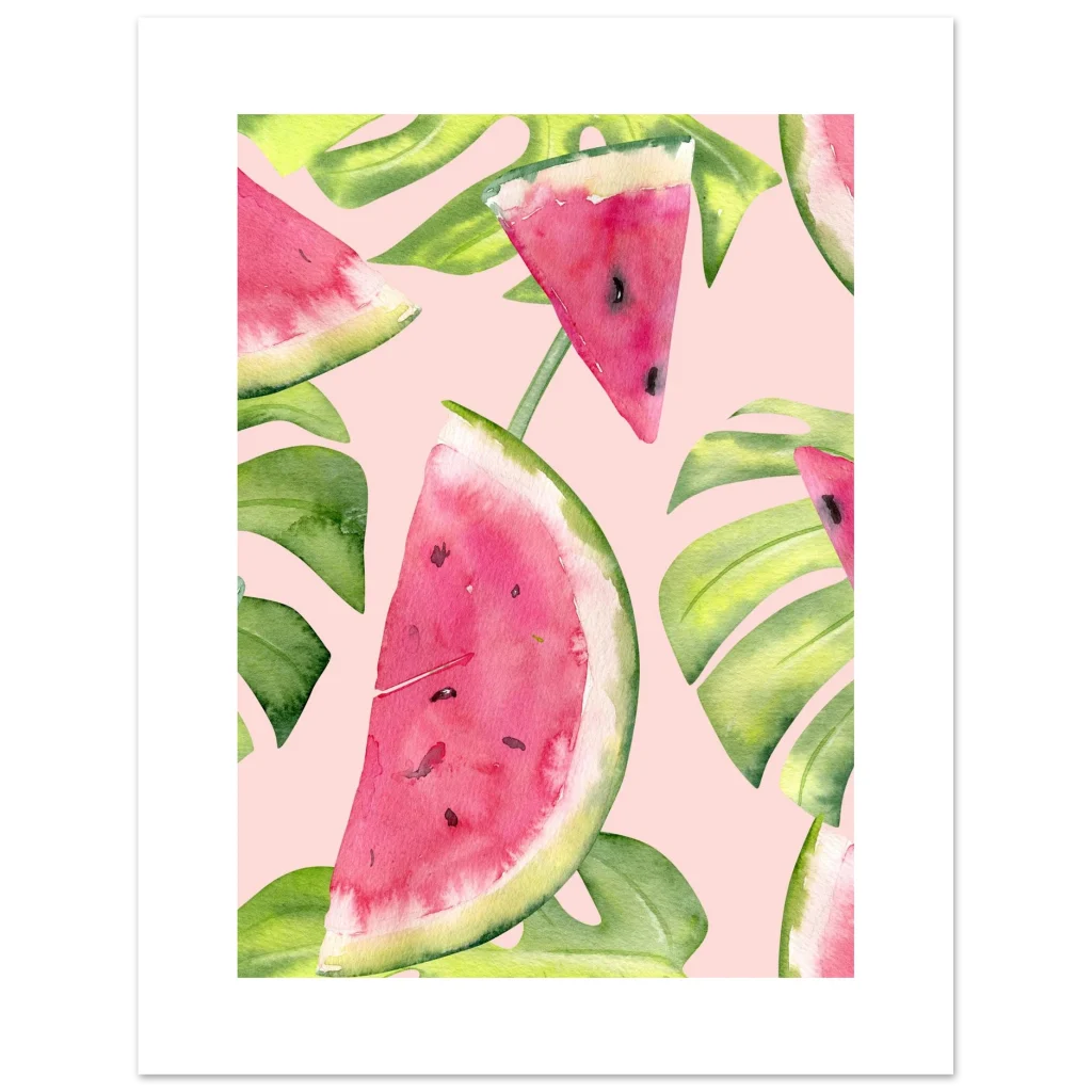 Vibrant Watermelon & Monstera Tropical Watercolor Print Poster