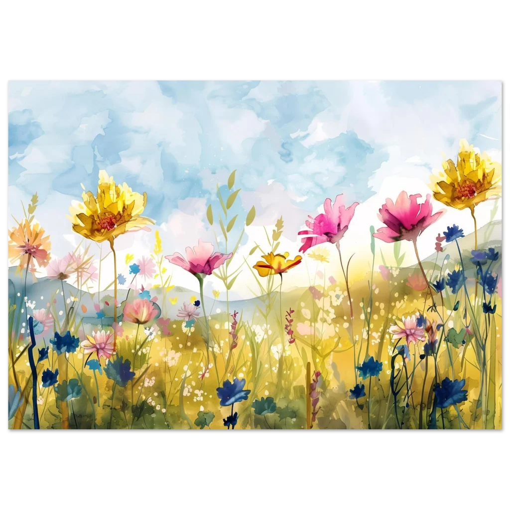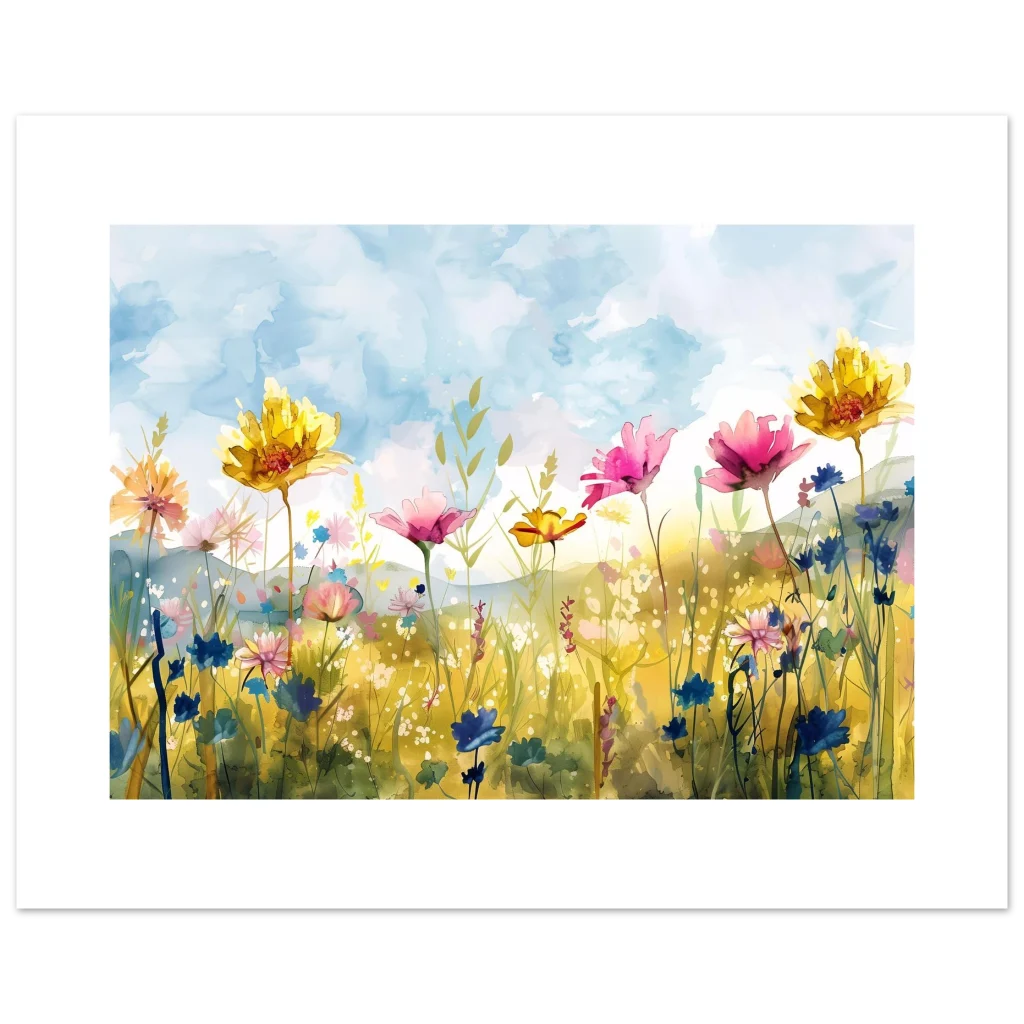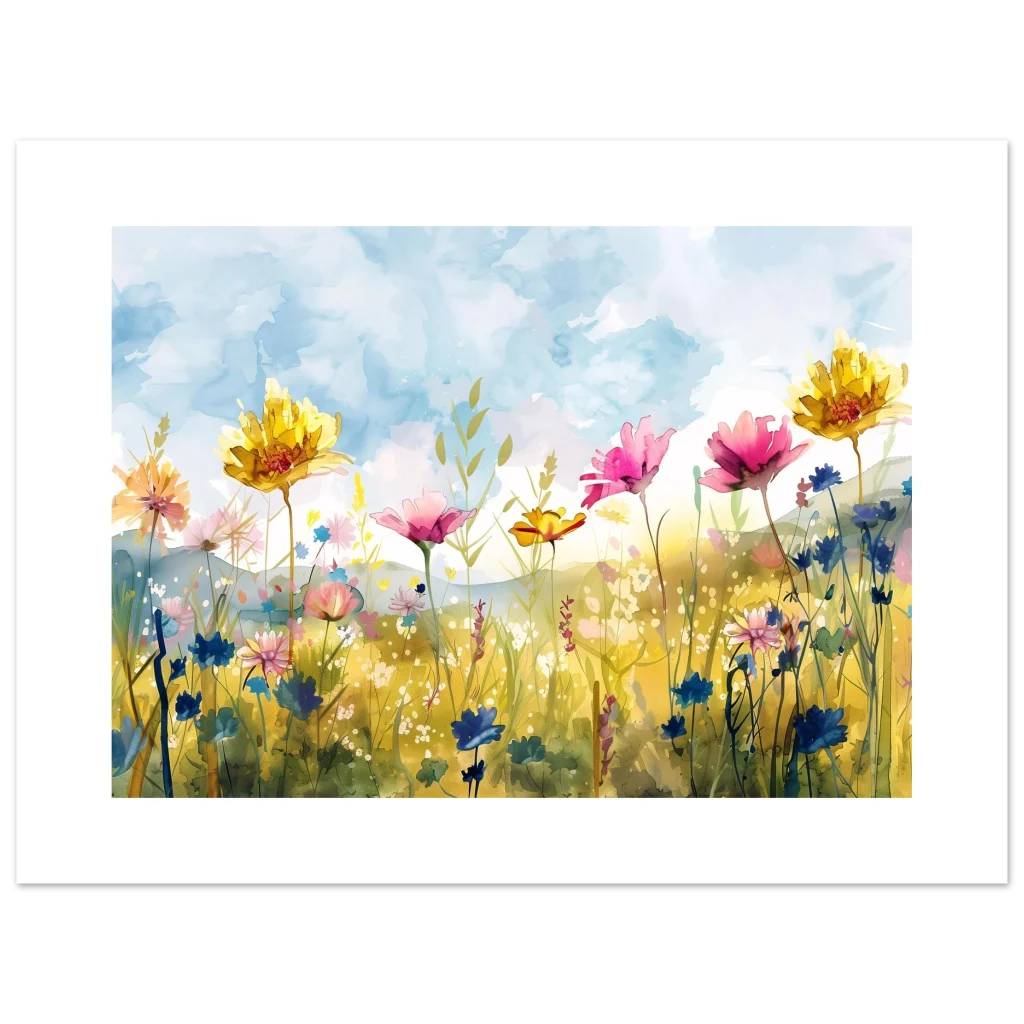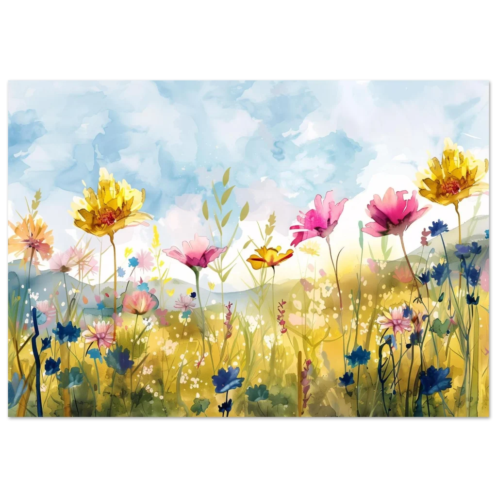 Bring the joyful exuberance of a sun-drenched wildflower meadow into your home with this stunning impressionistic watercolor poster. Its vivid blend of blues, yellows, and pinks, rendered with a light, airy touch, creates a serene yet lively atmosphere, perfect for brightening any space and inviting a sense of natural tranquility. Each brushstroke captures the delicate dance of wildflowers under a clear sky, offering a timeless piece of art that feels both modern and classic.
