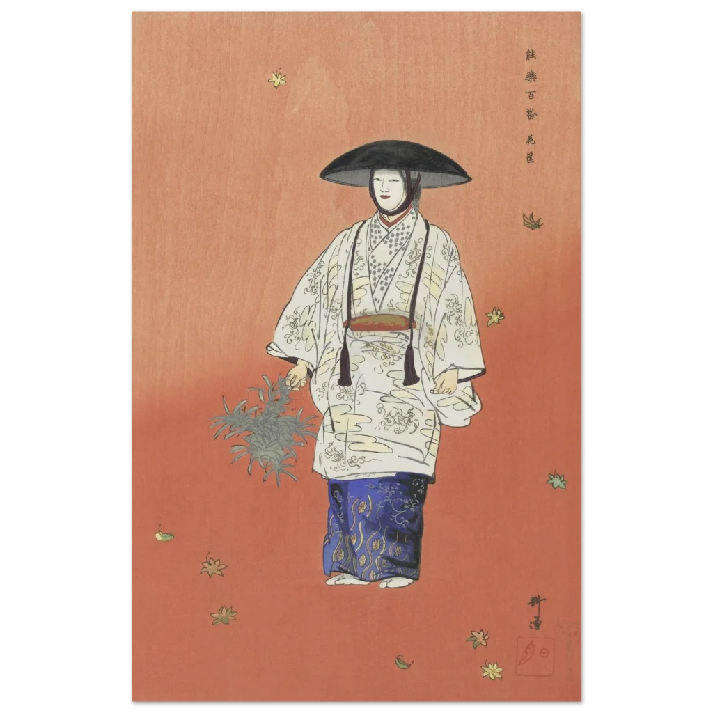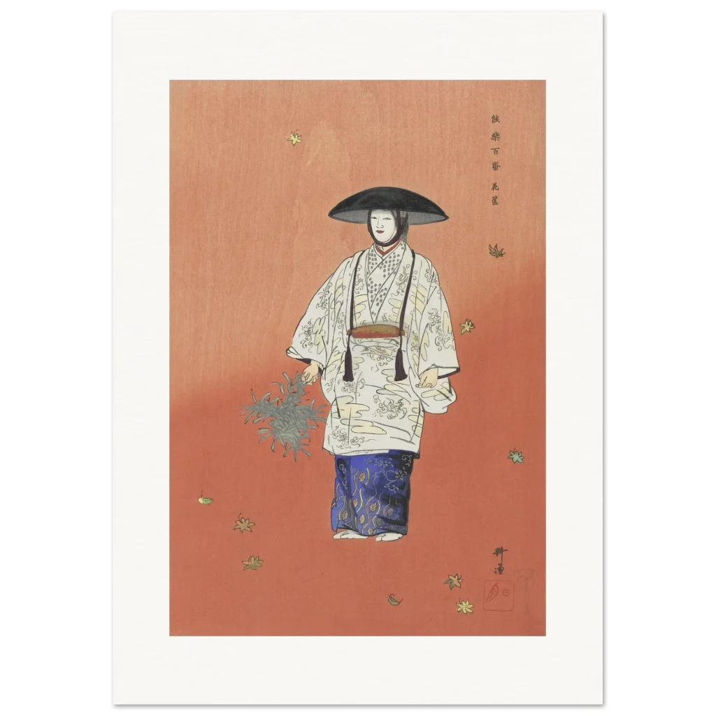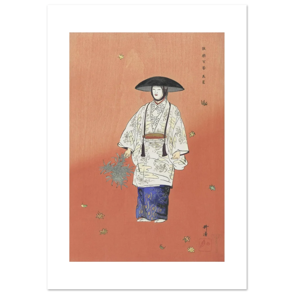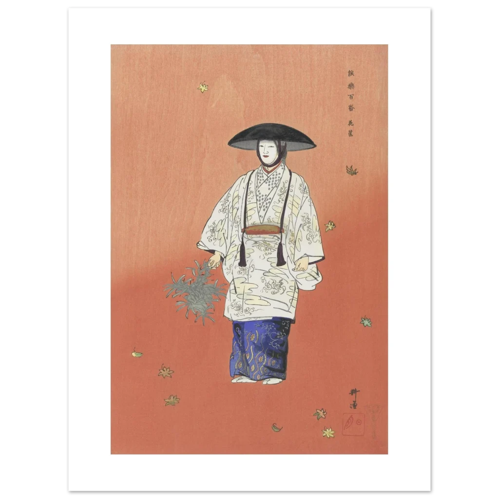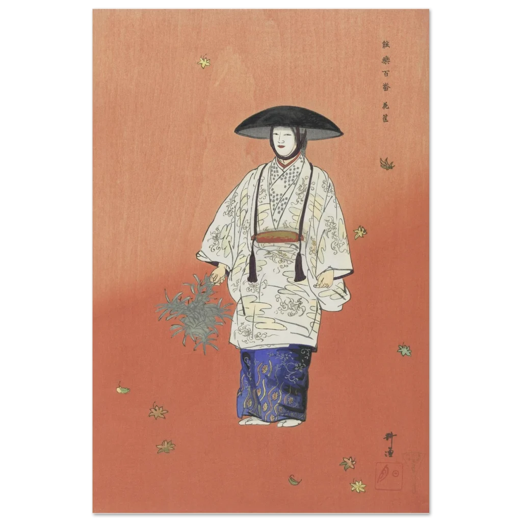 Discover the exquisite beauty of “Hanagatami” (The Flower Basket), a classic Japanese woodblock print by Tsukioka Kogyo. This detailed scene from the “One Hundred Noh Plays” series captures the emotional intensity of Noh theater, featuring Lady Teruhi in a traditional black hat (eboshi) surrounded by falling autumn leaves. A masterpiece of Meiji-era ukiyo-e artistry, perfect for collectors of Japanese culture and theatrical history.
