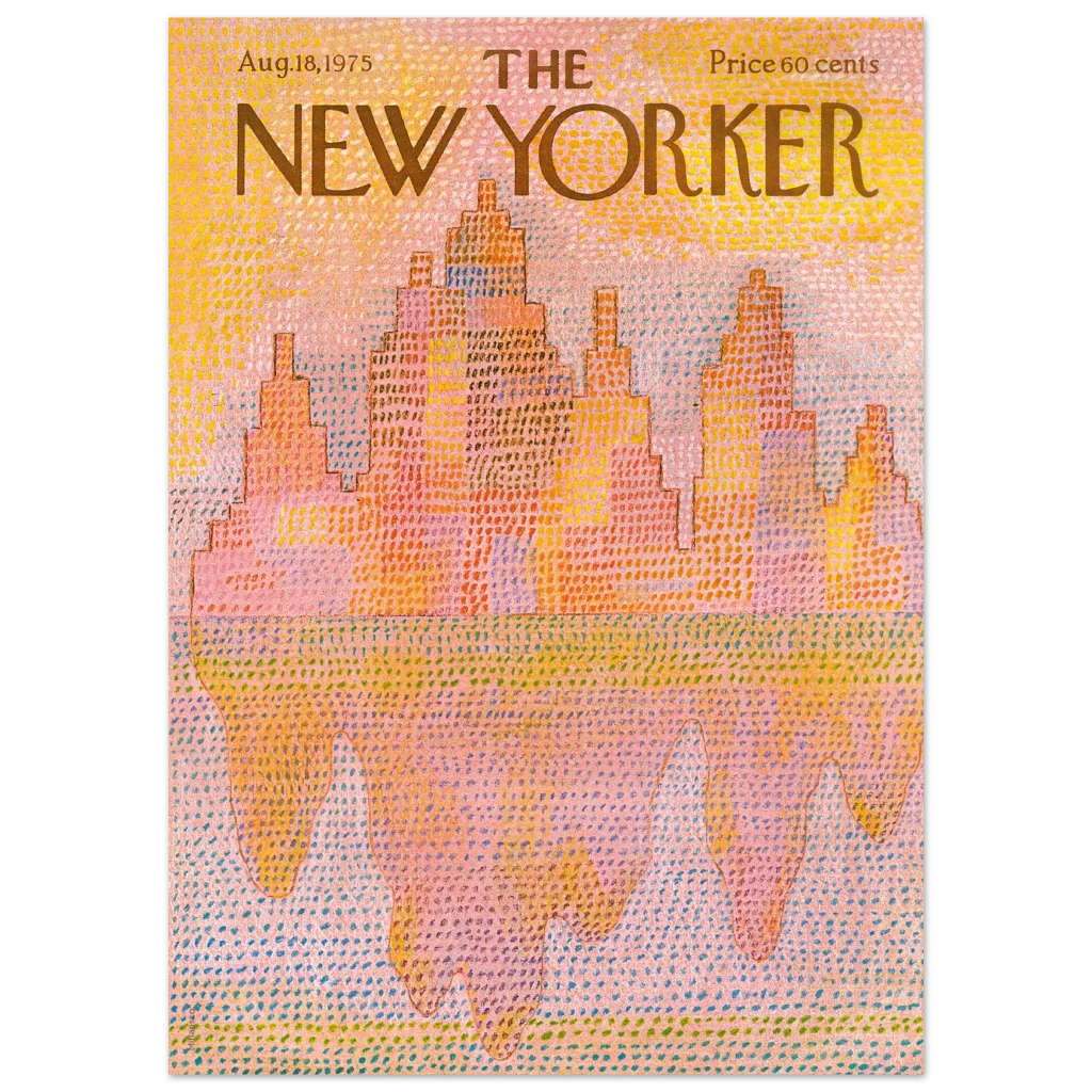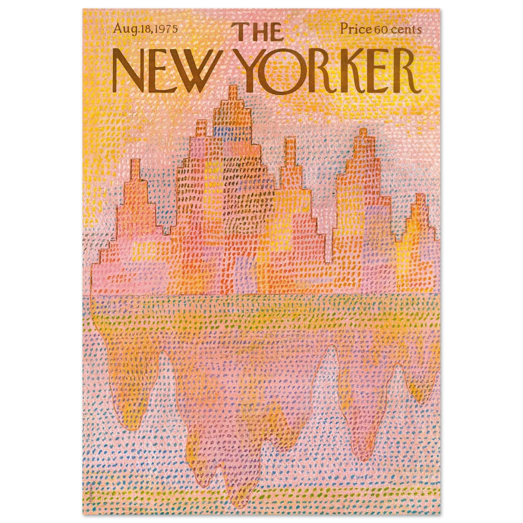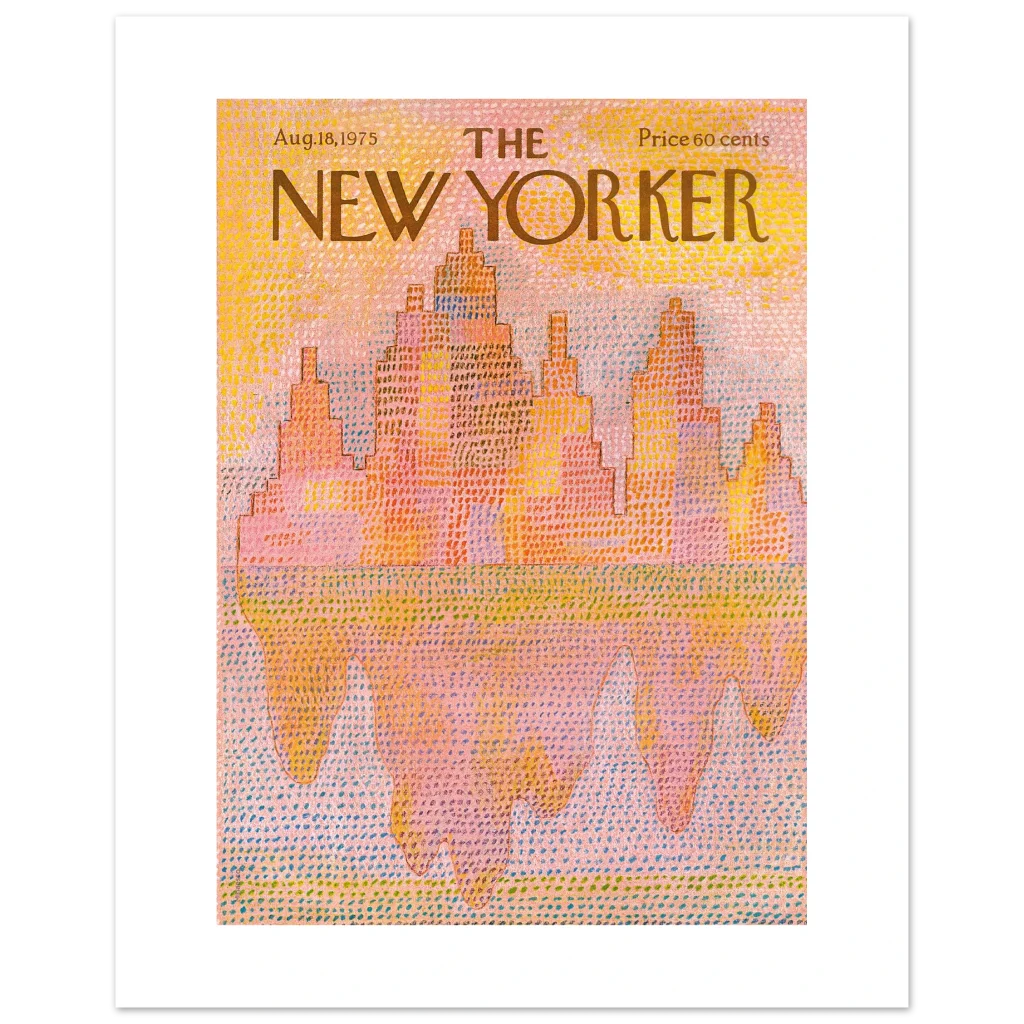 Capture the vibrant energy of a bygone era with this captivating New York City skyline poster, echoing the iconic style of classic magazine covers. The pointillist artistry and warm, optimistic color palette of orange, pink, and yellow dots bring a unique, retro charm to any space, making it an instant conversation starter and a perfect homage to urban elegance.