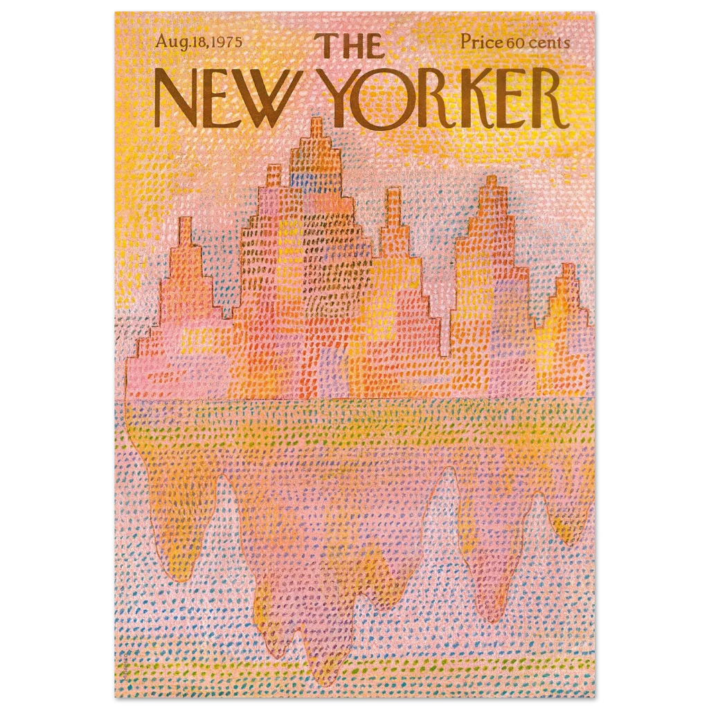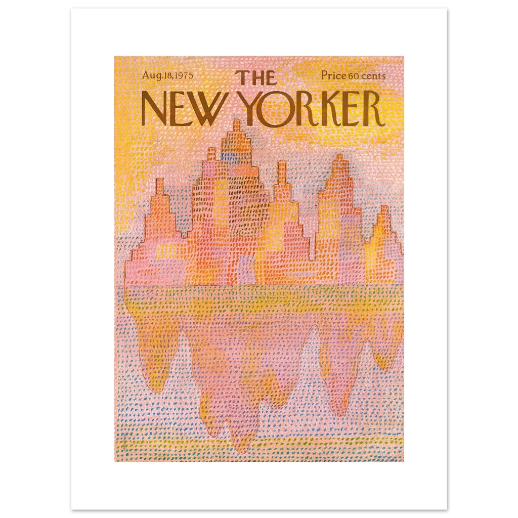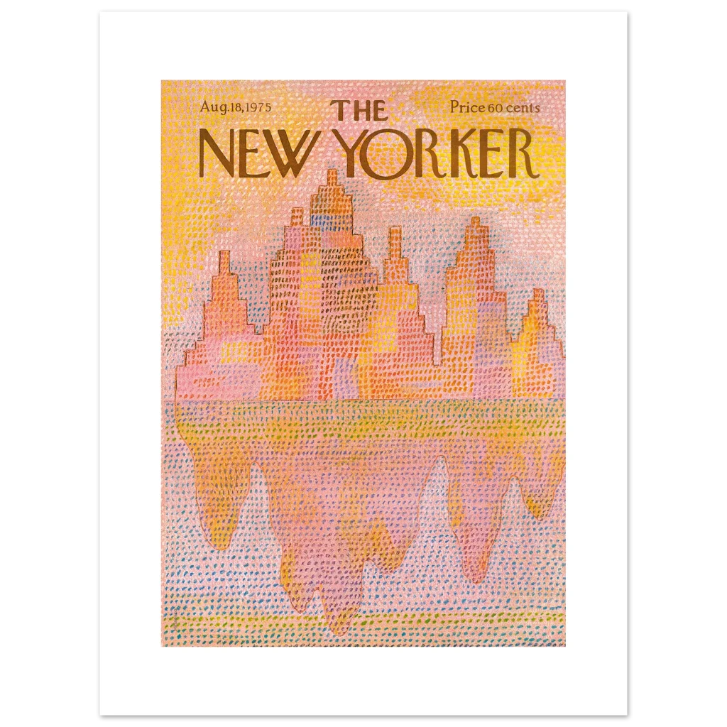 Capture the vibrant energy of a bygone era with this captivating New York City skyline poster, echoing the iconic style of classic magazine covers. The pointillist artistry and warm, optimistic color palette of orange, pink, and yellow dots bring a unique, retro charm to any space, making it an instant conversation starter and a perfect homage to urban elegance.
