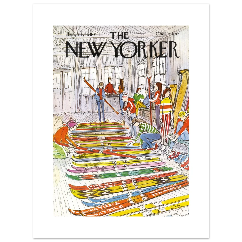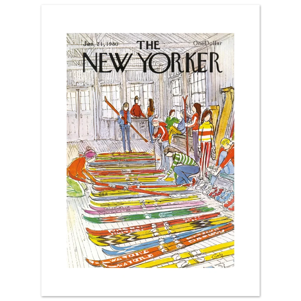 Capture the cozy, vibrant energy of a vintage ski lodge with this iconic New Yorker cover from January 21, 1980. This charming illustration, bursting with a lively primary color palette and a nostalgic, whimsical style, depicts a bustling scene of skiers preparing their gear, evoking the joyful anticipation of a day on the slopes. It’s a perfect piece to bring a touch of retro winter charm and playful spirit to any room, whether you’re a ski enthusiast or simply appreciate classic illustration.
