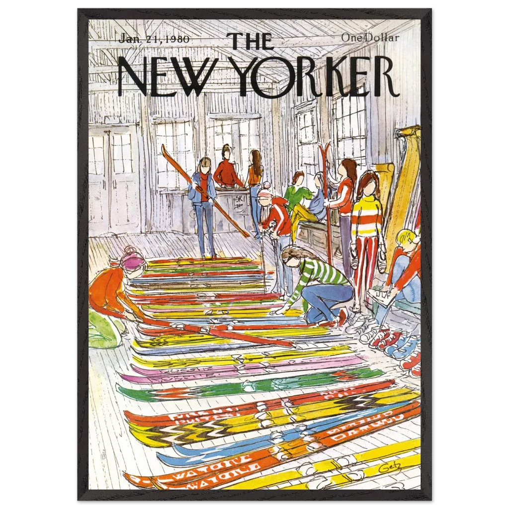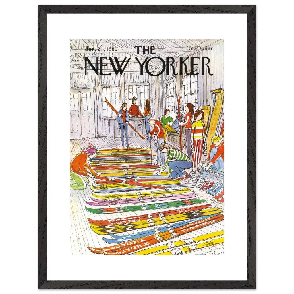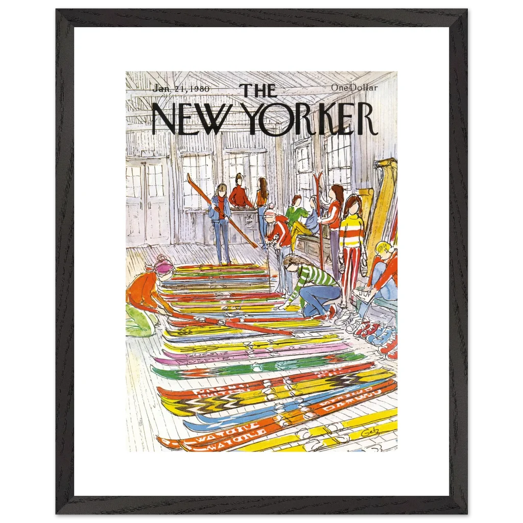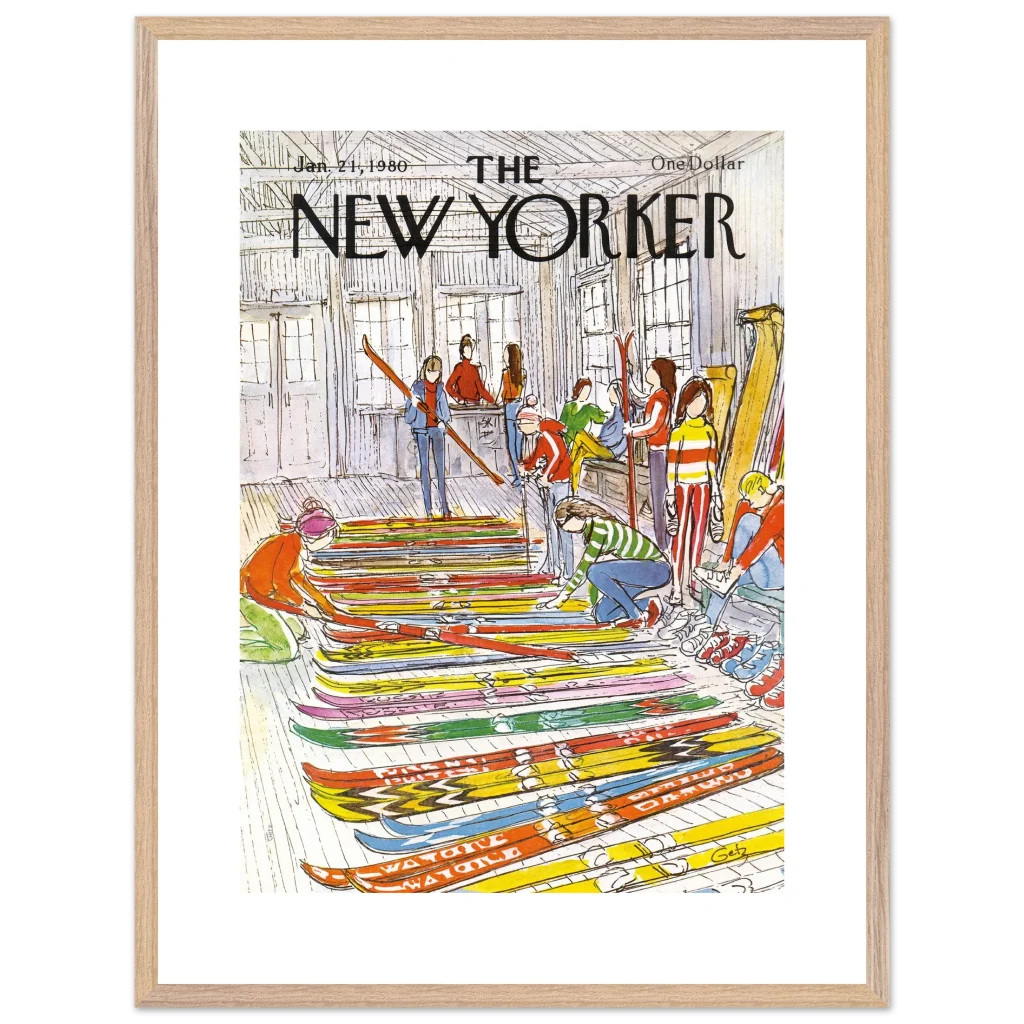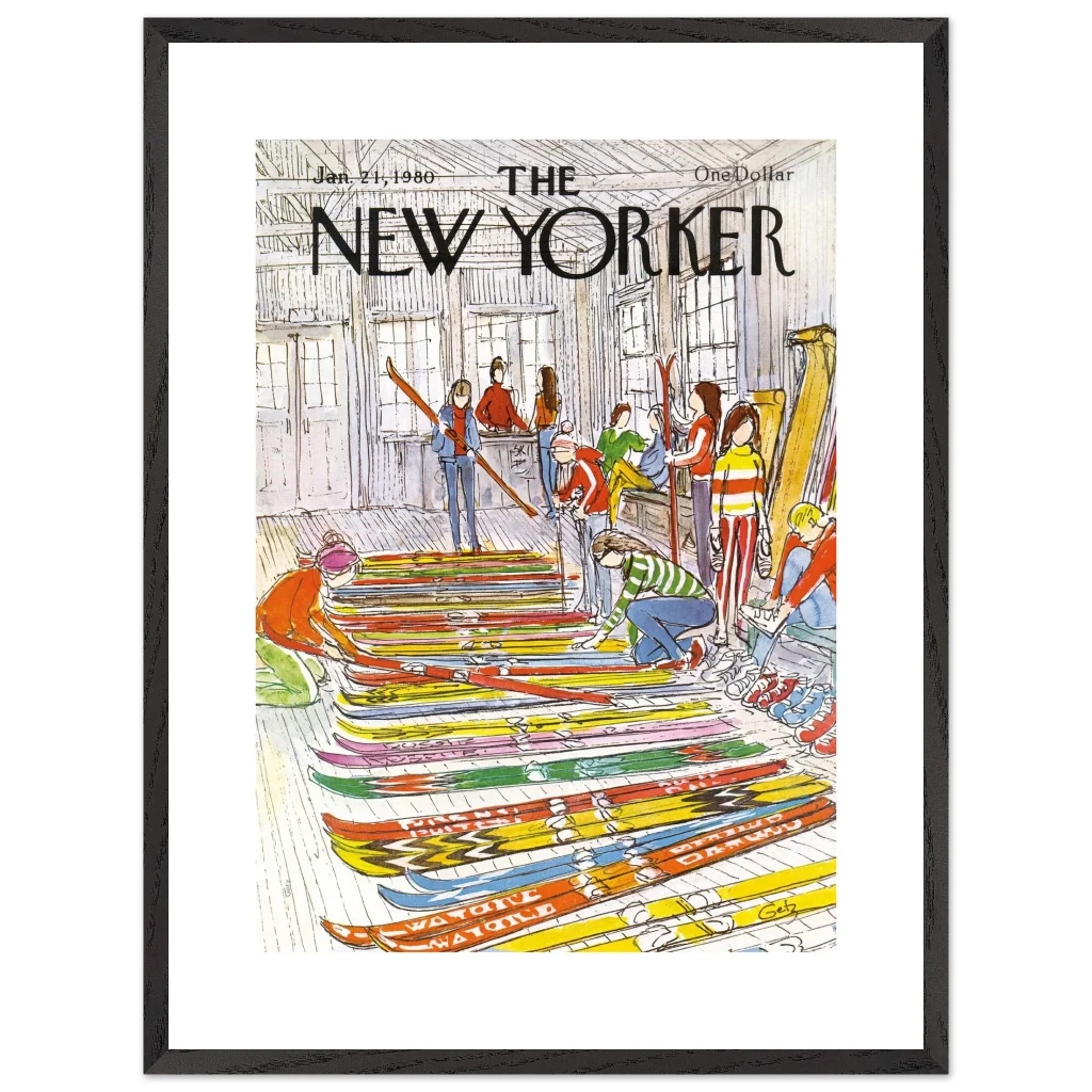 Capture the vibrant energy of a bygone era with our Vintage Ski Scene Poster, featuring the iconic Jan. 21, 1980, New Yorker cover by George Booth. This lively illustration, bursting with colorful skis and bustling figures, evokes the joyful anticipation of a winter getaway. It’s the perfect statement piece for ski enthusiasts and lovers of classic illustration, adding a touch of retro charm and playful sophistication to any room.