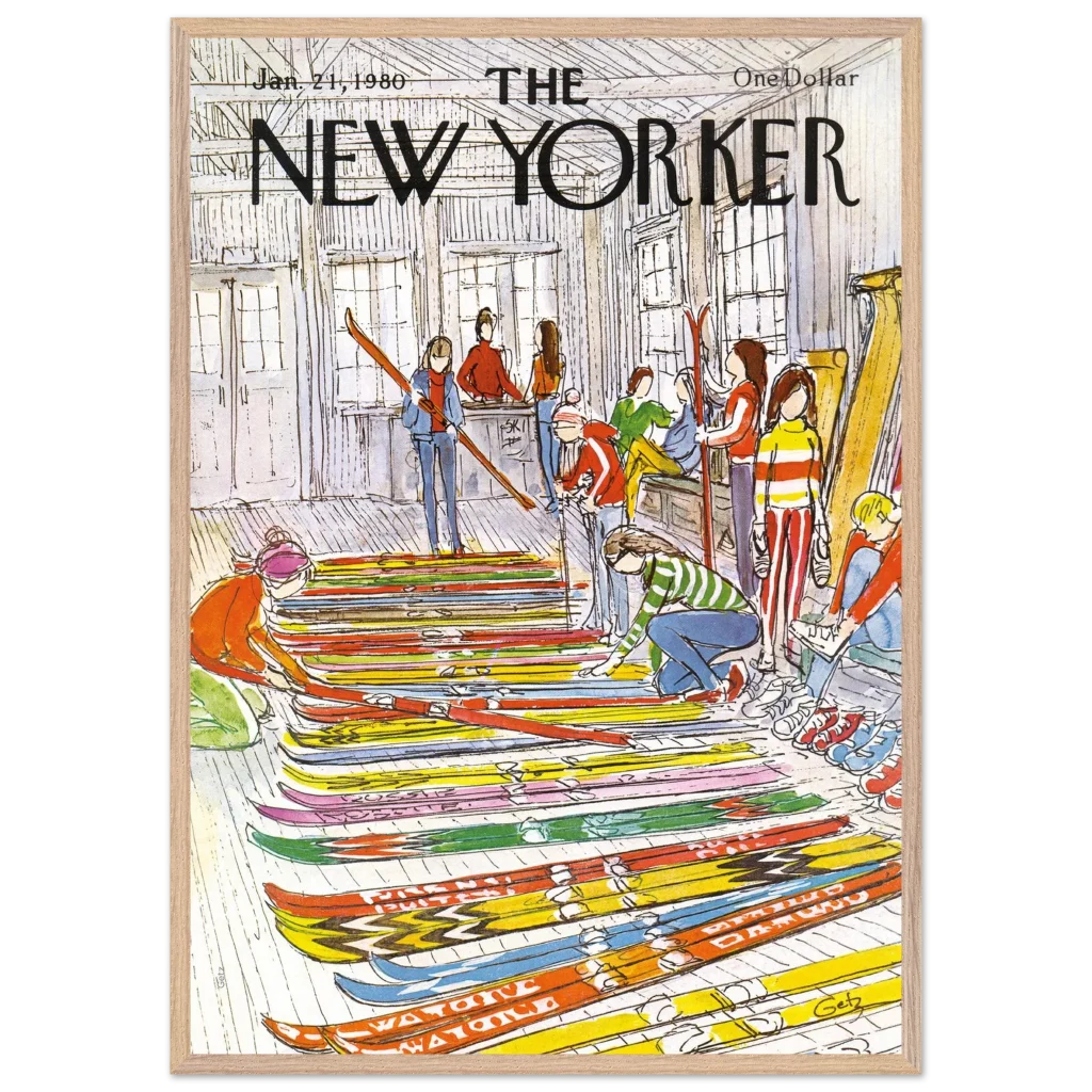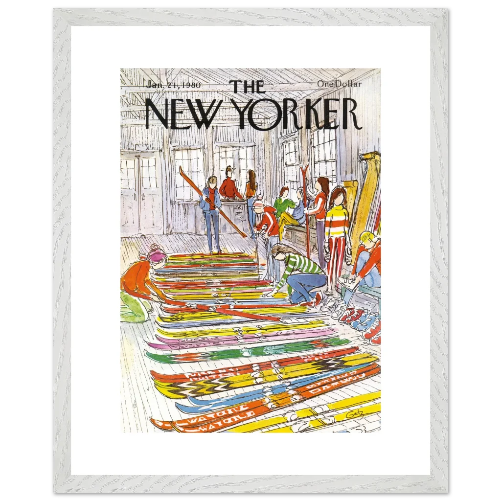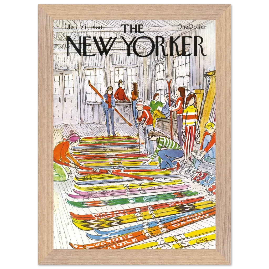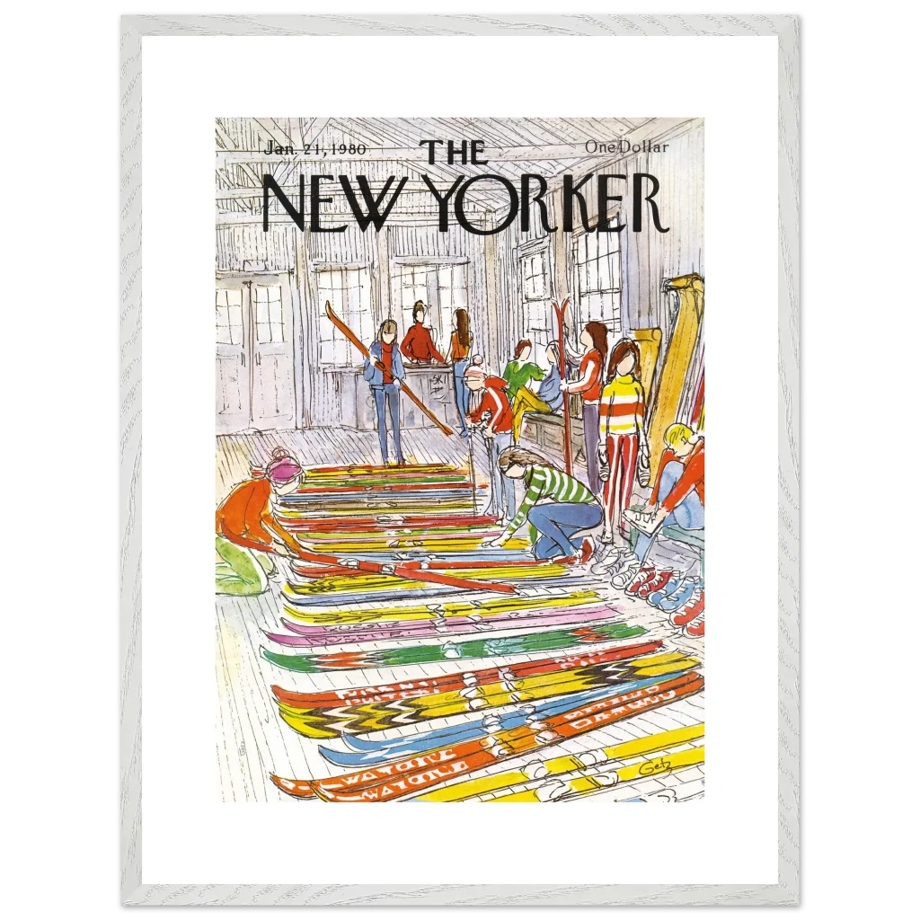 Capture the vibrant energy of a bygone era with our Vintage Ski Scene Poster, featuring the iconic Jan. 21, 1980, New Yorker cover by George Booth. This lively illustration, bursting with colorful skis and bustling figures, evokes the joyful anticipation of a winter getaway. It’s the perfect statement piece for ski enthusiasts and lovers of classic illustration, adding a touch of retro charm and playful sophistication to any room.