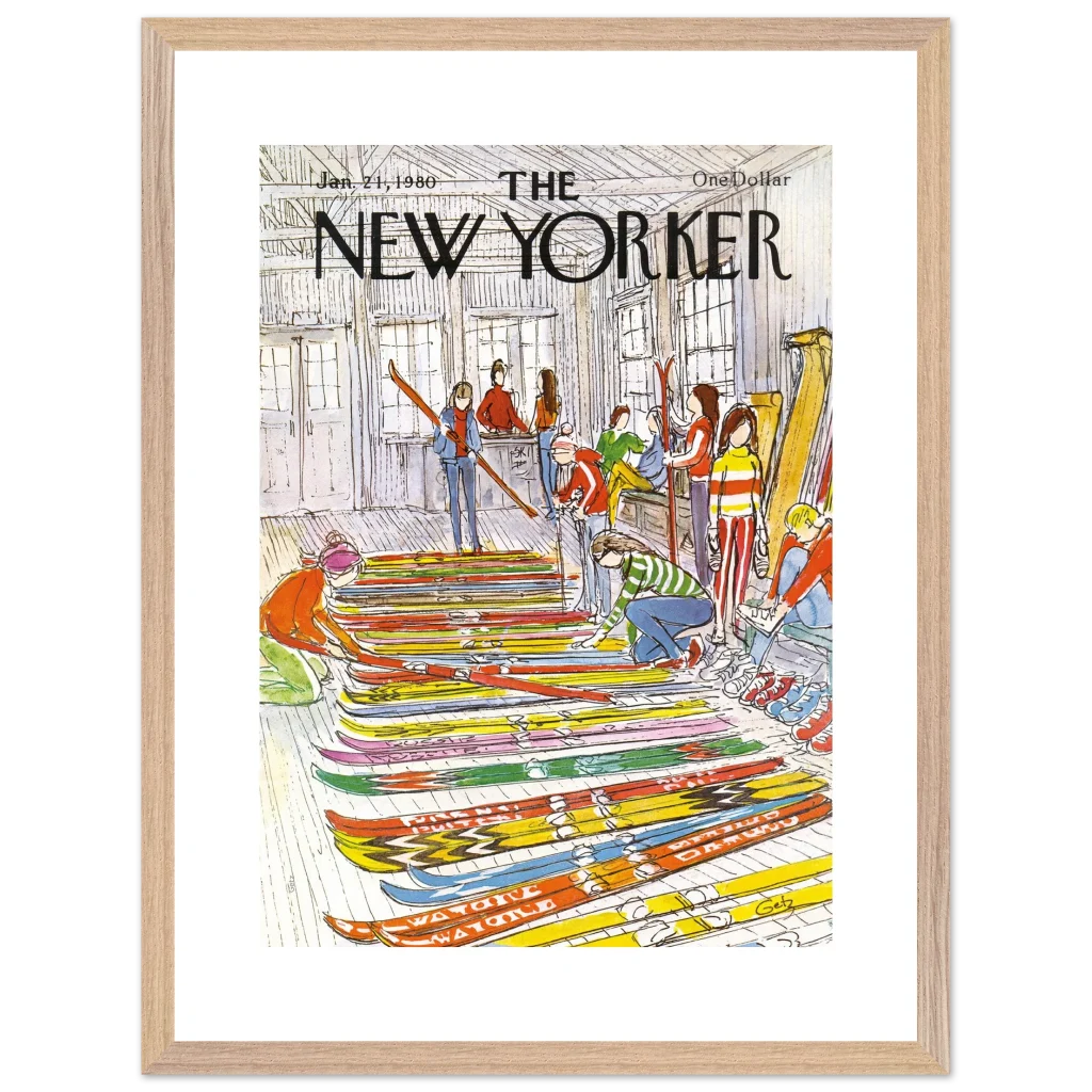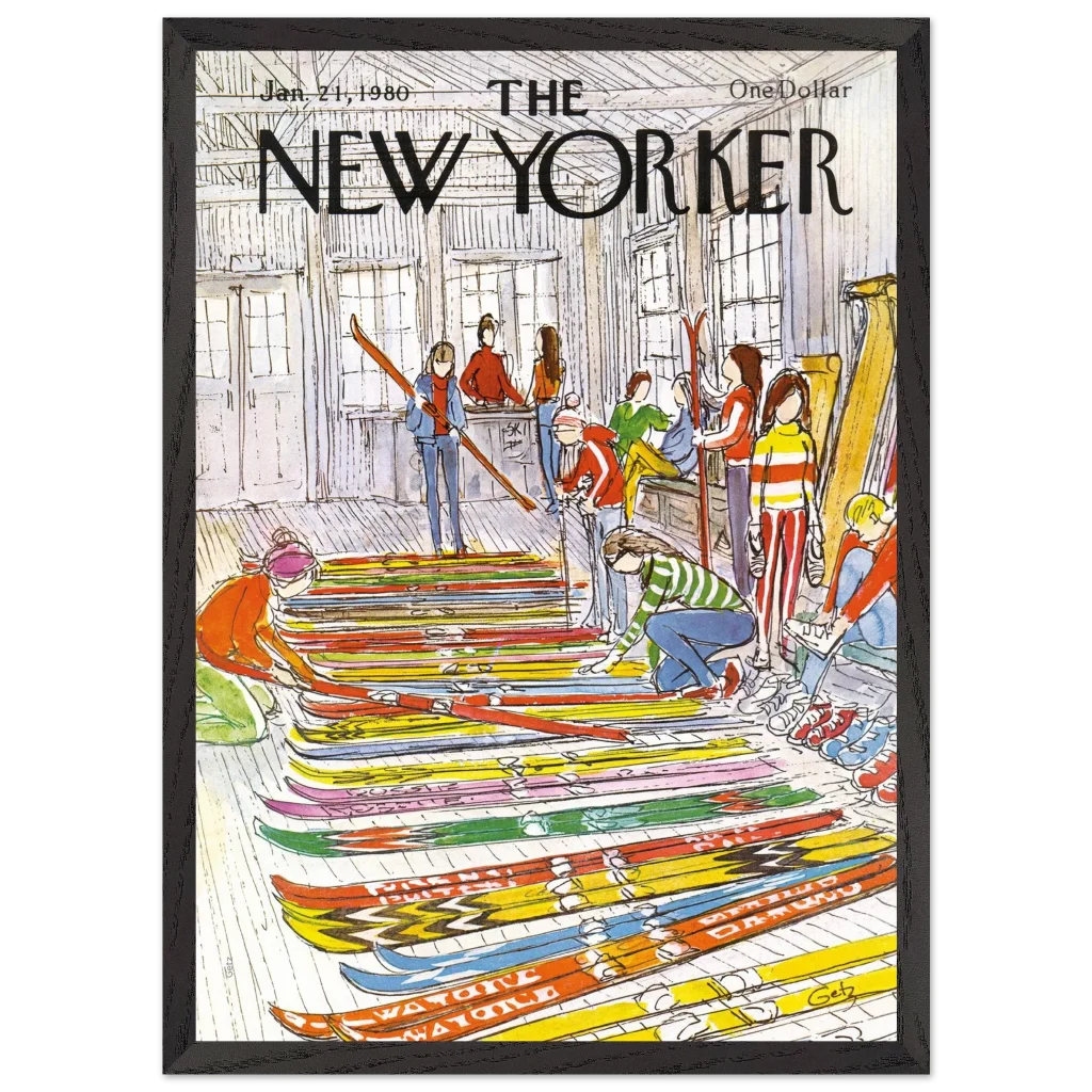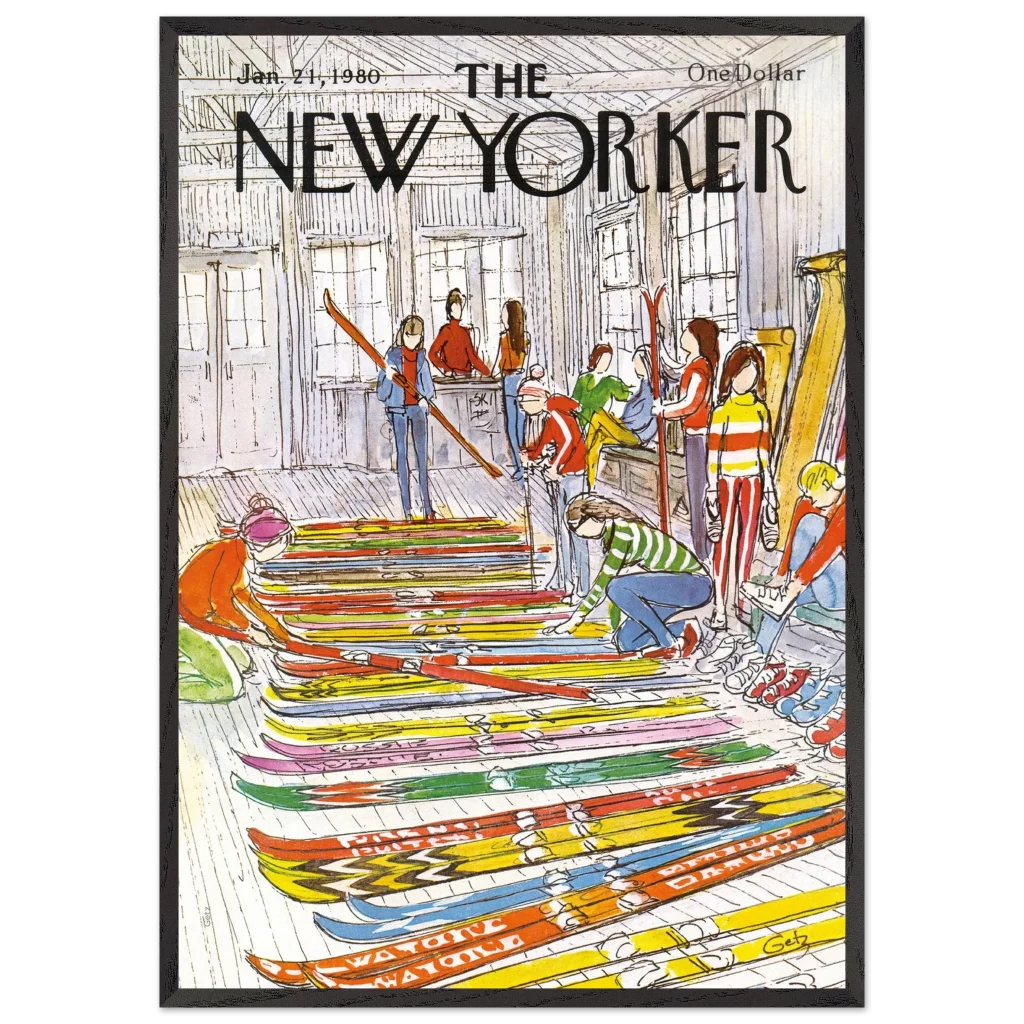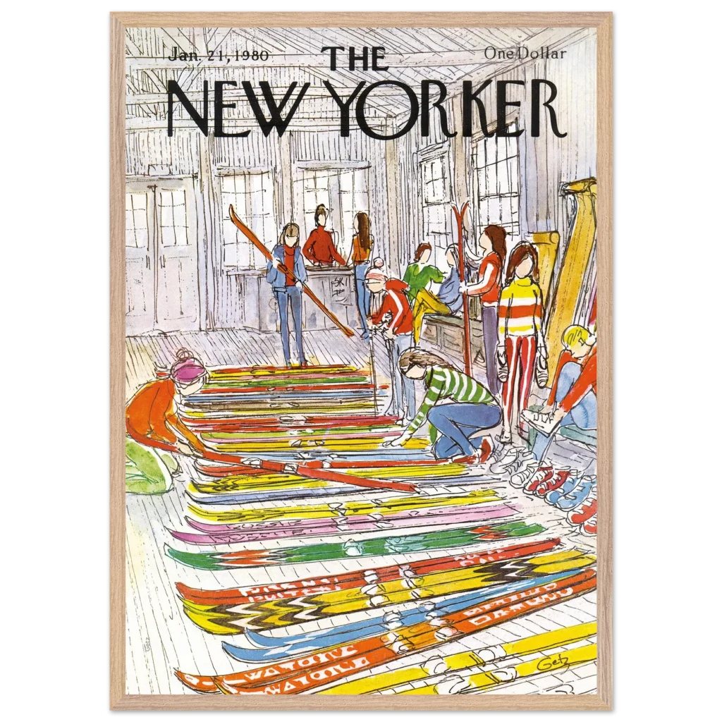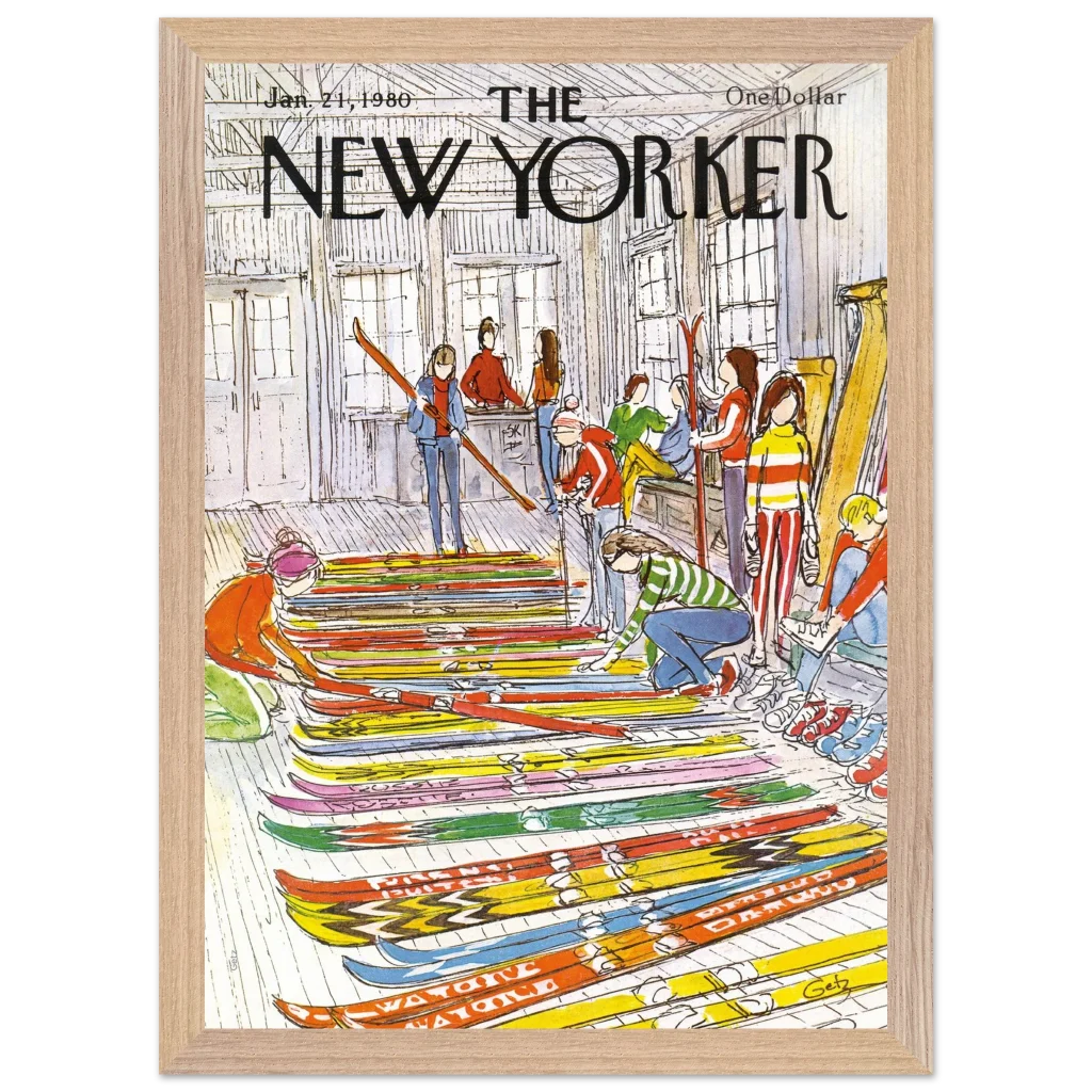 Capture the vibrant energy of a bygone era with our Vintage Ski Scene Poster, featuring the iconic Jan. 21, 1980, New Yorker cover by George Booth. This lively illustration, bursting with colorful skis and bustling figures, evokes the joyful anticipation of a winter getaway. It’s the perfect statement piece for ski enthusiasts and lovers of classic illustration, adding a touch of retro charm and playful sophistication to any room.