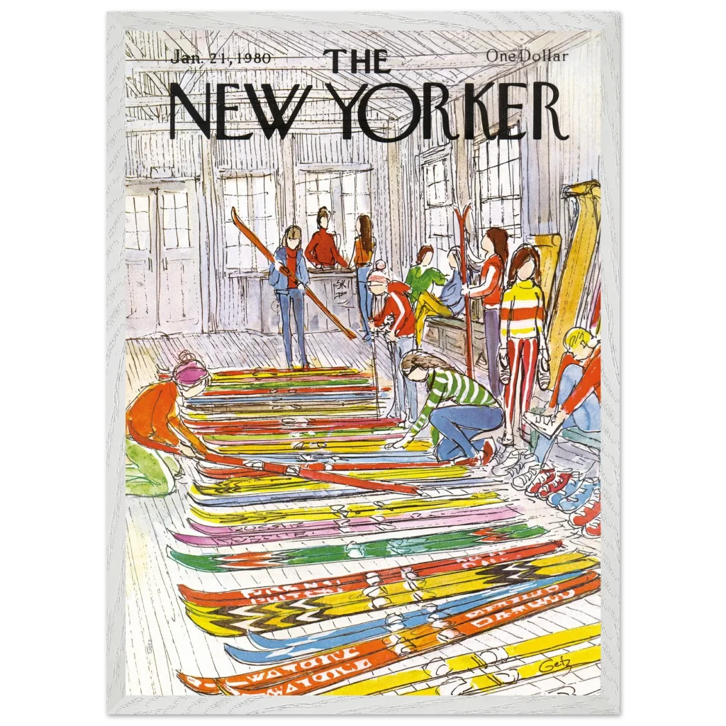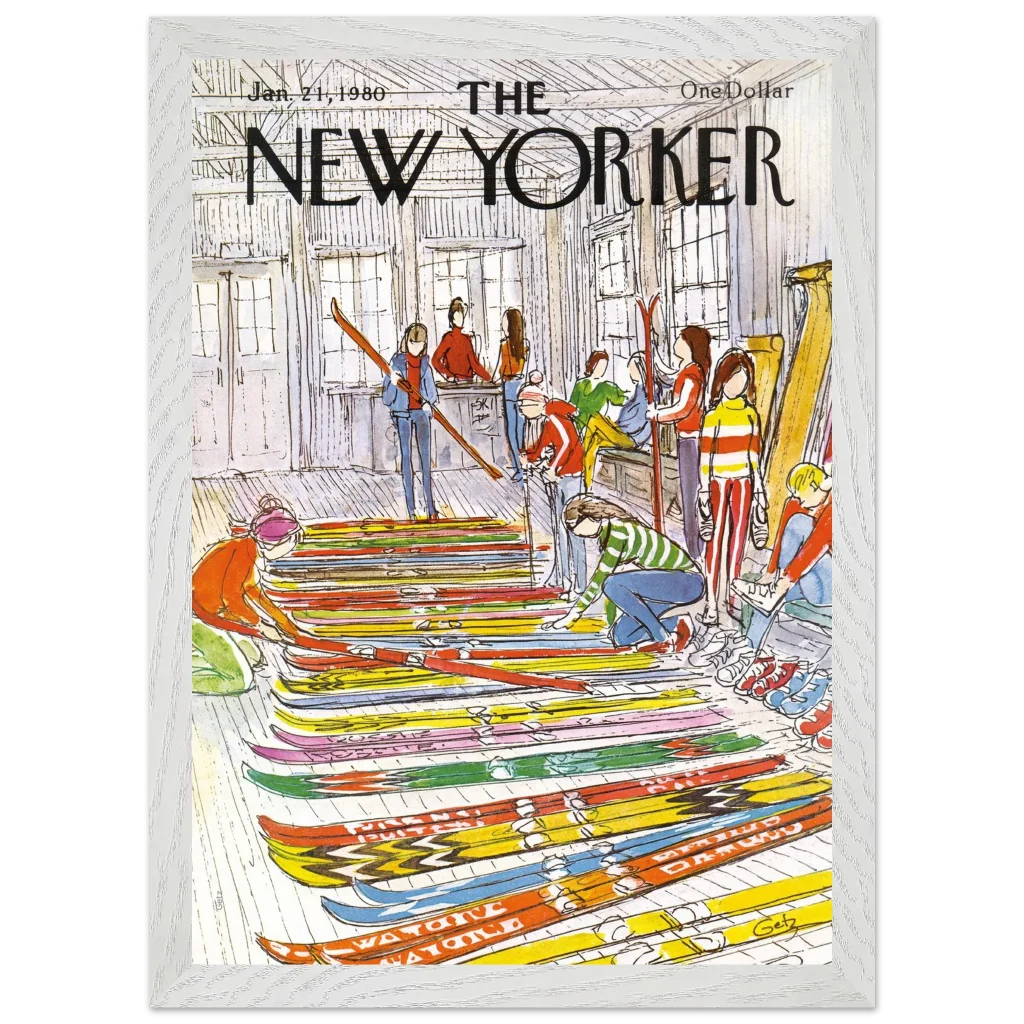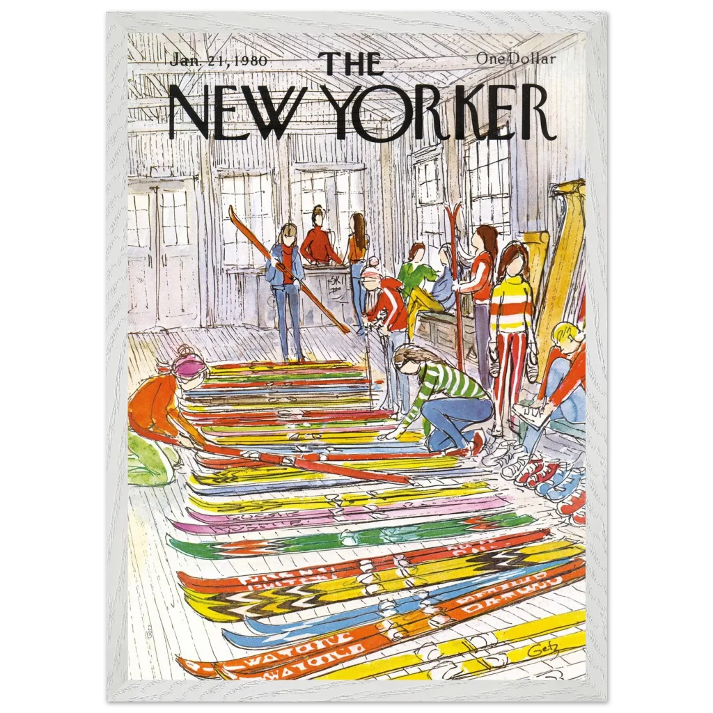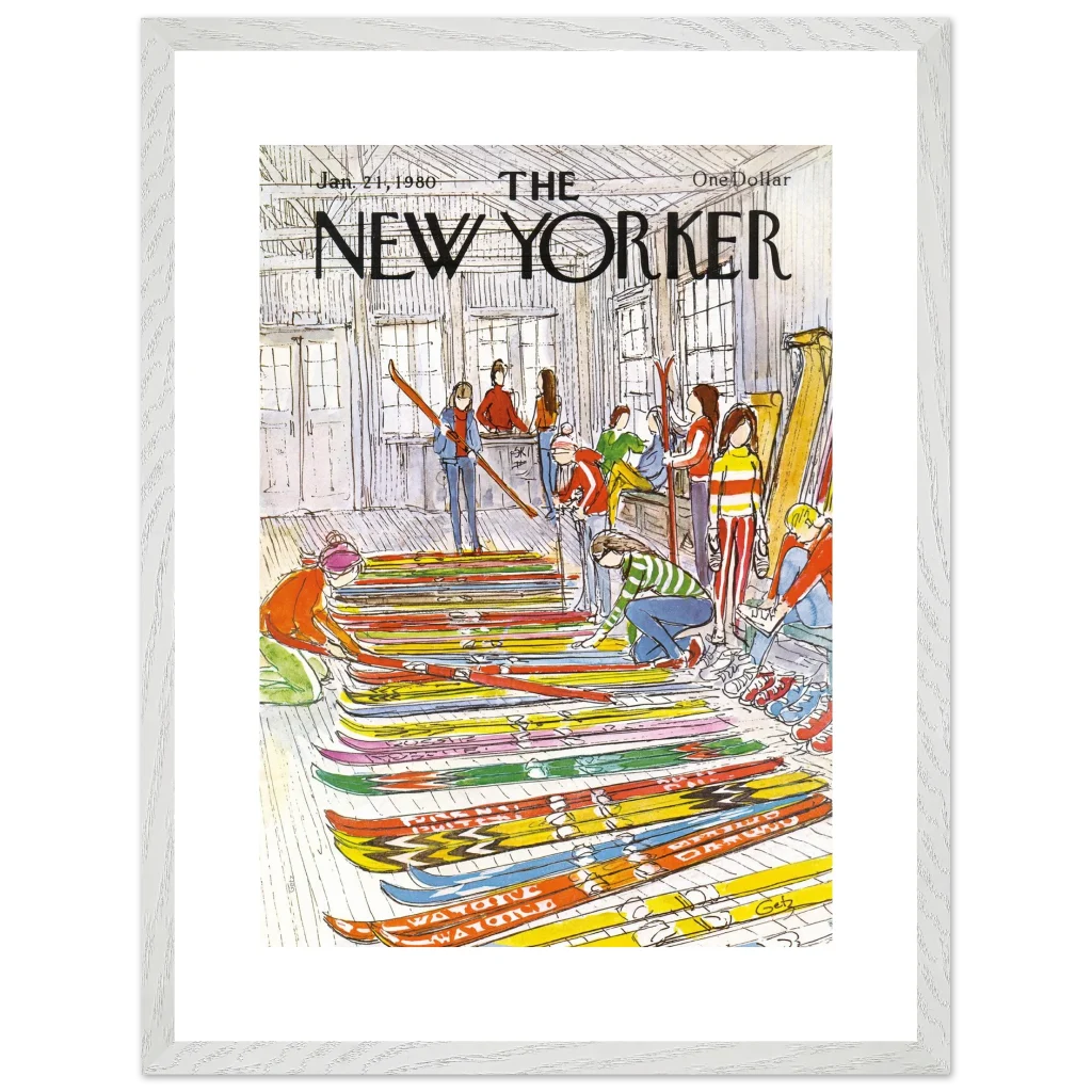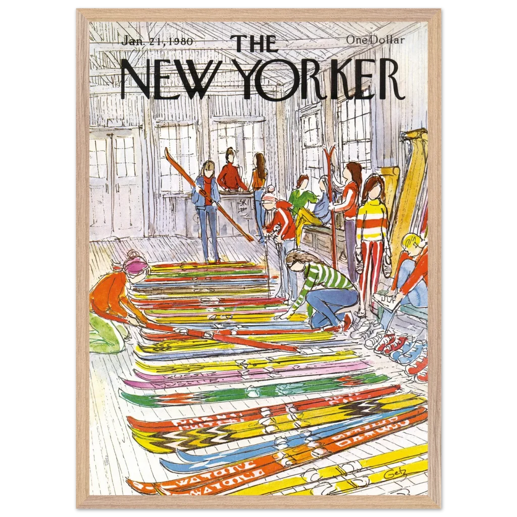 Capture the vibrant energy of a bygone era with our Vintage Ski Scene Poster, featuring the iconic Jan. 21, 1980, New Yorker cover by George Booth. This lively illustration, bursting with colorful skis and bustling figures, evokes the joyful anticipation of a winter getaway. It’s the perfect statement piece for ski enthusiasts and lovers of classic illustration, adding a touch of retro charm and playful sophistication to any room.