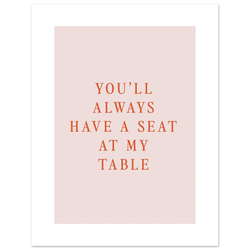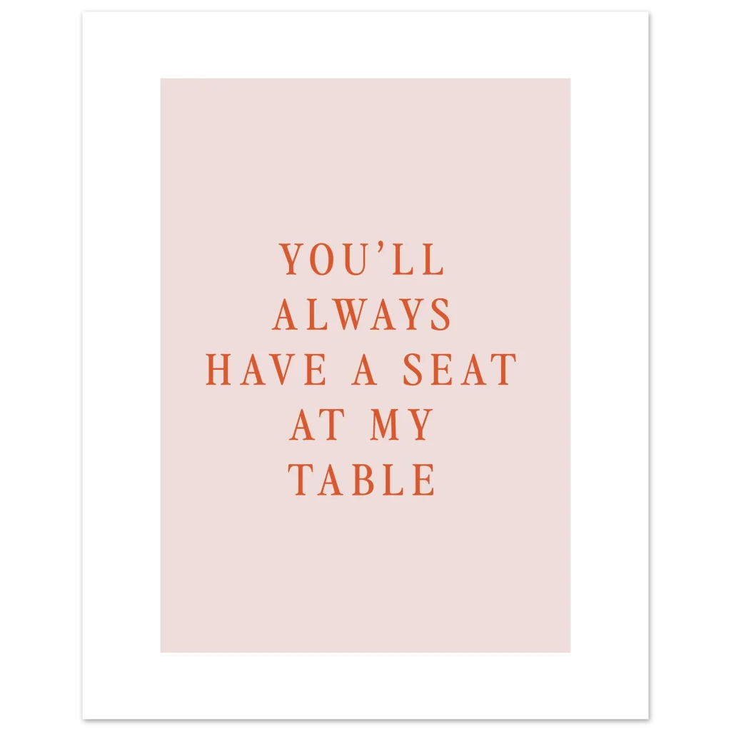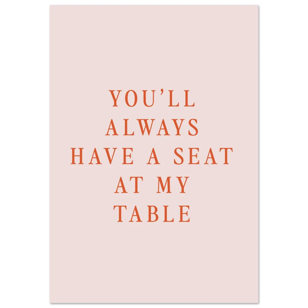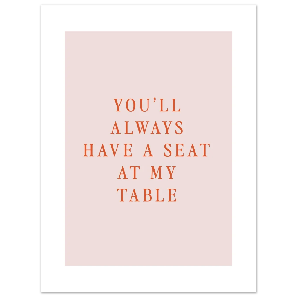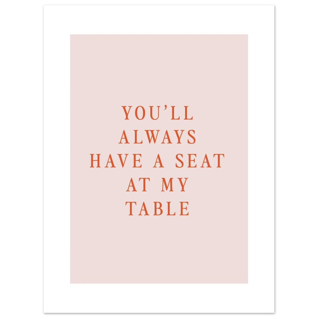 Embrace the spirit of hospitality and heartfelt connection with our ‘You’ll Always Have A Seat At My Table’ poster. This beautiful piece, featuring warm burnt orange typography against a soft, blush pink background, creates an inviting atmosphere in any room. It’s more than just decor; it’s a gentle reminder of belonging, perfect for your dining room, kitchen, or a thoughtful gift for someone special.