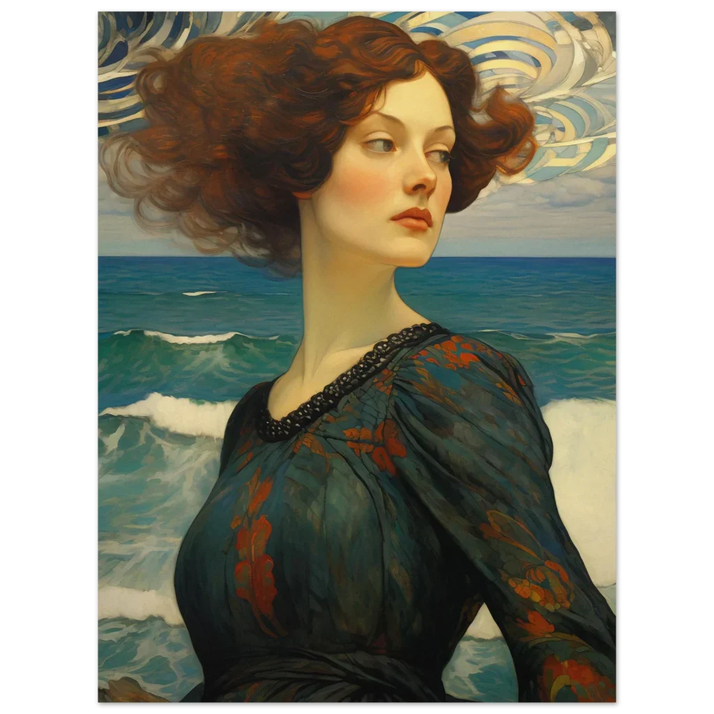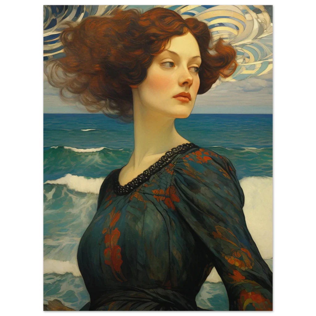 Immerse yourself in the captivating allure of our ‘Whispers of the Sea’ premium matte paper poster, featuring a stunning Art Nouveau-inspired portrait. This exquisite artwork, with its rich teal and deep orange palette, evokes a sense of timeless elegance and mysterious beauty, perfect for transforming any space into a gallery of evocative art.