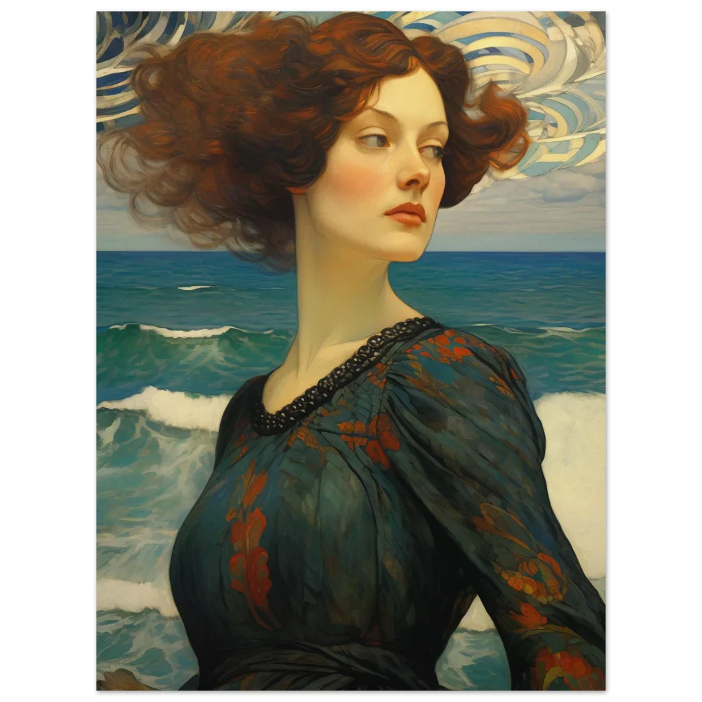 Whispers of the Sea Premium Matte Paper Poster – Romantic Art Nouveau Woman with Fiery Hair
