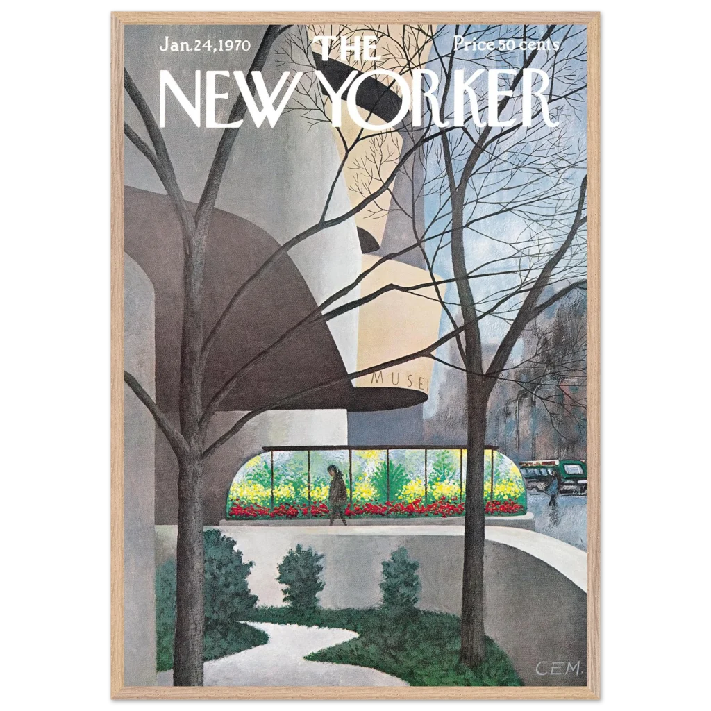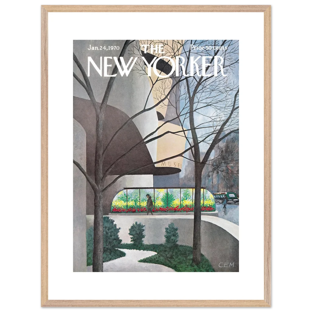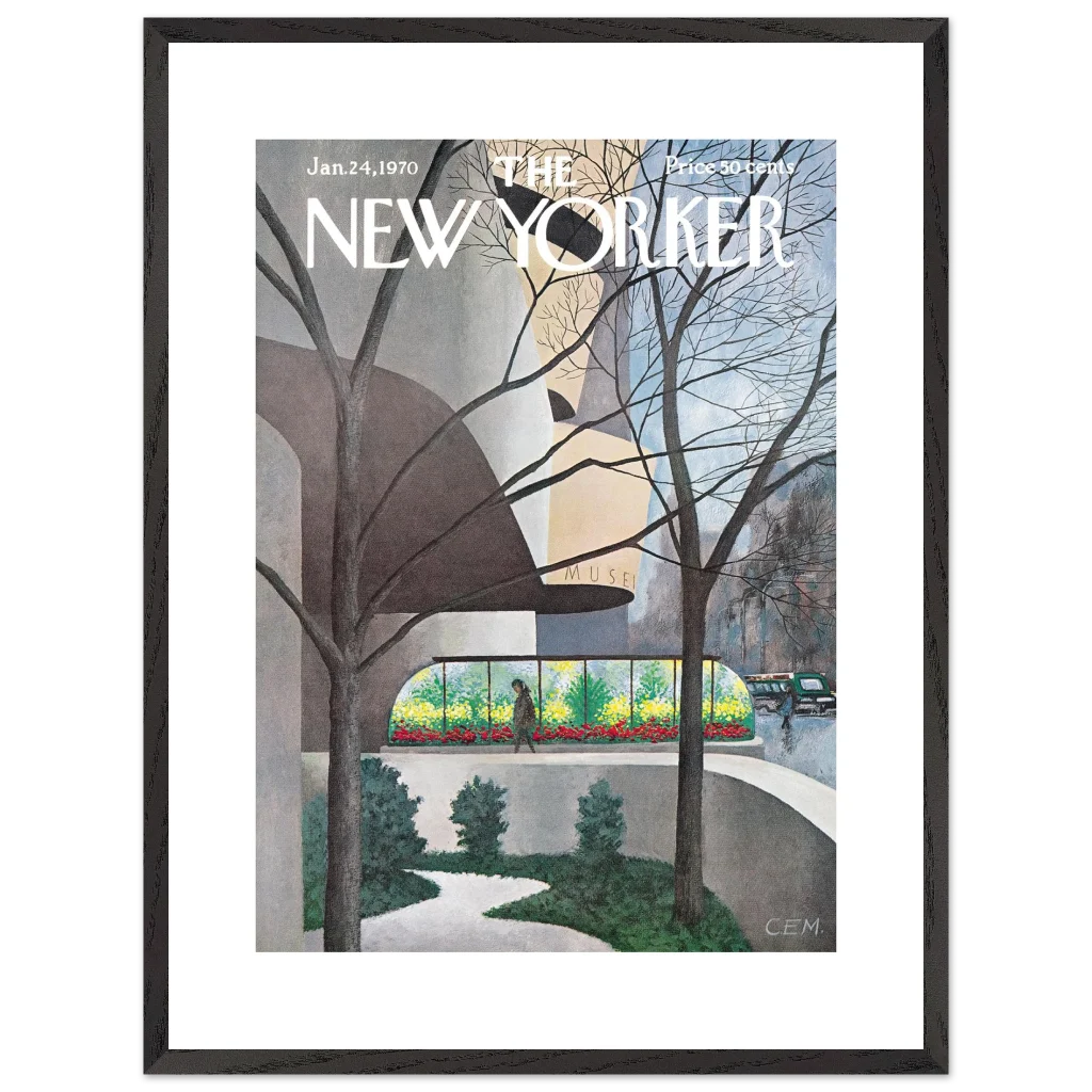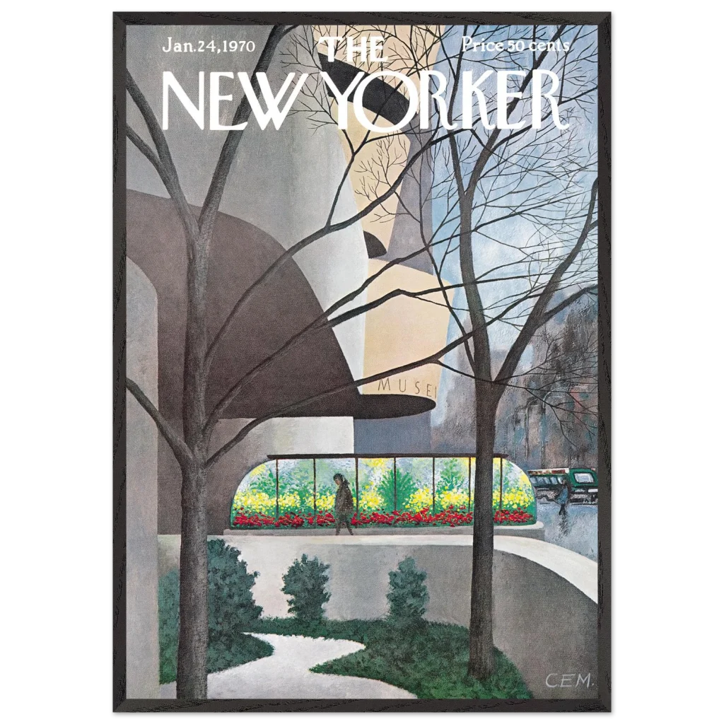 Capture the quiet elegance of a bygone era with our ‘Winter Garden Serenity’ framed poster, a timeless piece inspired by classic New Yorker covers. This captivating illustration evokes a crisp winter day, where a lone figure strolls past a vibrant indoor garden, offering a beautiful contrast of stark urban lines and blooming life. It’s the perfect accent for art lovers seeking a touch of nostalgic charm and sophisticated artistry for their living space or office.