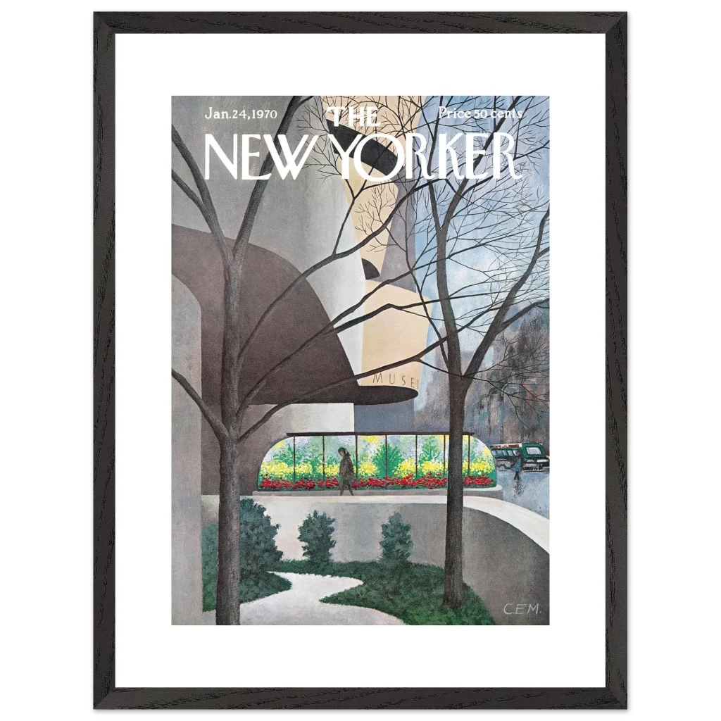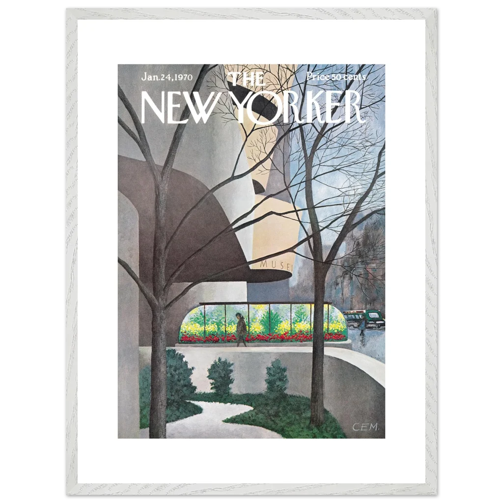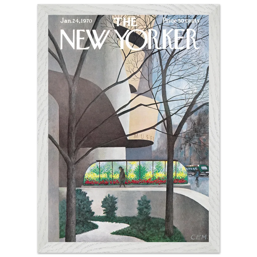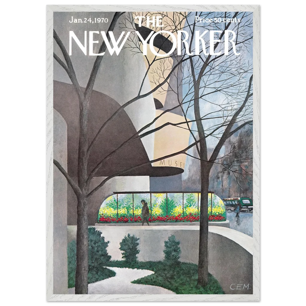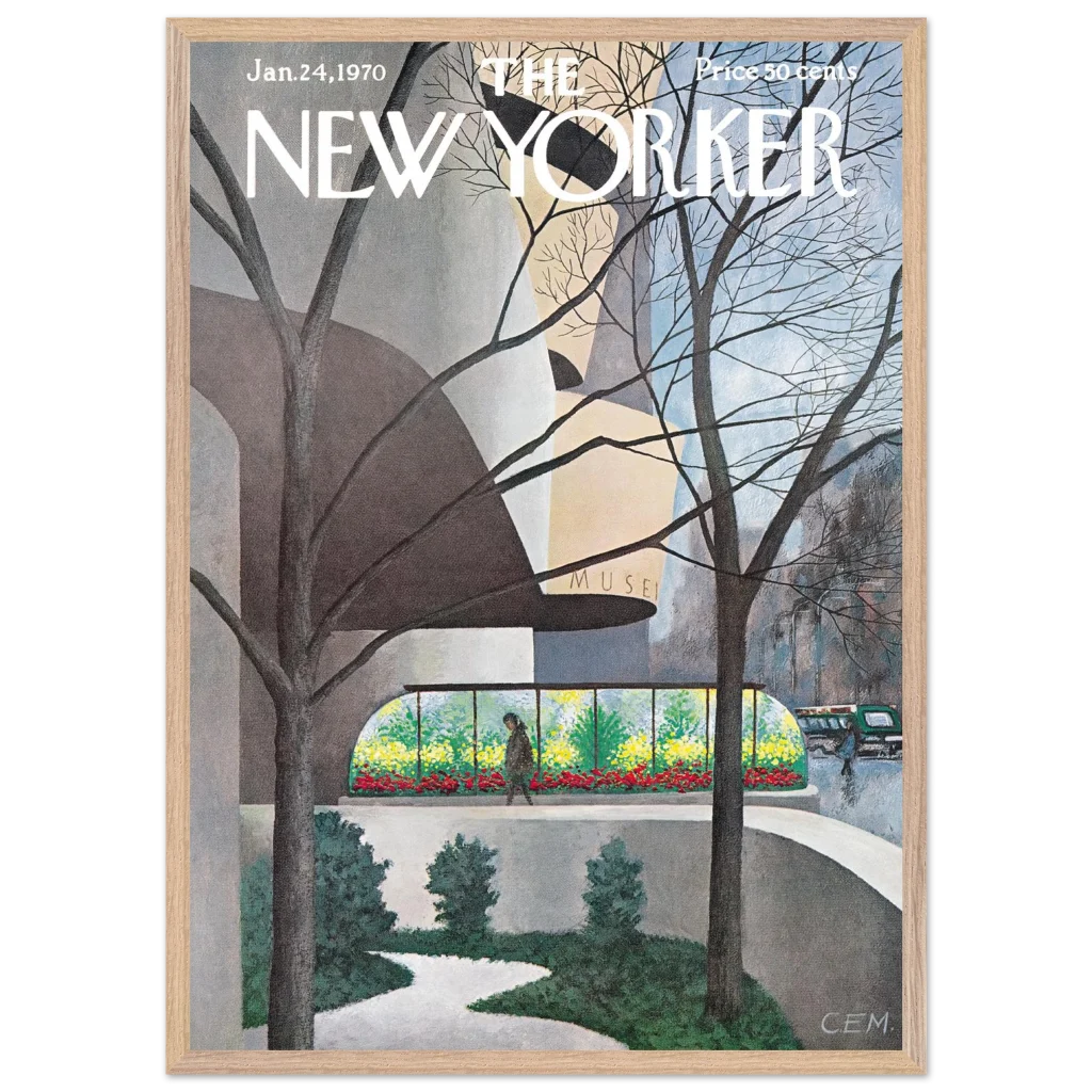 Capture the quiet elegance of a bygone era with our ‘Winter Garden Serenity’ framed poster, a timeless piece inspired by classic New Yorker covers. This captivating illustration evokes a crisp winter day, where a lone figure strolls past a vibrant indoor garden, offering a beautiful contrast of stark urban lines and blooming life. It’s the perfect accent for art lovers seeking a touch of nostalgic charm and sophisticated artistry for their living space or office.