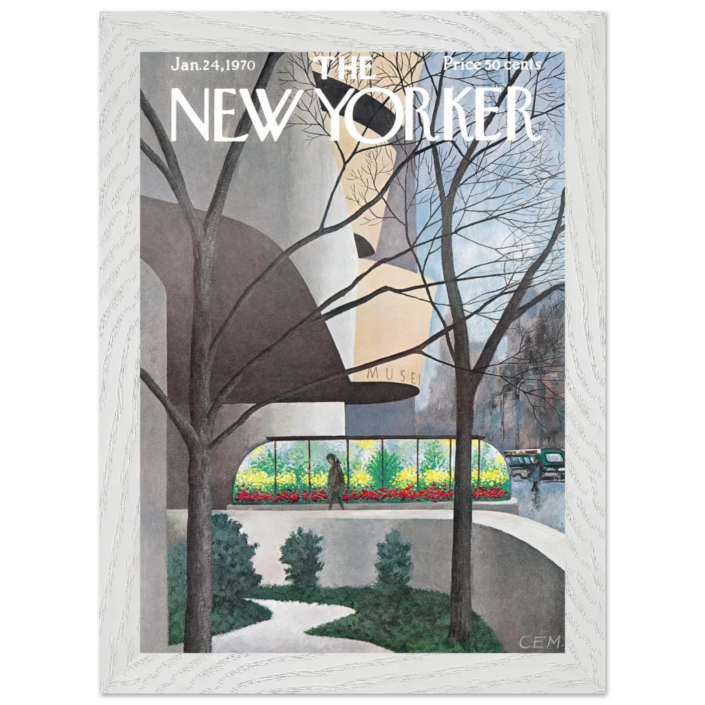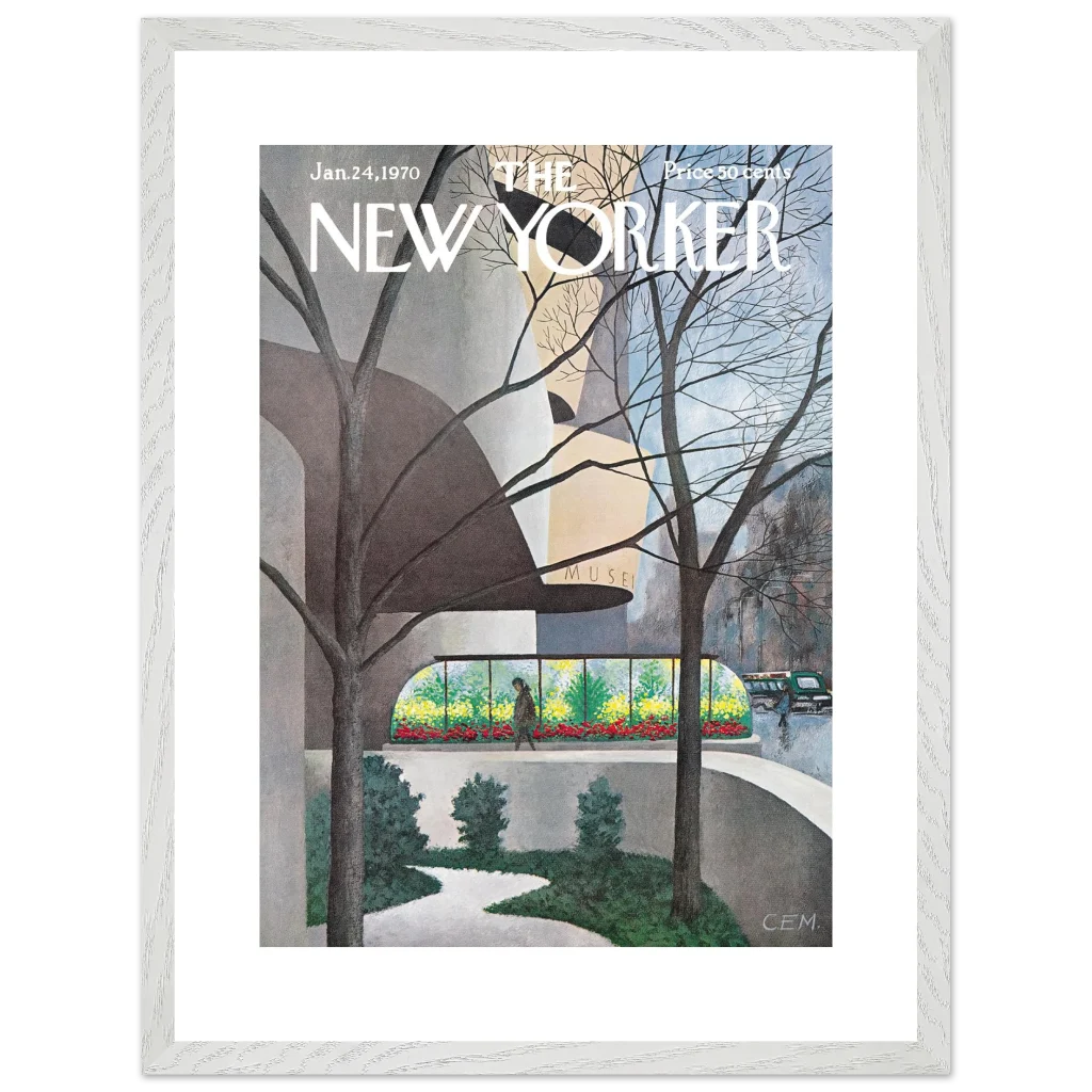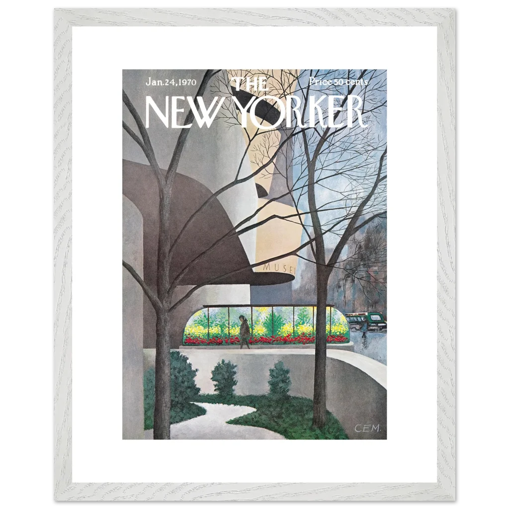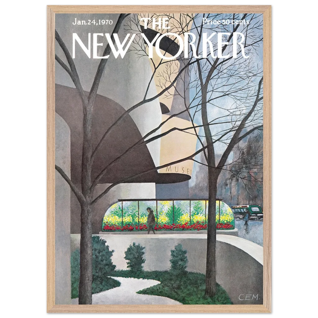 Capture the quiet elegance of a bygone era with our ‘Winter Garden Serenity’ framed poster, a timeless piece inspired by classic New Yorker covers. This captivating illustration evokes a crisp winter day, where a lone figure strolls past a vibrant indoor garden, offering a beautiful contrast of stark urban lines and blooming life. It’s the perfect accent for art lovers seeking a touch of nostalgic charm and sophisticated artistry for their living space or office.