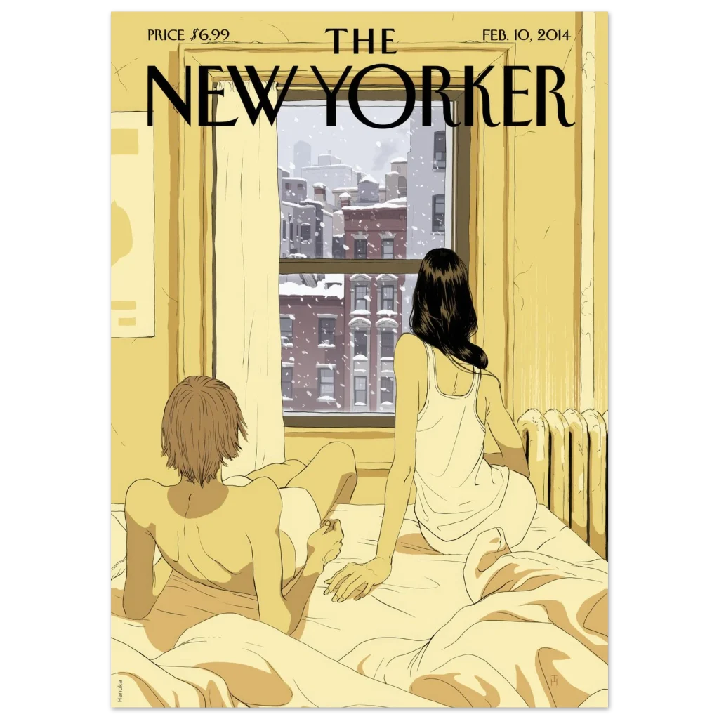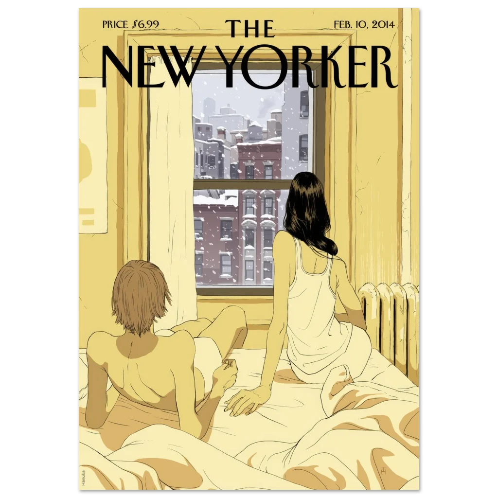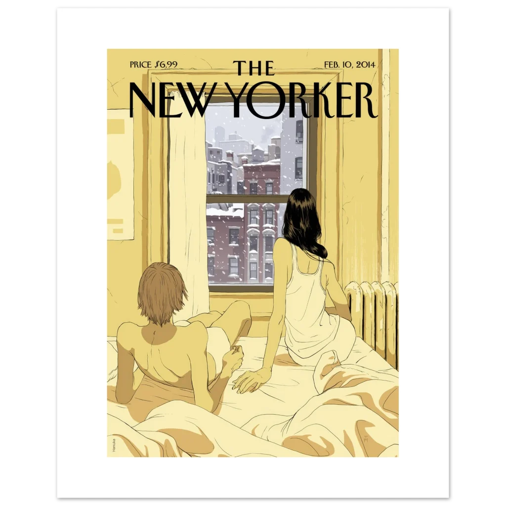 Capture the serene yet vibrant essence of a snowy New York morning with this captivating art print, reminiscent of classic New Yorker covers. This piece beautifully portrays a quiet, intimate moment overlooking a winter cityscape, perfect for adding a touch of urban sophistication and warmth to any room.