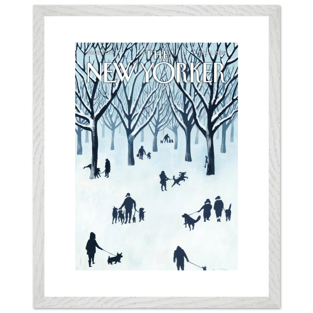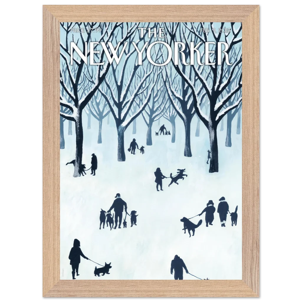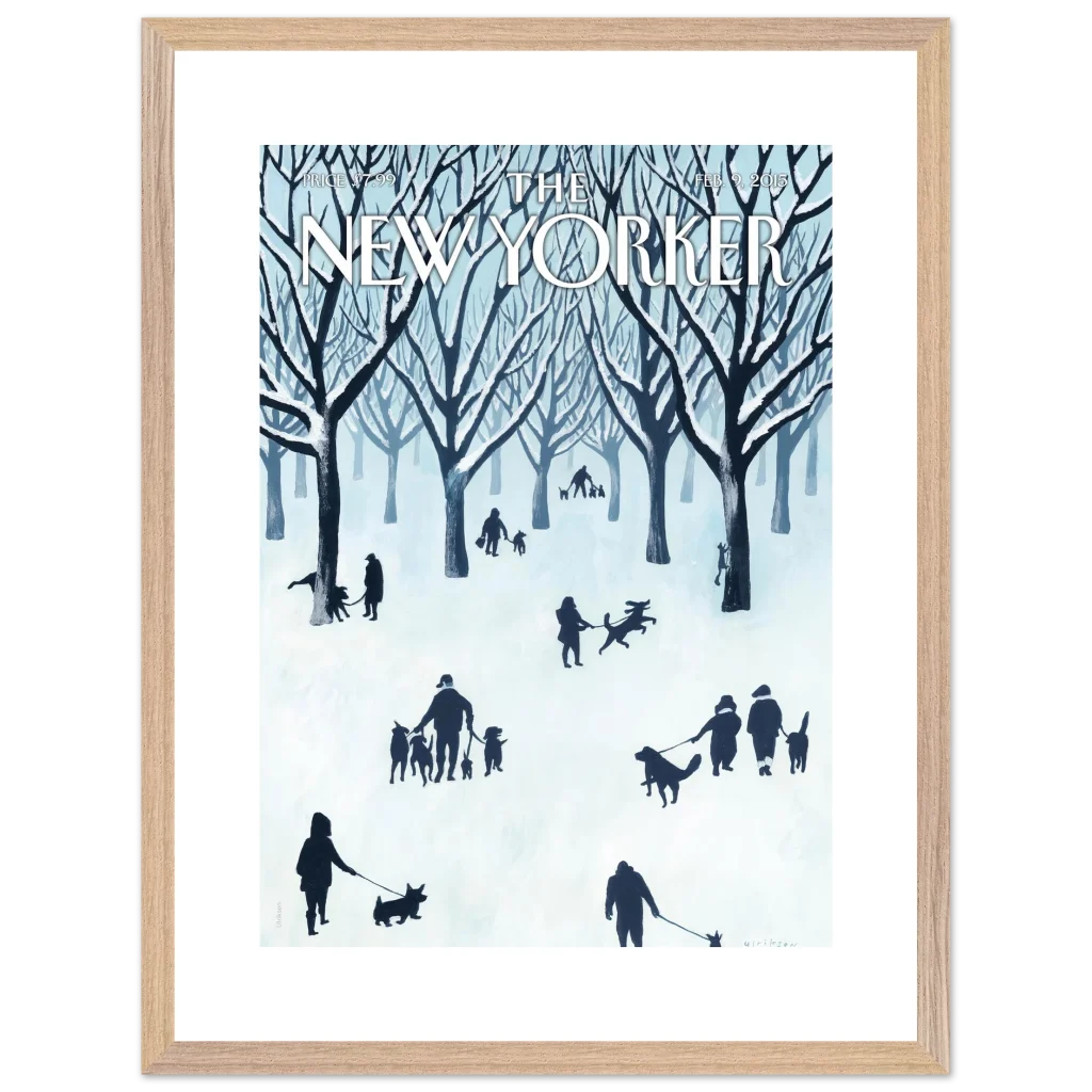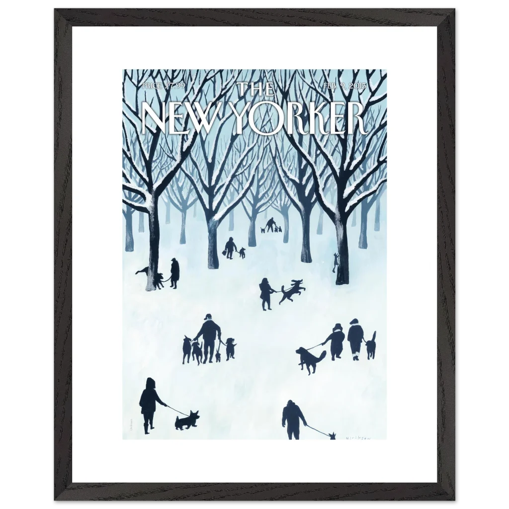 Winter Stroll: New Yorker Art Print – Snowy Park Dog Walkers Premium Wooden Framed Poster with Matte Paper Finish