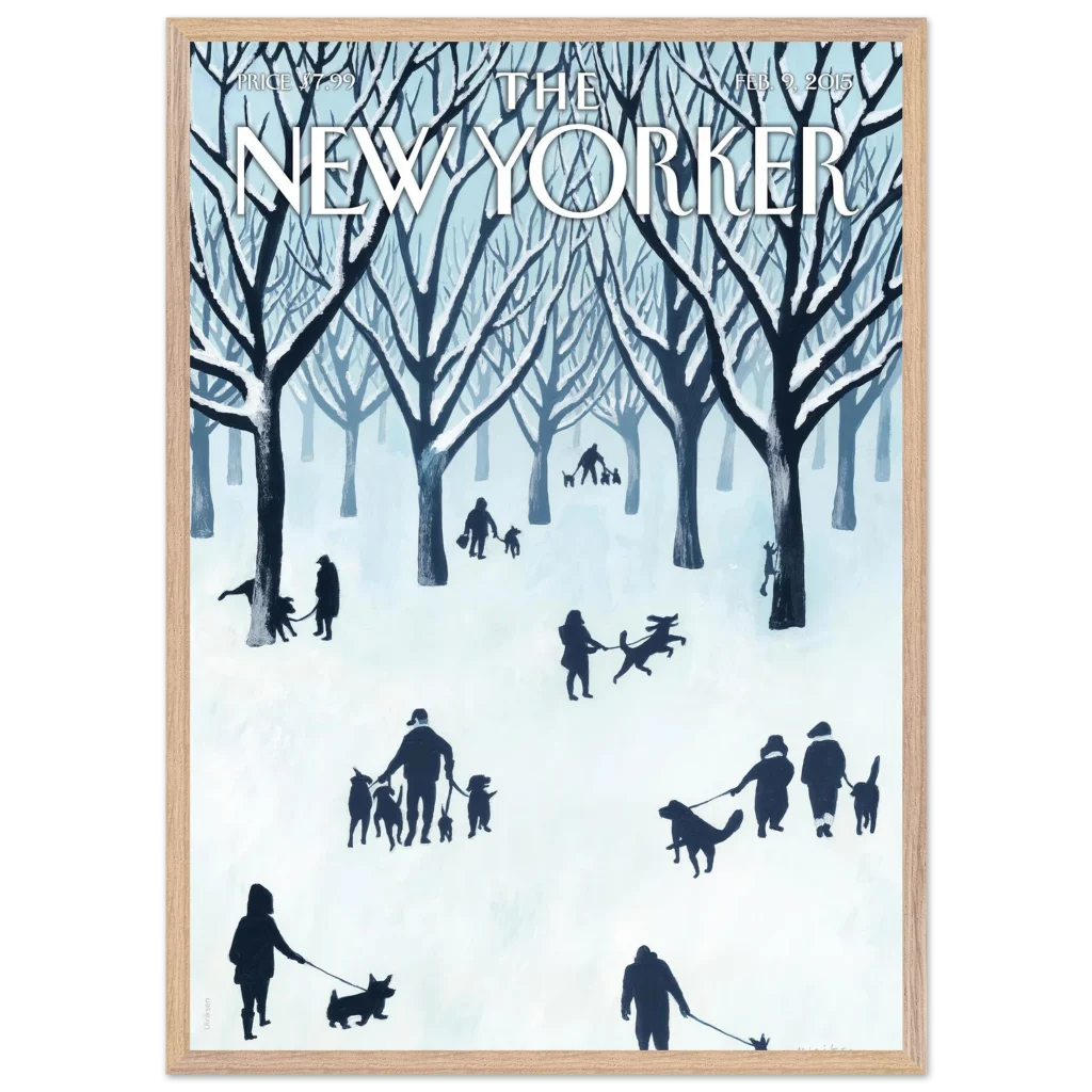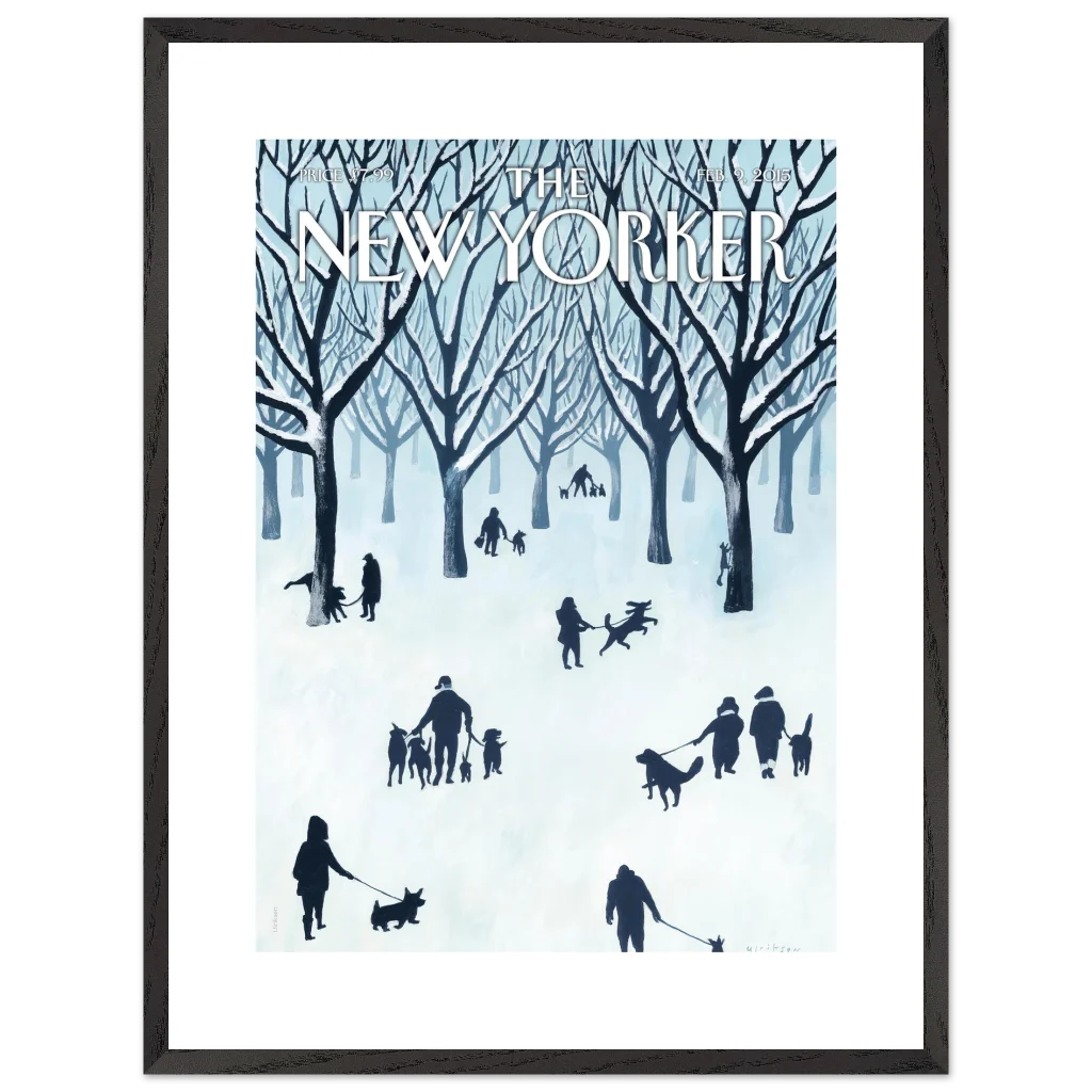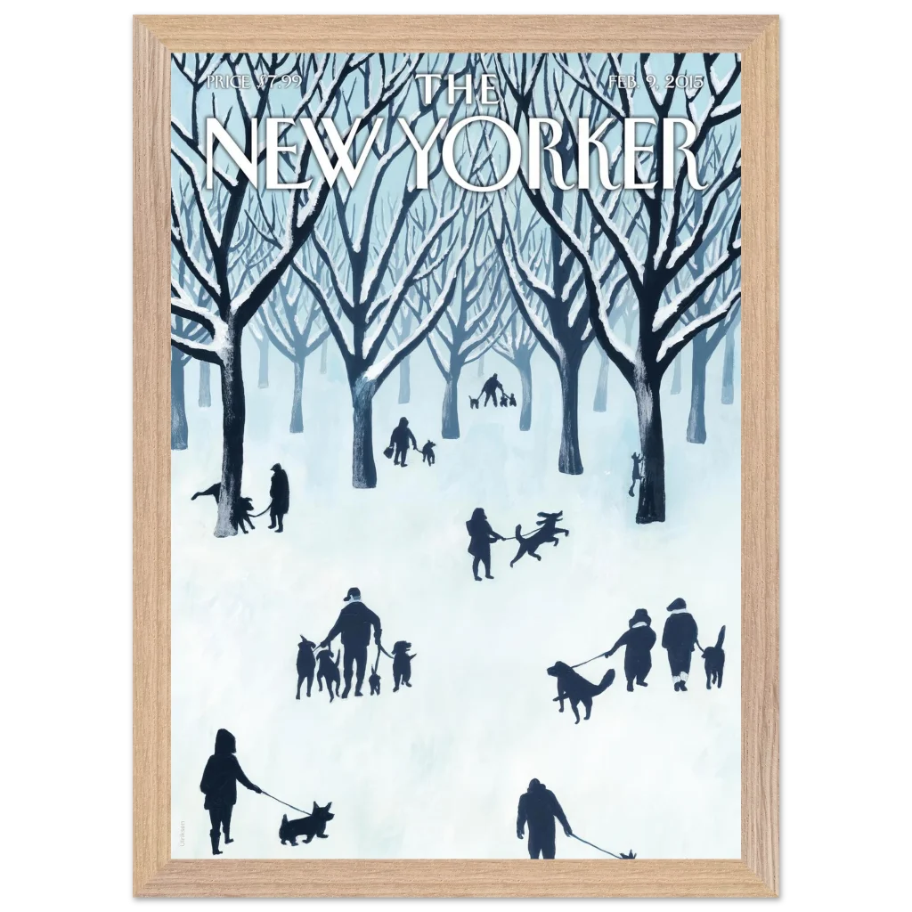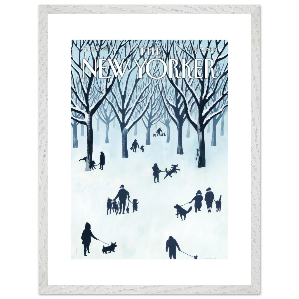 Winter Stroll: New Yorker Art Print – Snowy Park Dog Walkers Premium Wooden Framed Poster with Matte Paper Finish