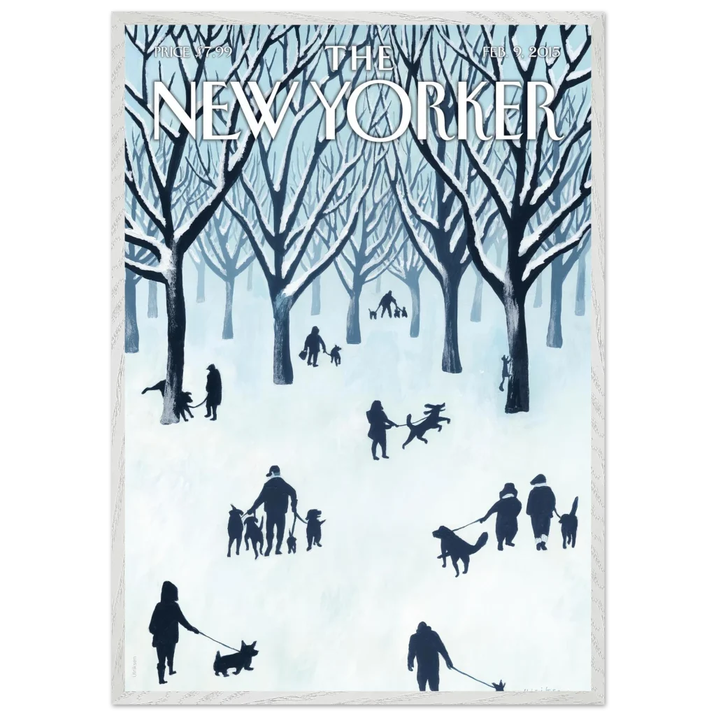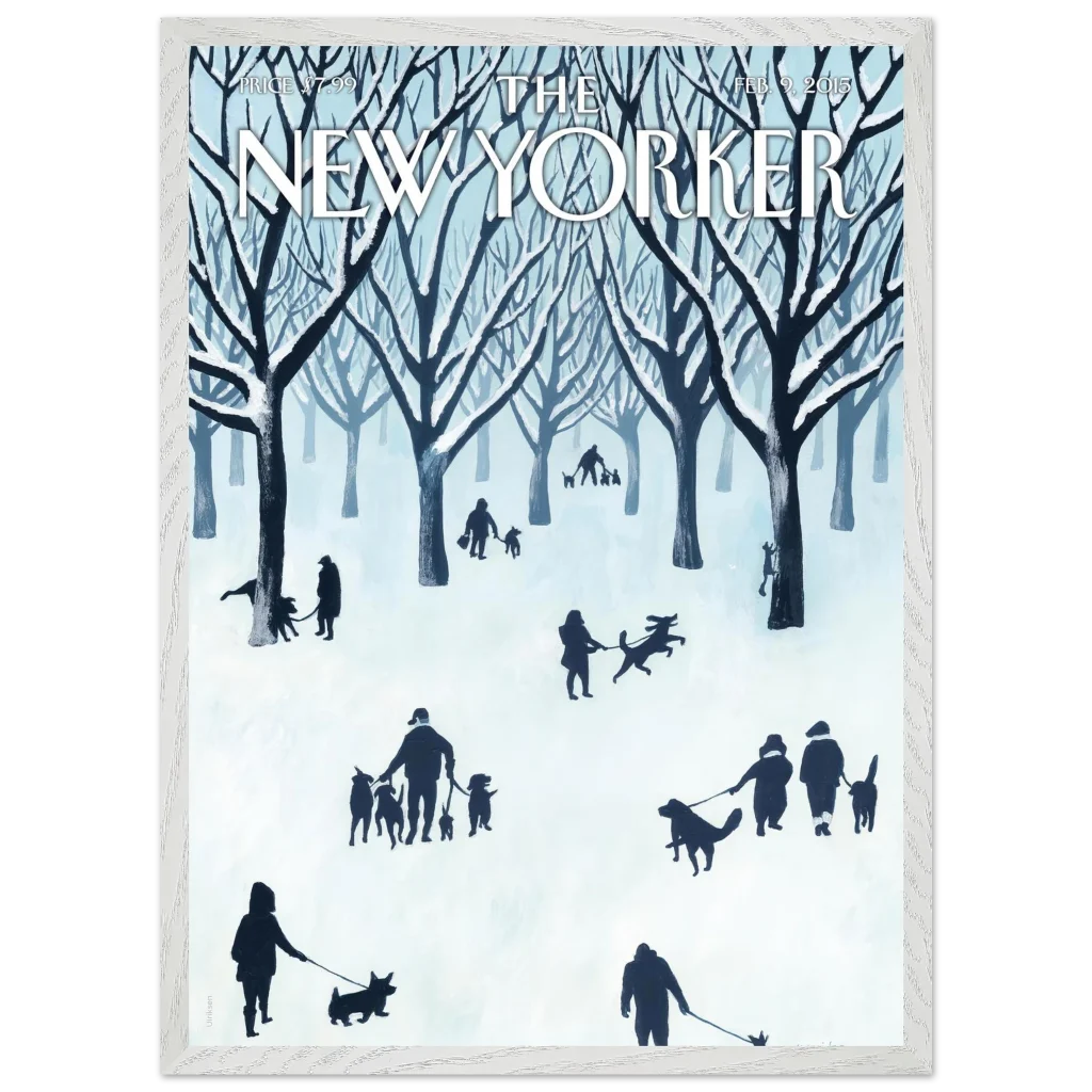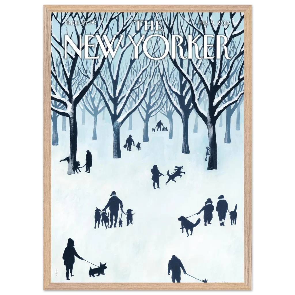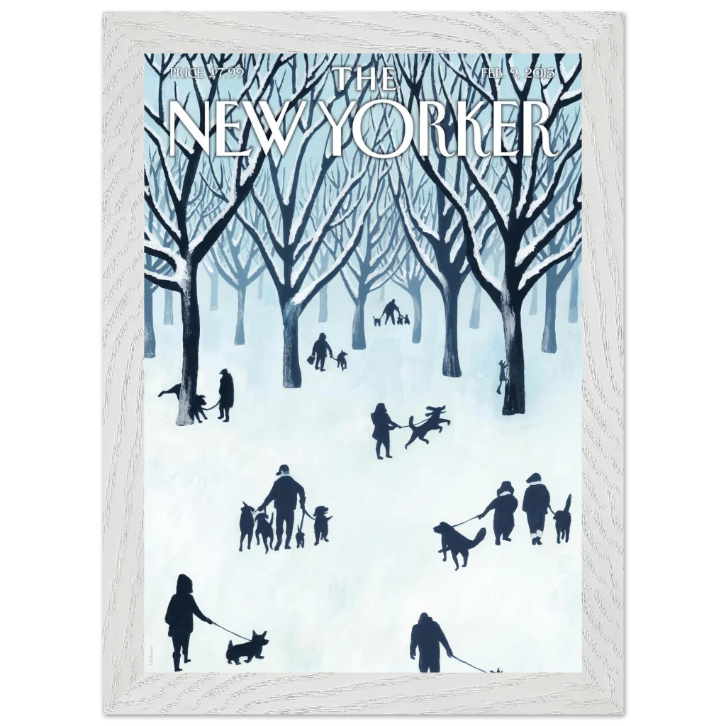 Winter Stroll: New Yorker Art Print – Snowy Park Dog Walkers Premium Wooden Framed Poster with Matte Paper Finish