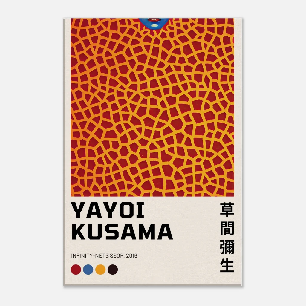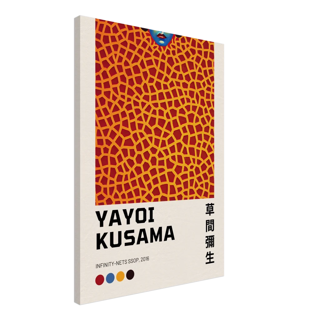 Immerse yourself in the captivating world of contemporary art with our premium canvas print, featuring the iconic “Infinity-Nets SSOP, 2016” by Yayoi Kusama. This striking piece, characterized by its vibrant red and gold abstract pattern and a subtle hint of a blue-faced figure, brings a dynamic energy and artistic sophistication to any space. The canvas texture elevates the image’s natural look and feel, creating a truly immersive art experience that draws you into Kusama’s unique vision.
