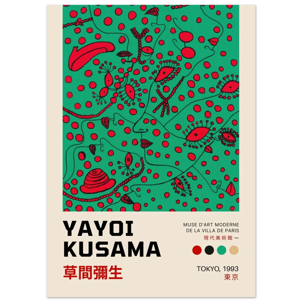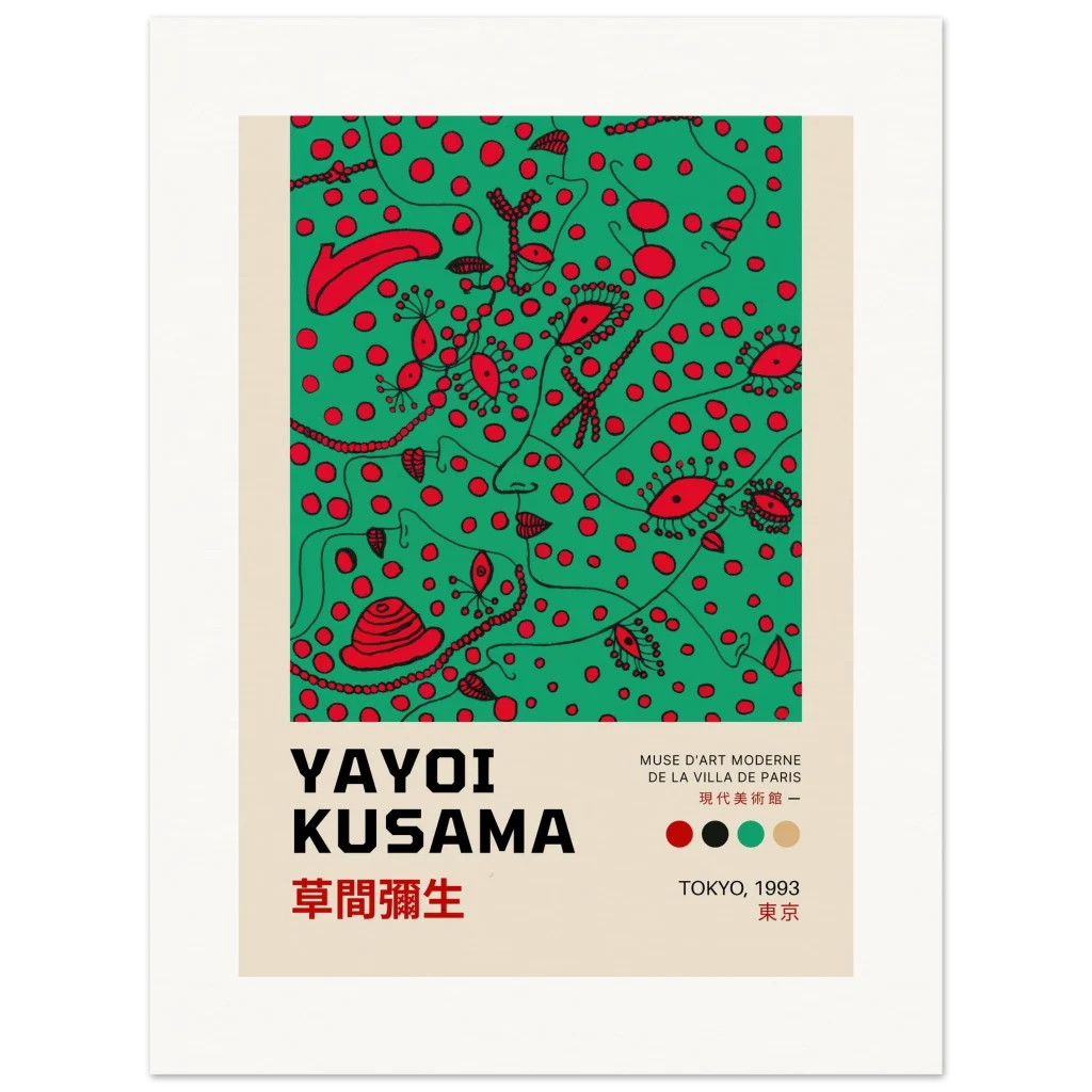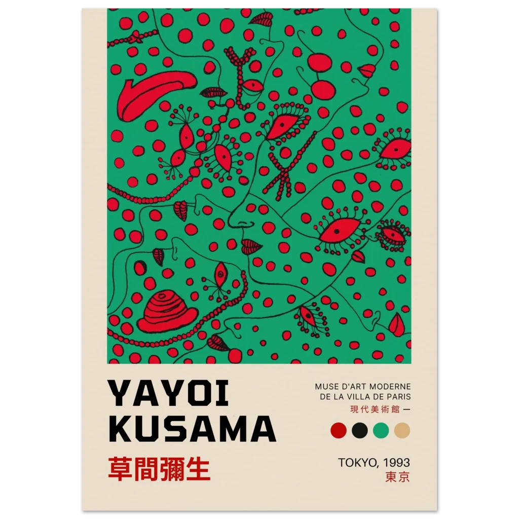 Bring a touch of iconic surrealism and vibrant energy into your space with this stunning Yayoi Kusama-inspired abstract poster. Featuring a mesmerizing dance of bold red polka dots and subtle facial outlines on a lively green backdrop, this artwork captures the playful yet profound spirit of modern art. Perfect for those who appreciate pop art, contemporary design, and a unique splash of color.