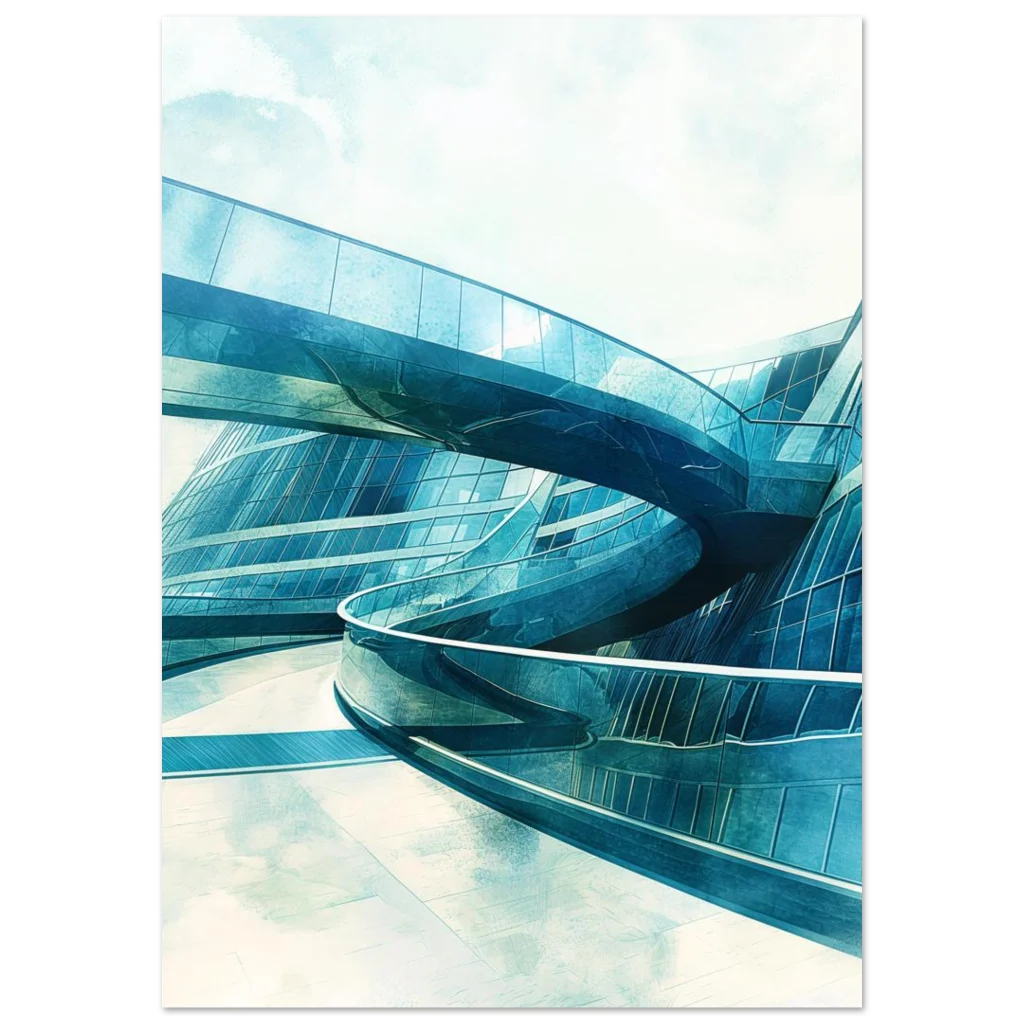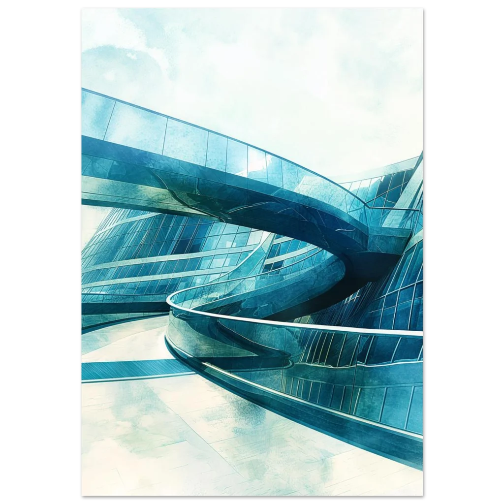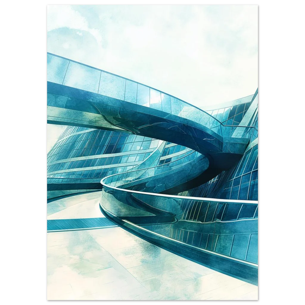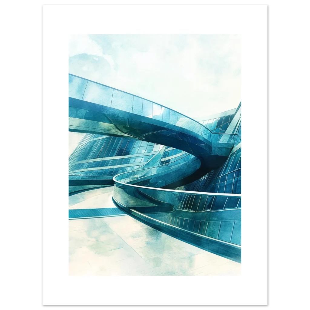 Immerse your space in the cool, fluid lines of modern design with our Abstract Azure Architecture poster. This piece captures the ethereal beauty of a futuristic cityscape, bathed in captivating shades of blue and teal, offering a serene yet dynamic visual escape. The artwork’s watercolor-like texture adds a unique artistic touch, making it a perfect statement for contemporary interiors or anyone who appreciates the marriage of art and structure.