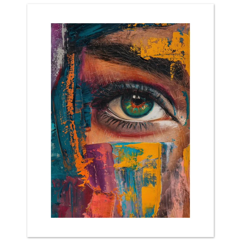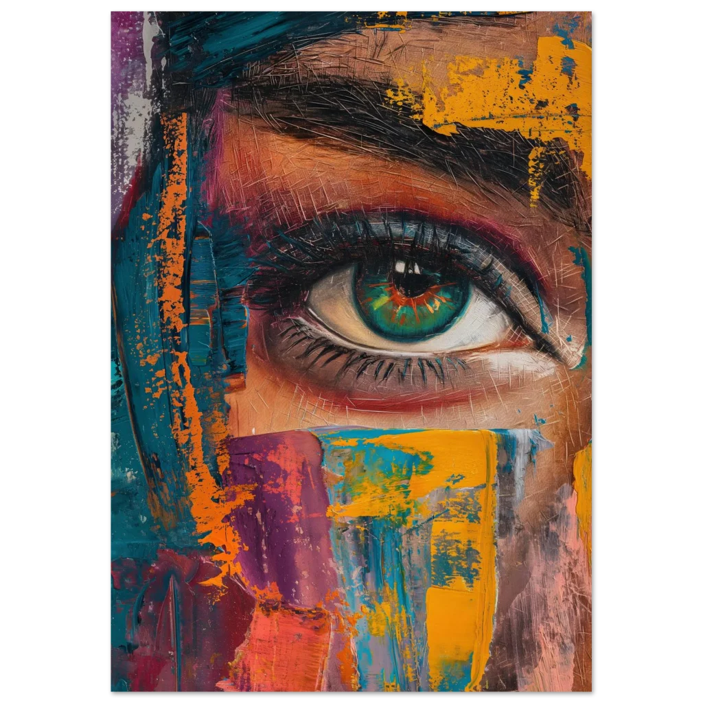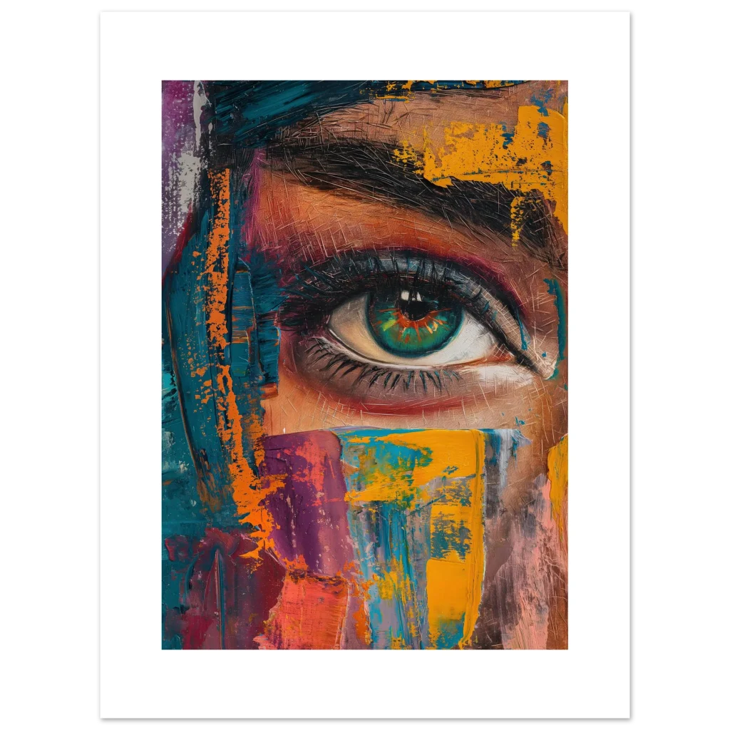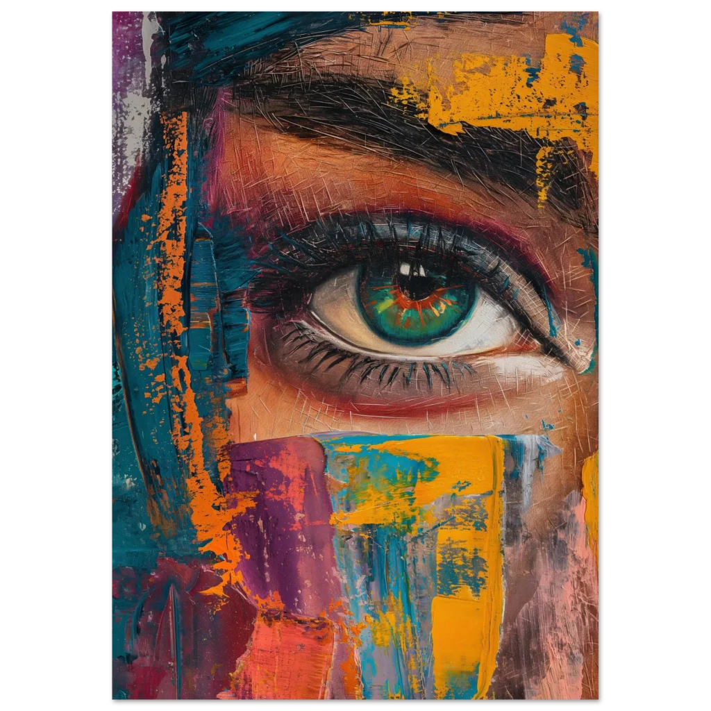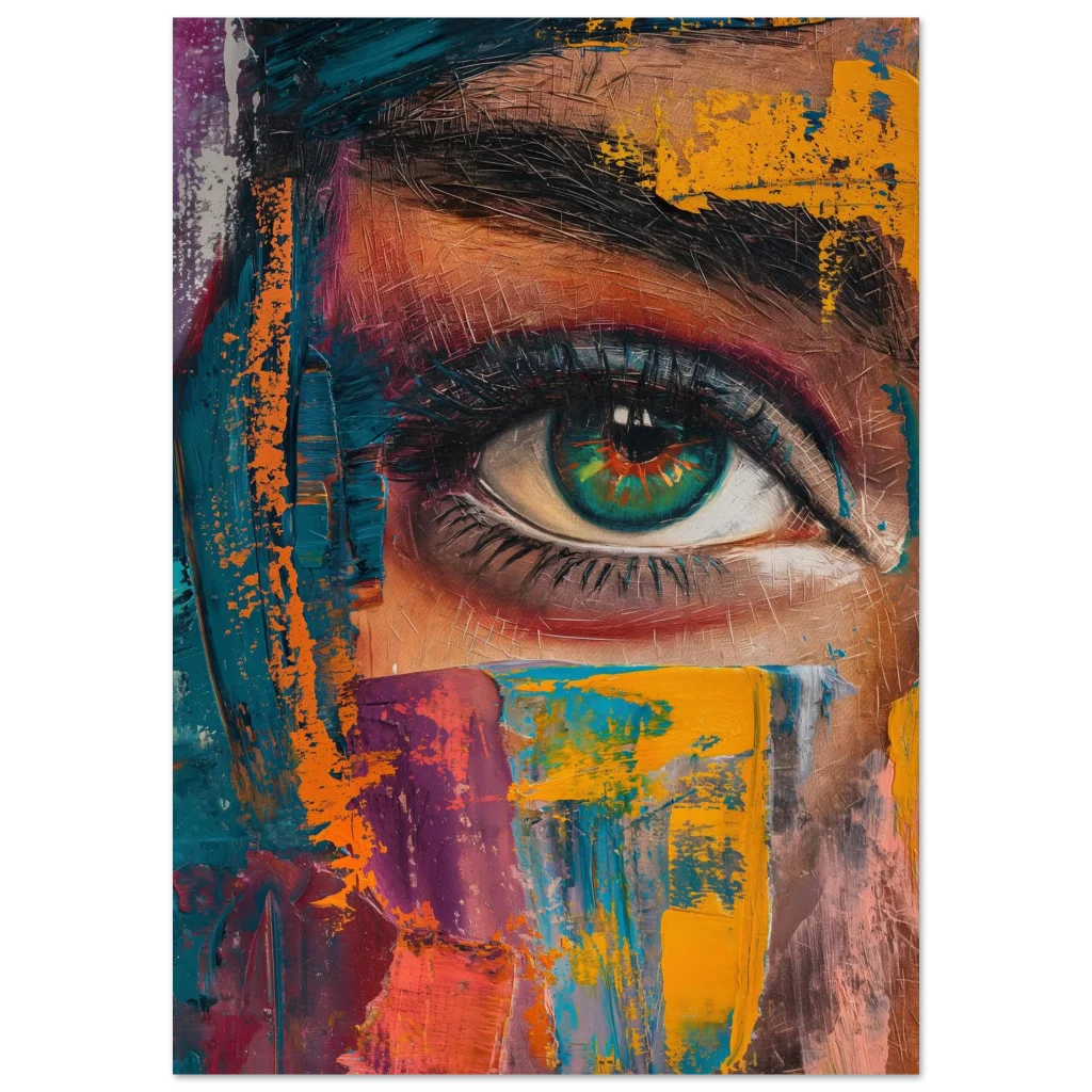 Capture the intense beauty of expression with our ‘Abstract Gaze’ poster. This striking piece, rich in a dynamic palette of teal, vibrant orange, deep magenta, and earthy tones, features a captivating eye rendered with bold, painterly strokes. The artwork’s textured, impasto style brings a modern, abstract energy, making it a focal point in any contemporary space.