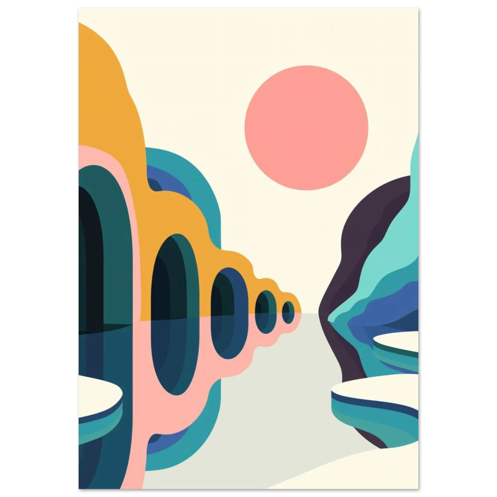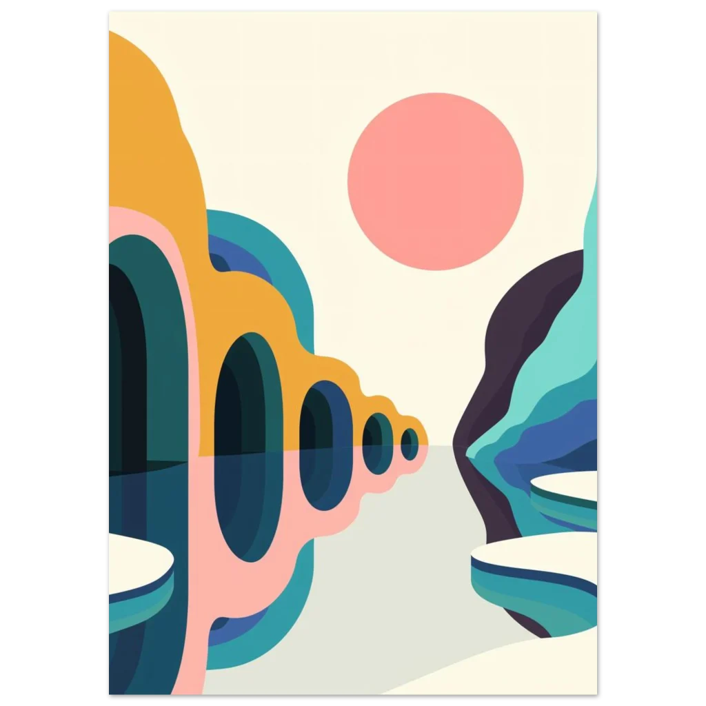 Transform your space with the serene yet vibrant energy of our Abstract Geometric Desert Oasis Poster. This captivating artwork, featuring soft pastel arches and dynamic waves reflecting under a warm, distant sun, evokes a sense of calm and adventurous exploration. Its modern, clean lines and inviting color palette of blush pinks, teals, deep blues, and warm ochres create an artistic focal point that complements any contemporary decor.
