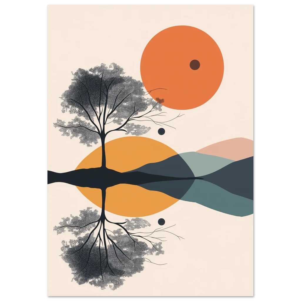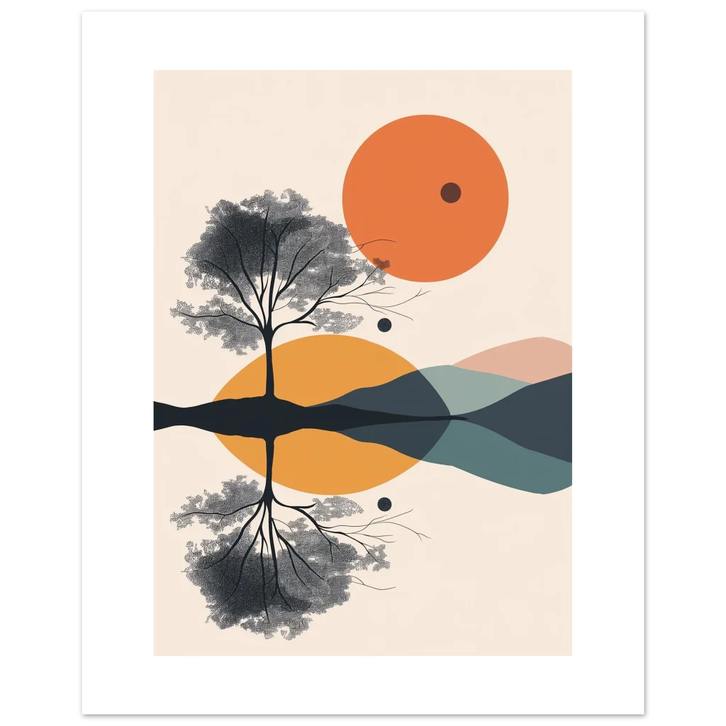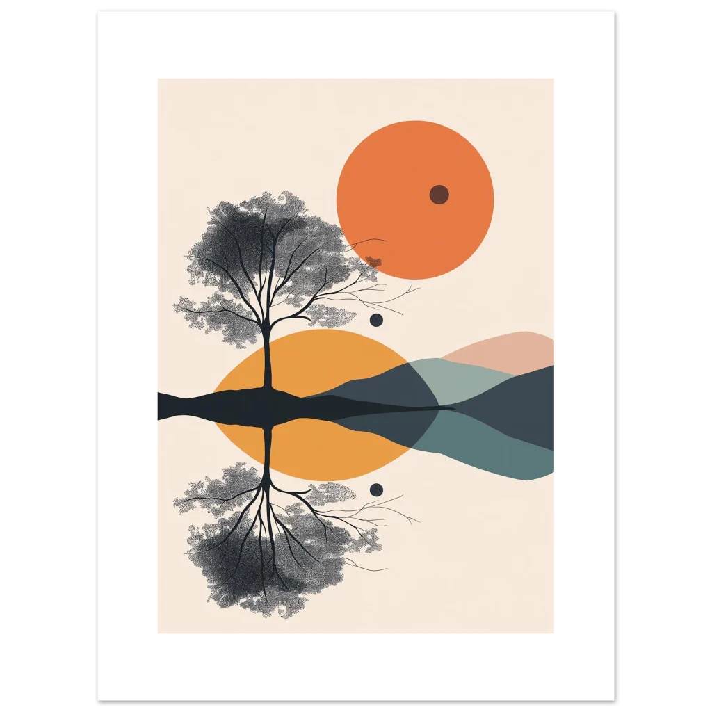 Immerse yourself in the serene beauty of our Abstract Horizon Landscape & Tree Reflection poster. This captivating artwork features a striking interplay of a silhouetted tree with its tranquil reflection, set against a backdrop of soft, overlapping abstract forms and a vibrant orange sun. The minimalist design and soothing color palette evoke a sense of calm and modern elegance, making it a perfect statement piece for any contemporary living space or office.