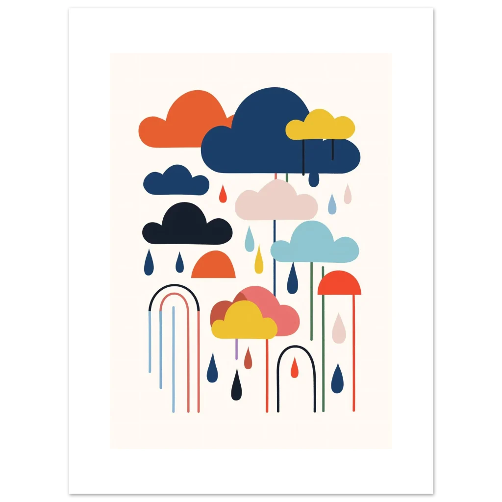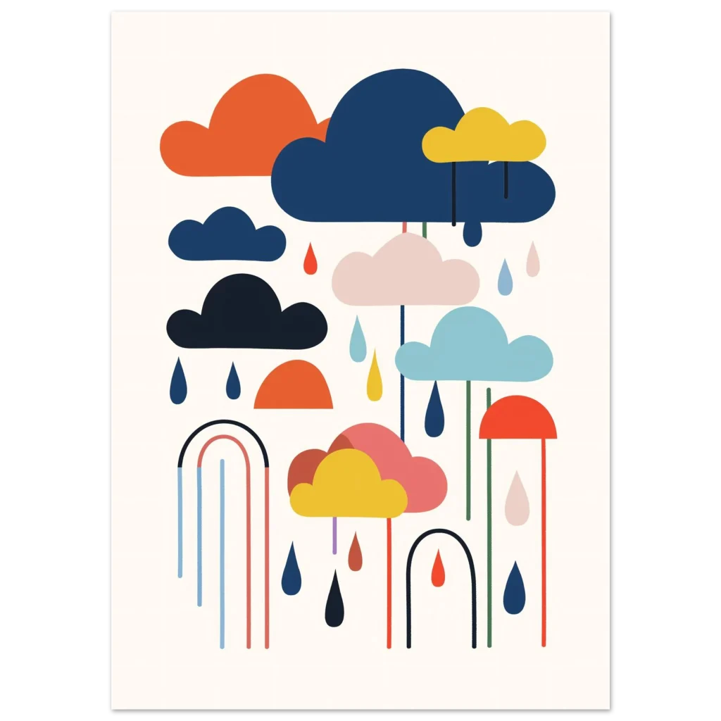 Bring a touch of whimsical sophistication to your space with our Abstract Mid-Century Modern Clouds & Raindrops poster. Featuring a playful array of stylized clouds in warm oranges, deep blues, sunny yellows, and soft pinks, punctuated by colorful raindrops and arching lines, this design evokes a cheerful, modern aesthetic. It’s the perfect accent to brighten any room, adding a pop of artful charm that captures the imagination.