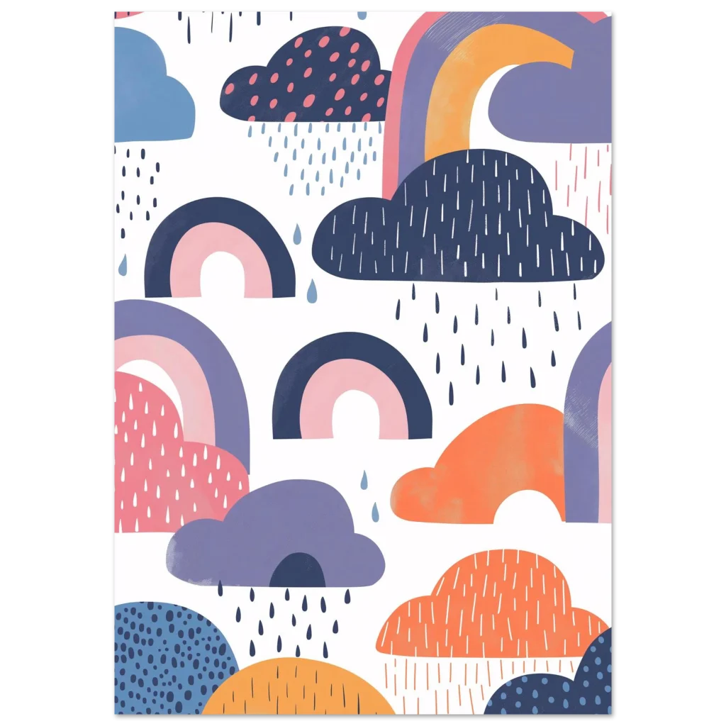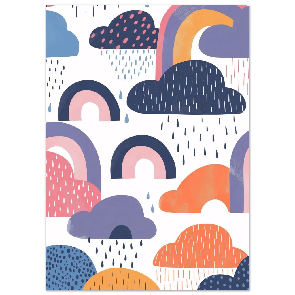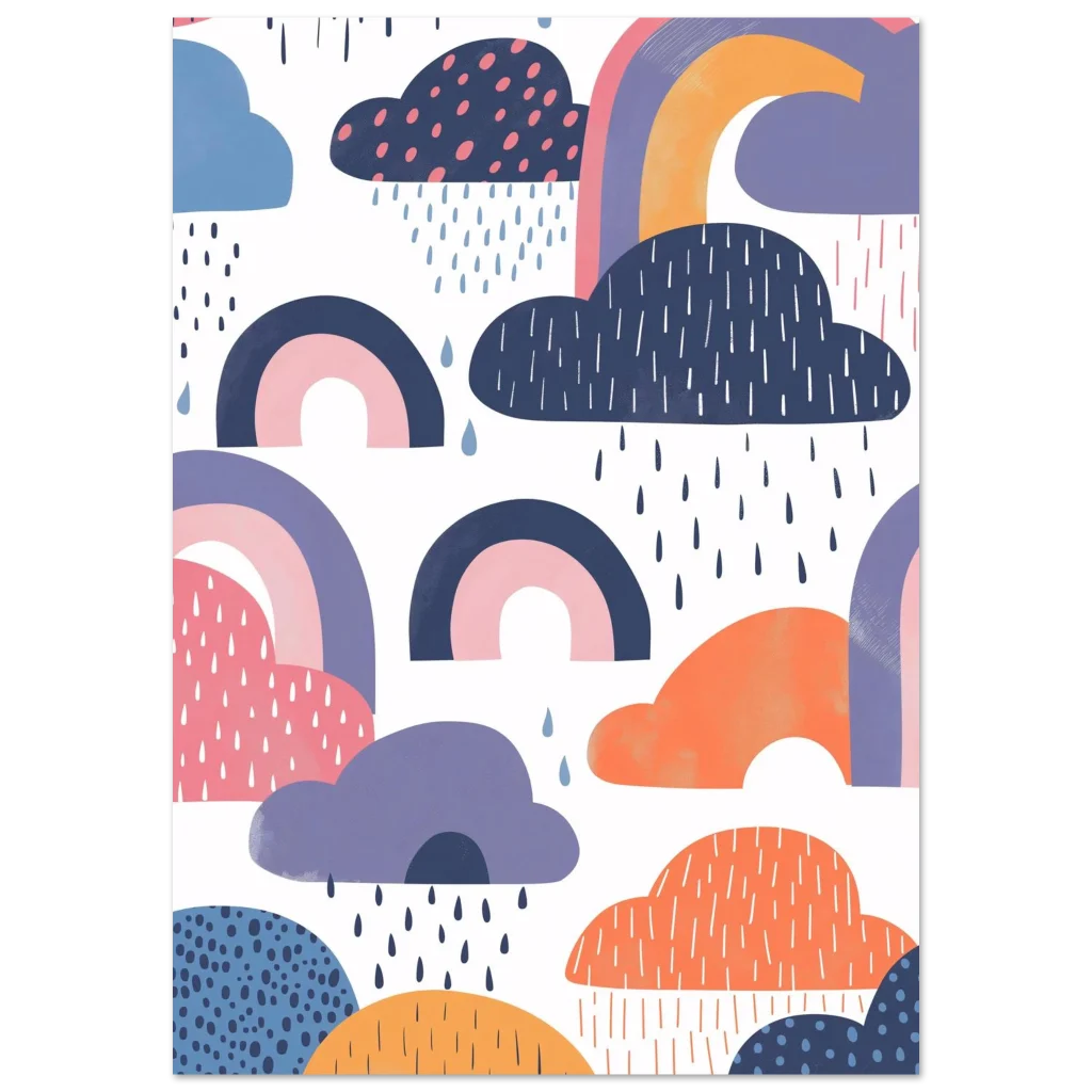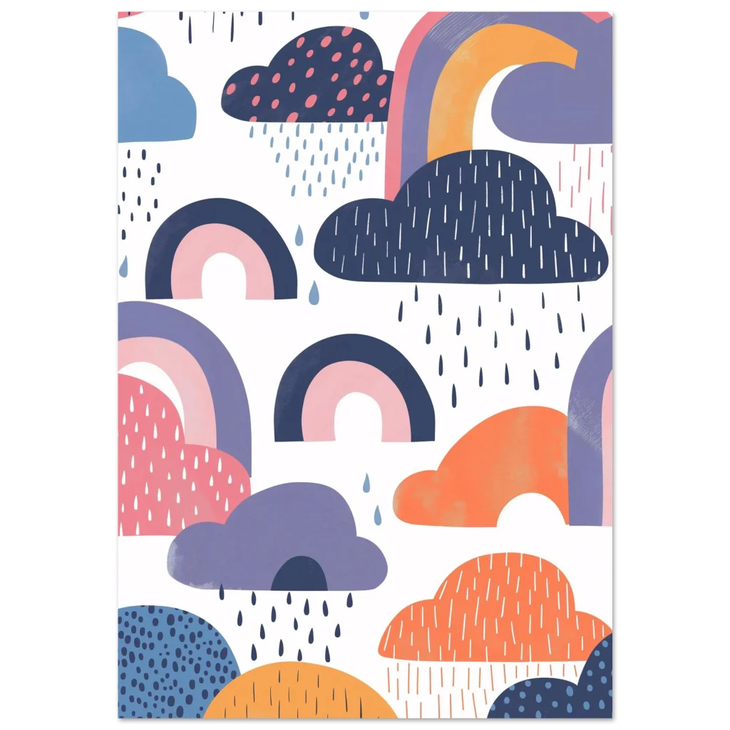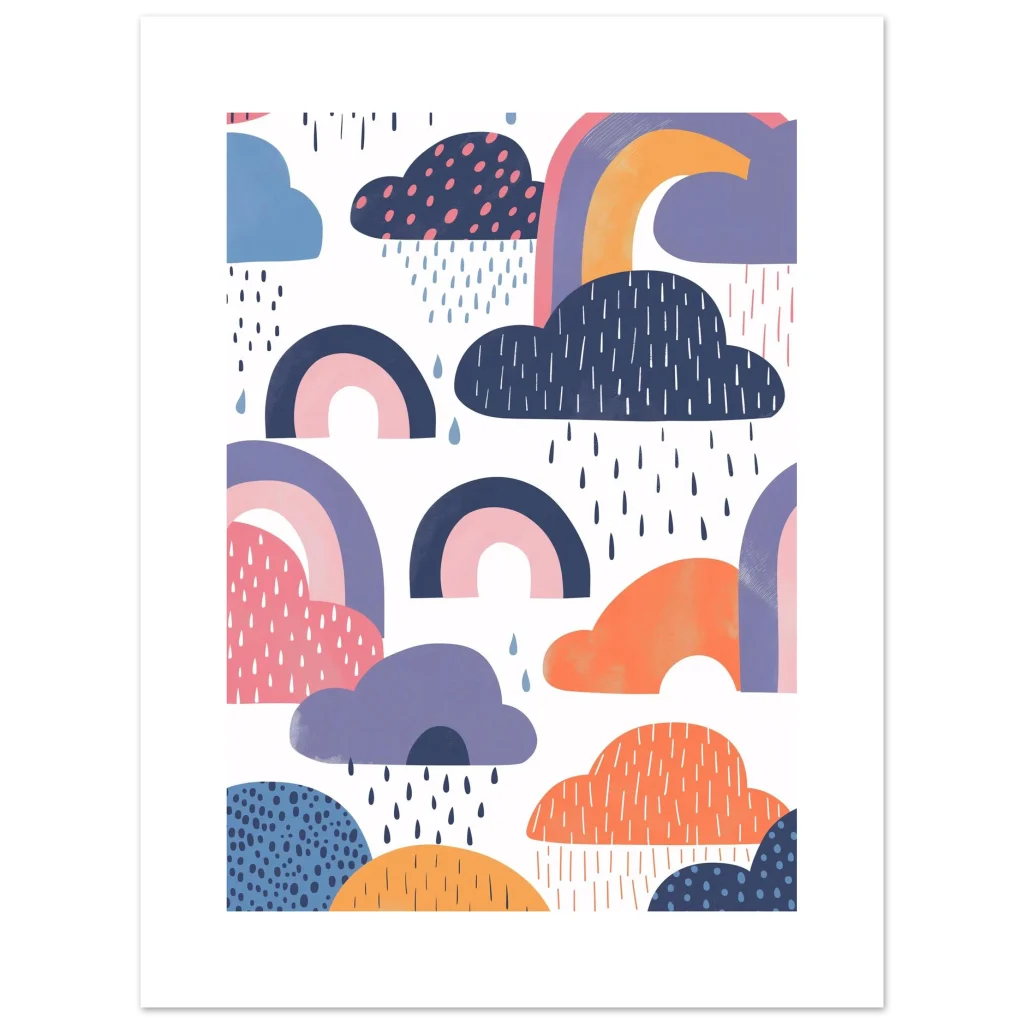 Brighten any room with a touch of whimsical wonder! This enchanting poster brings the playful charm of a rainy day dreamscape, featuring abstract clouds in soft blues, purples, and oranges, alongside delicate rainbows. It’s a delightful piece that evokes joy and a sense of calm, perfect for nurseries, children’s rooms, or adding a touch of modern whimsy to any space.