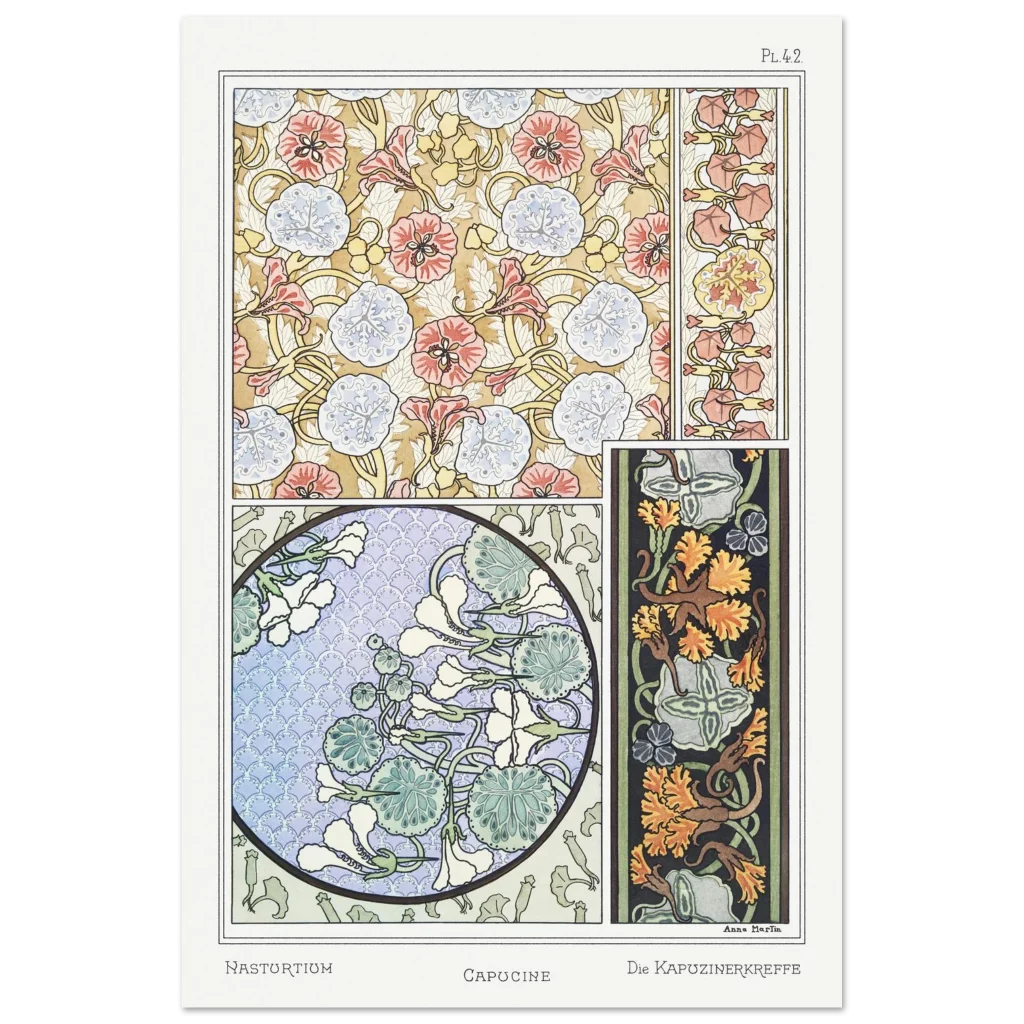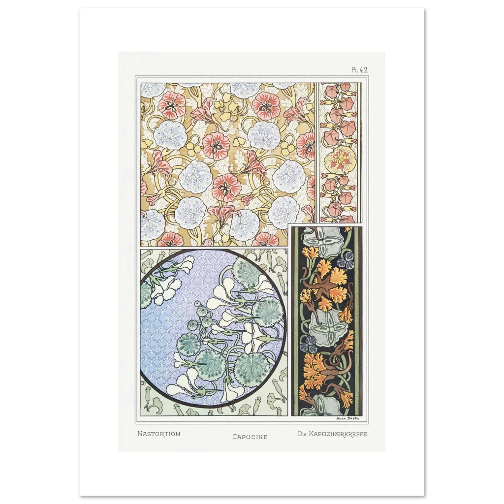 Bring the timeless elegance of Art Nouveau into your home with our exquisite floral poster. Featuring intricate patterns of Nasturtium and Capucine, this vintage-inspired print captures a delicate balance of vibrant coral, serene blue, and earthy gold hues. It’s a celebration of nature’s beauty, rendered in a style that evokes classic artistry and sophisticated charm, perfect for enhancing any living space or gallery wall.