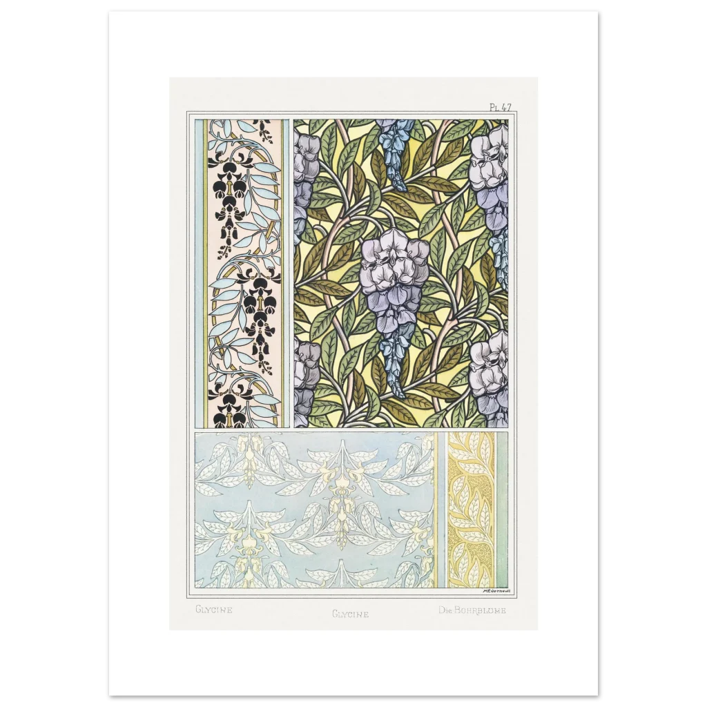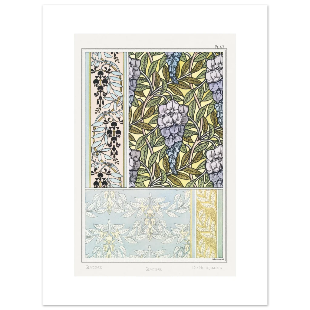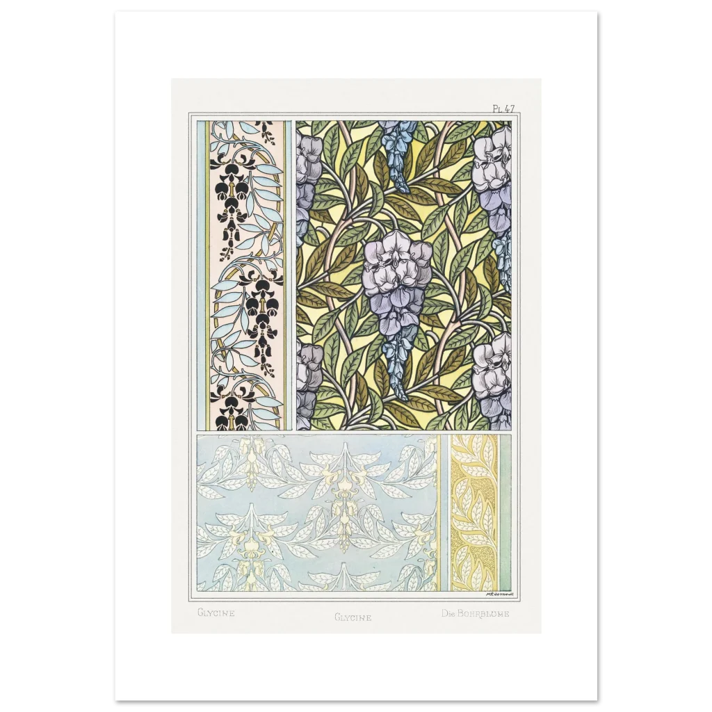 Immerse your space in the enchanting allure of the Art Nouveau era with our Glycine Floral Pattern poster. This exquisite piece, inspired by vintage botanical illustrations, brings a serene yet vibrant touch to any room. Featuring delicate wisteria blossoms and intricate leafy designs in a harmonious palette of soft purples, blues, and natural greens against a warm, sunlit background, it’s a celebration of nature’s artistry and classic design.