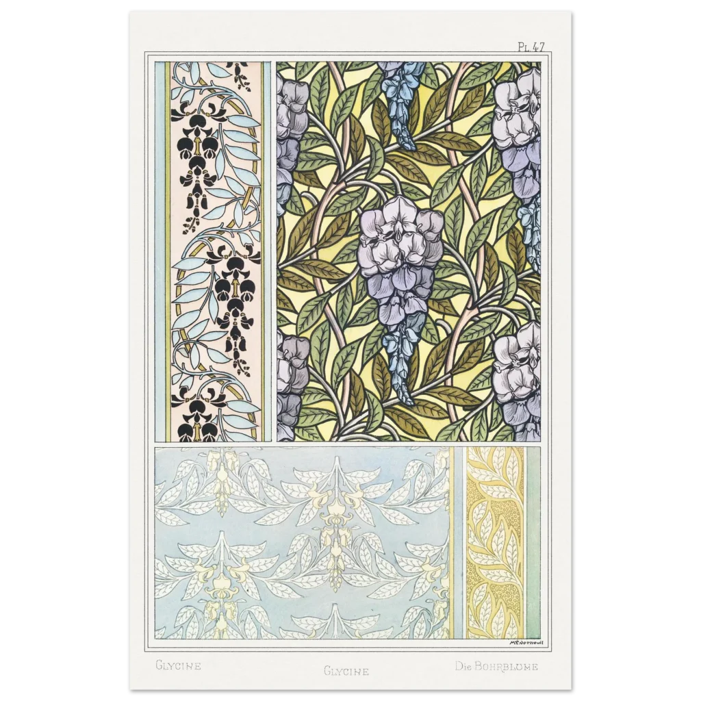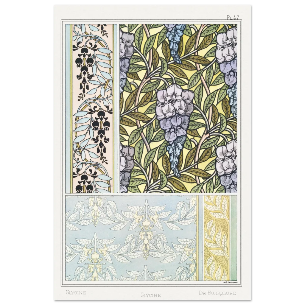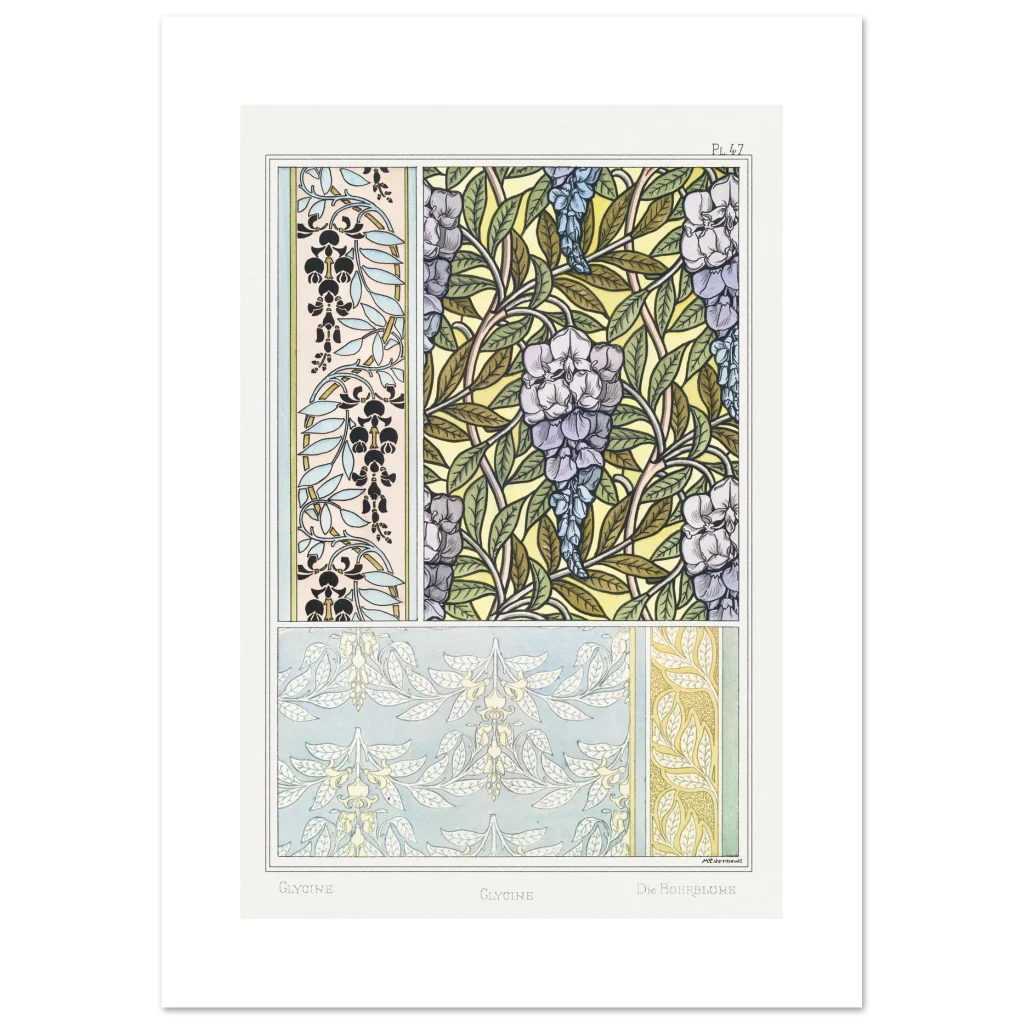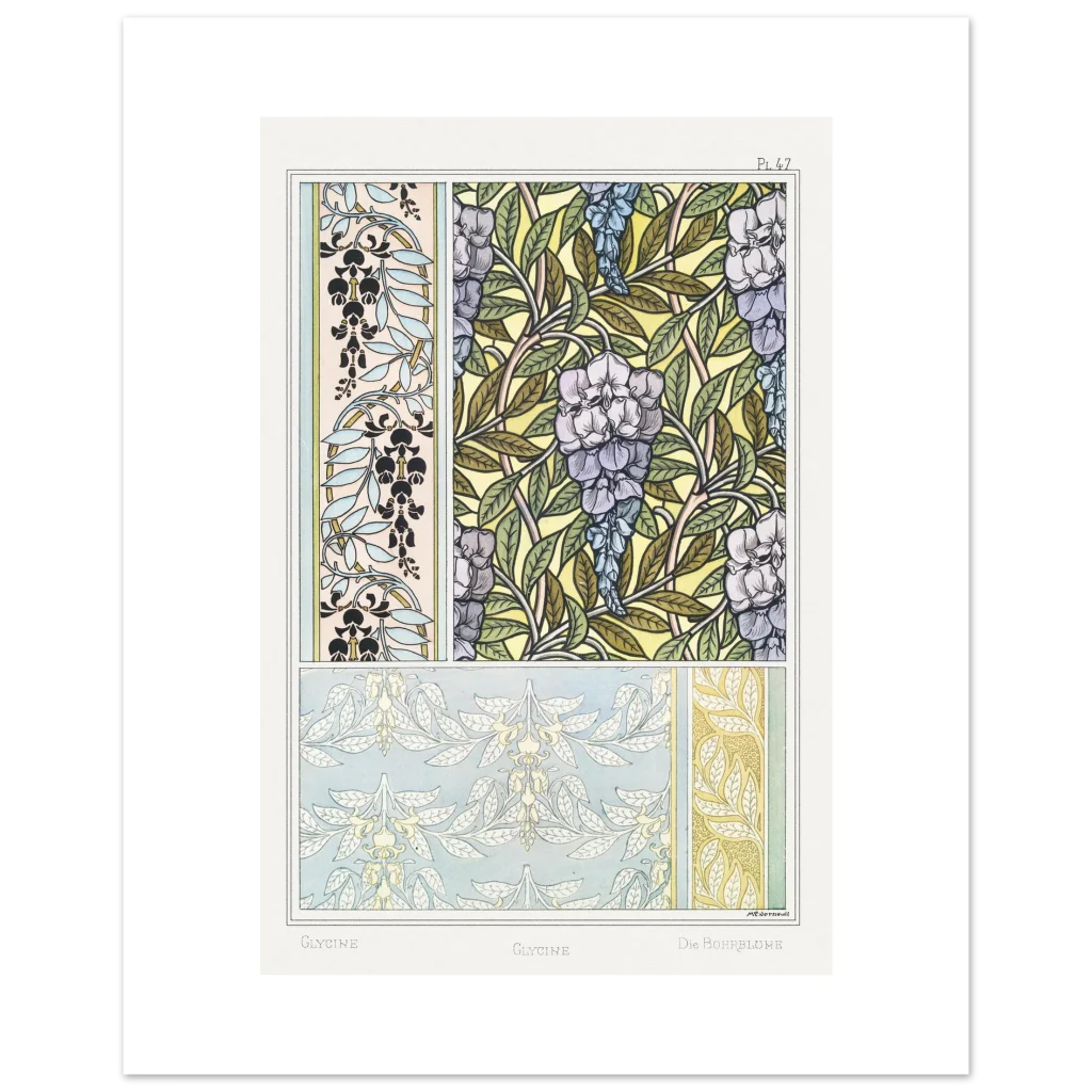 Immerse your space in the enchanting allure of the Art Nouveau era with our Glycine Floral Pattern poster. This exquisite piece, inspired by vintage botanical illustrations, brings a serene yet vibrant touch to any room. Featuring delicate wisteria blossoms and intricate leafy designs in a harmonious palette of soft purples, blues, and natural greens against a warm, sunlit background, it’s a celebration of nature’s artistry and classic design.
