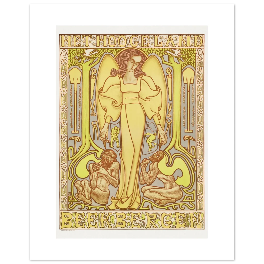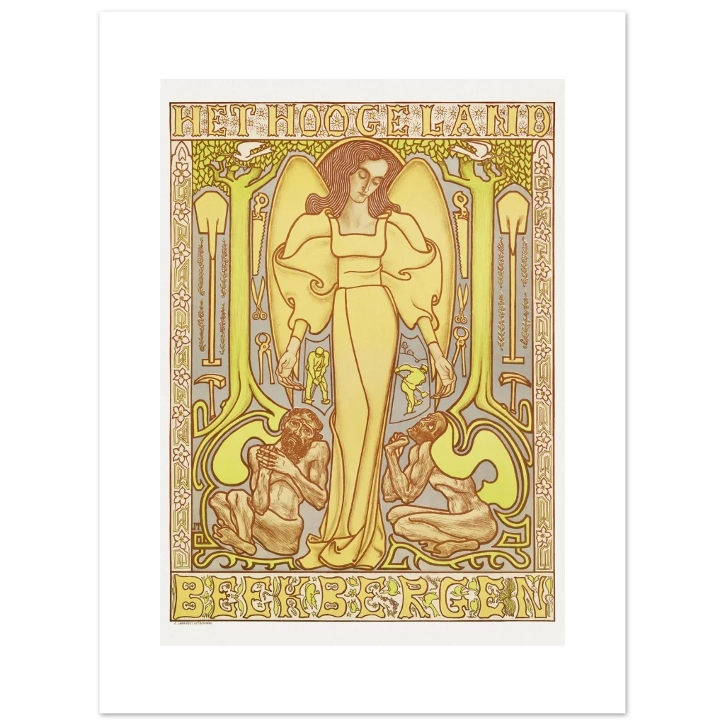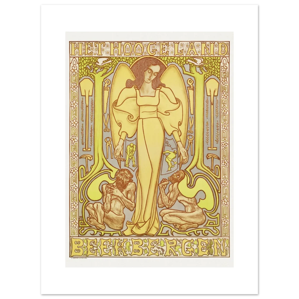 Bring the tranquil elegance of Art Nouveau into your home with our “Het Hooge Land” inspired premium matte paper poster. This design, rich in earthy yellows, greens, and warm browns, features an ethereal central figure surrounded by natural motifs and symbolic elements, evoking a sense of harmonious serenity and classic artistry.