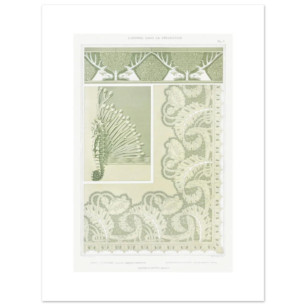Immerse your space in the serene elegance of Art Nouveau with this exquisite premium matte paper poster. Featuring a harmonious blend of stylized wildlife—majestic deer, whimsical seahorses, and subtle lizards—alongside flowing botanical patterns, this piece brings a touch of natural sophistication and vintage charm to any room. The soft, muted green and cream palette evokes a calm, organic ambiance, perfect for creating a tranquil retreat in your home or office.