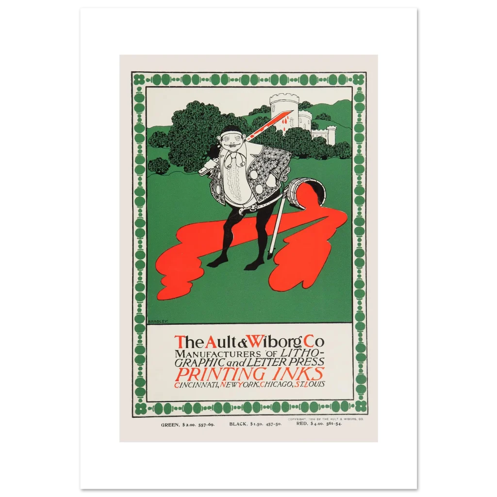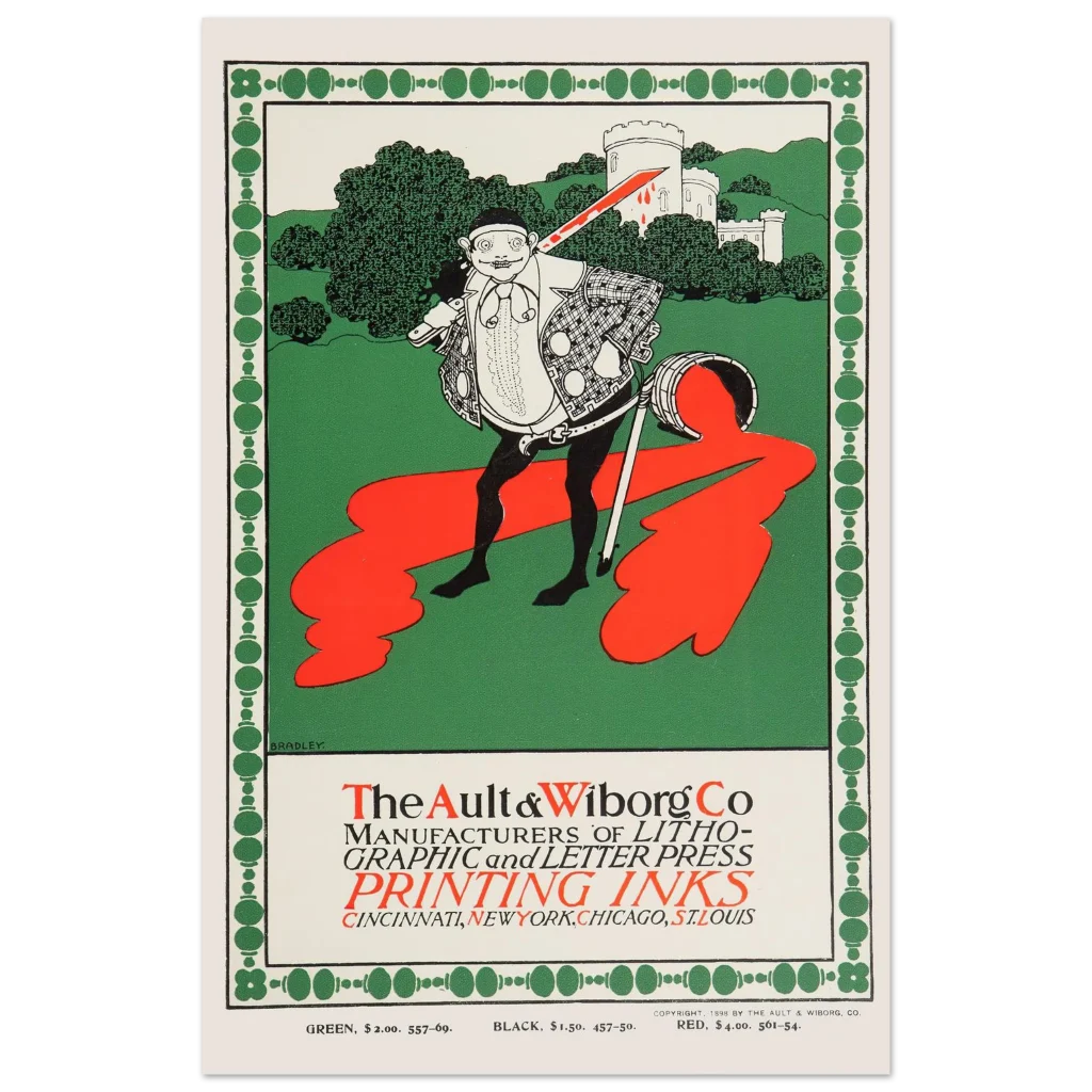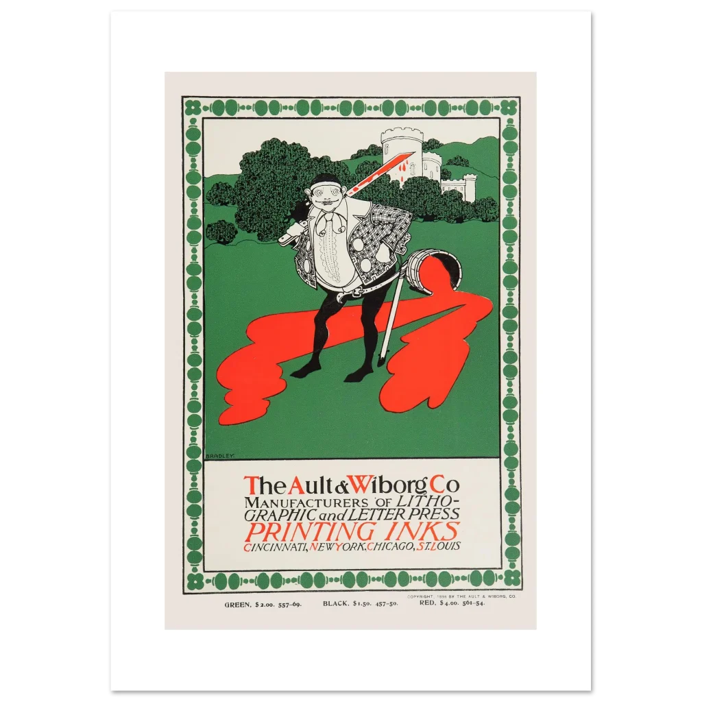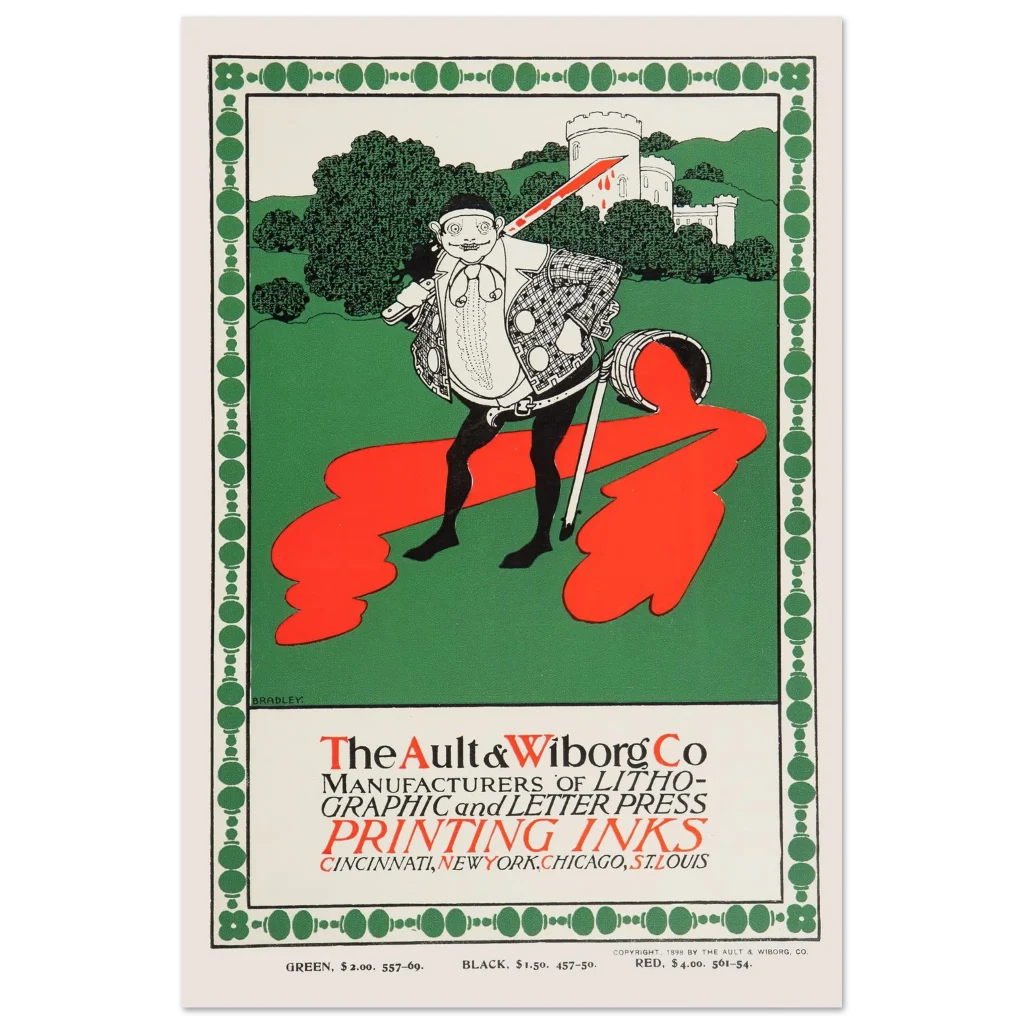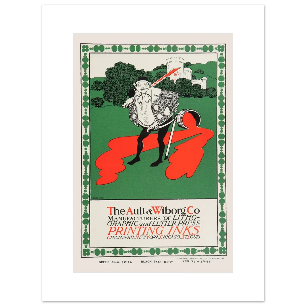 Step into a world of vibrant history with our exclusive Premium Matte Paper Poster featuring the captivating 1898 Ault & Wiborg Co. Printing Inks advertisement. This iconic art nouveau design, with its bold green and striking red palette, brings a whimsical yet sophisticated touch to any space. The unique character pouring a bucket of brilliant red ink, set against a classic castle backdrop, tells a story of artistry and passion, perfect for art enthusiasts, history buffs, or anyone looking to add a touch of vintage charm.