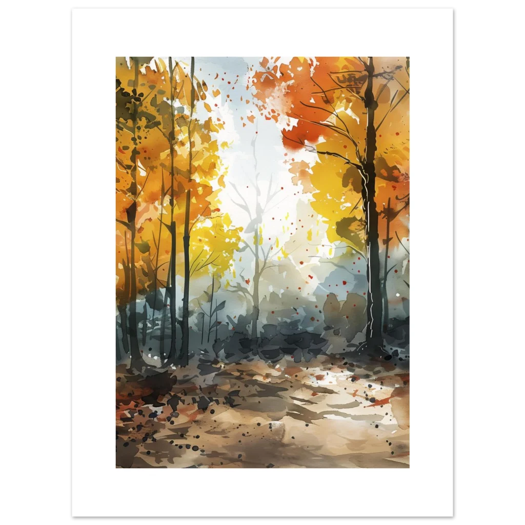 Step into a vivid autumn landscape with our ‘Autumn Forest Path’ poster, a stunning watercolor piece that captures the vibrant energy and serene beauty of a fall forest. The rich blend of warm oranges, yellows, and deep grays evokes the feeling of a crisp day, with dappled light filtering through changing leaves. This artwork brings a touch of nature’s dramatic seasonal shift directly into your home, perfect for creating a cozy and inviting atmosphere.