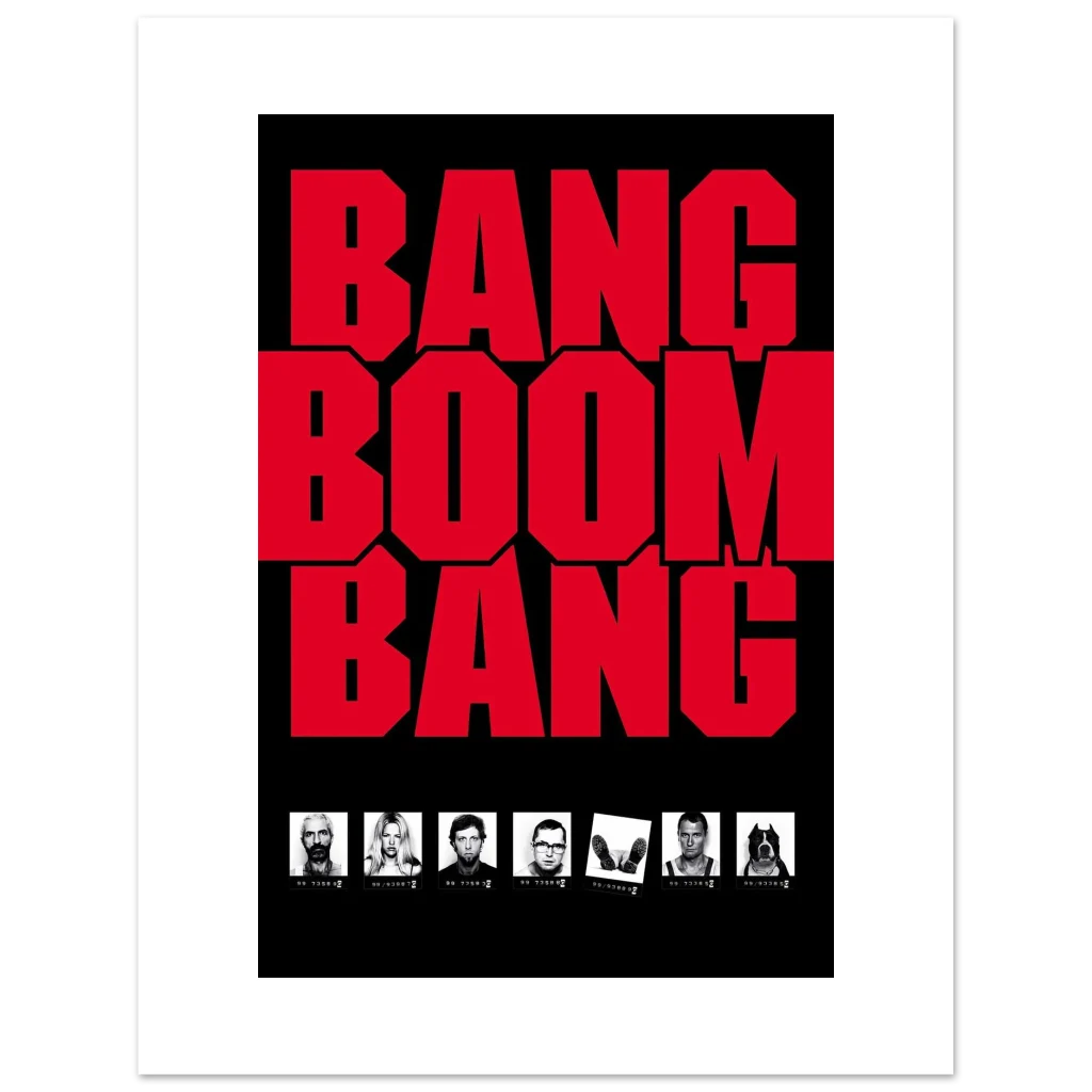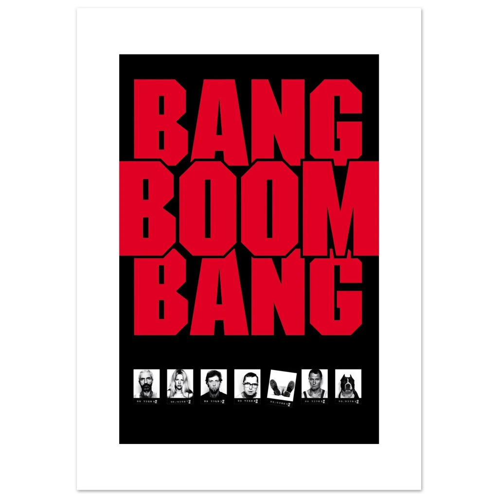 Bring the explosive energy of Bang Boom Bang into your space with this striking movie poster. Featuring the film’s bold, unforgettable title in vibrant red against a stark black background, this classic design is complemented by character mugshots, capturing the raw, gritty essence of the cult favorite. It’s a must-have for any cinephile looking to add a touch of cinematic rebellion to their décor.