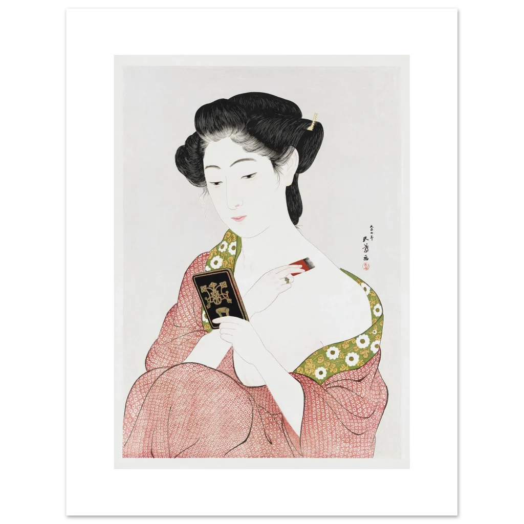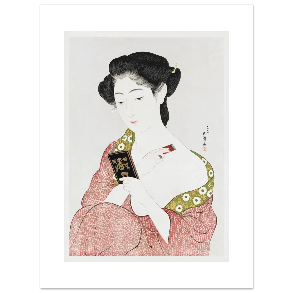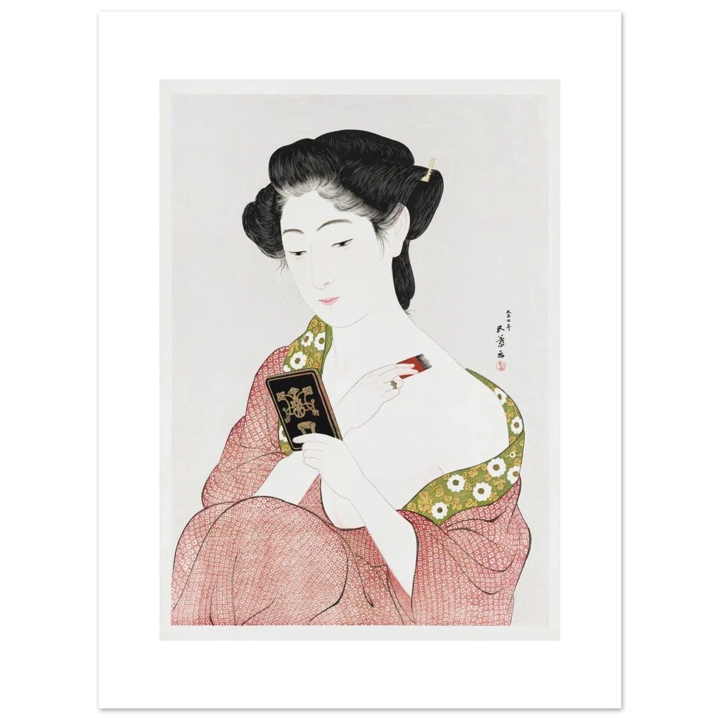 Immerse yourself in the serene elegance of traditional Japanese art with this exquisite print, “Beauty Applying Make-up (Keisen Tosa).” This stunning ukiyo-e piece captures a moment of quiet grace, showcasing delicate artistry and a vibrant yet harmonious color palette that brings an air of timeless sophistication to any room. Perfect for admirers of classical beauty and cultural depth, this poster adds a touch of historical charm and aesthetic tranquility to your living space or office.