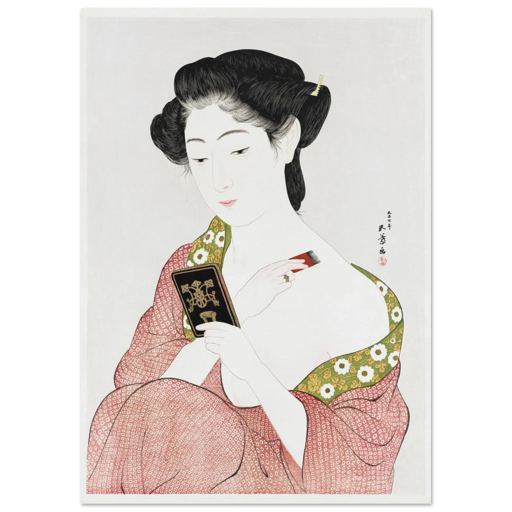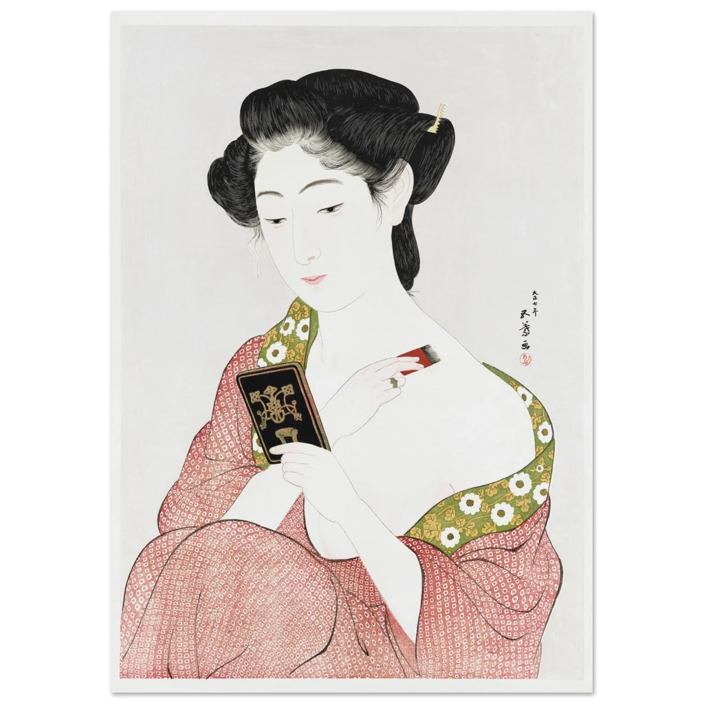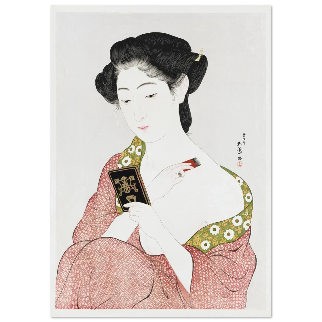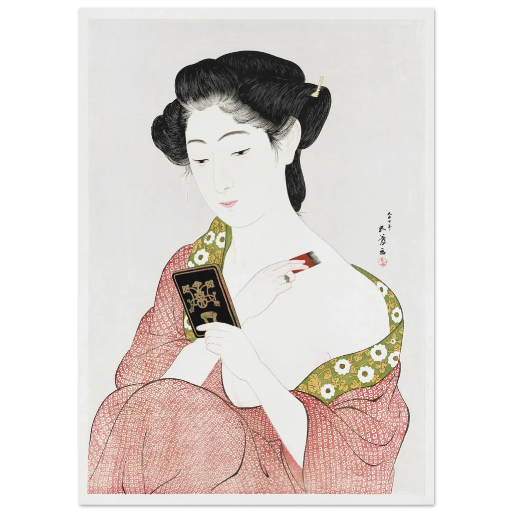 Immerse yourself in the serene elegance of traditional Japanese art with this exquisite print, “Beauty Applying Make-up (Keisen Tosa).” This stunning ukiyo-e piece captures a moment of quiet grace, showcasing delicate artistry and a vibrant yet harmonious color palette that brings an air of timeless sophistication to any room. Perfect for admirers of classical beauty and cultural depth, this poster adds a touch of historical charm and aesthetic tranquility to your living space or office.
