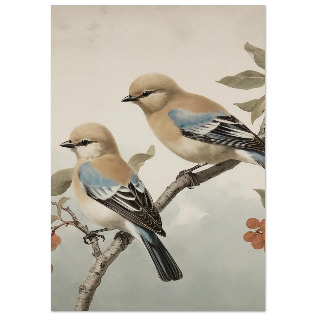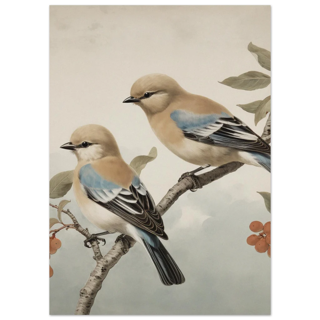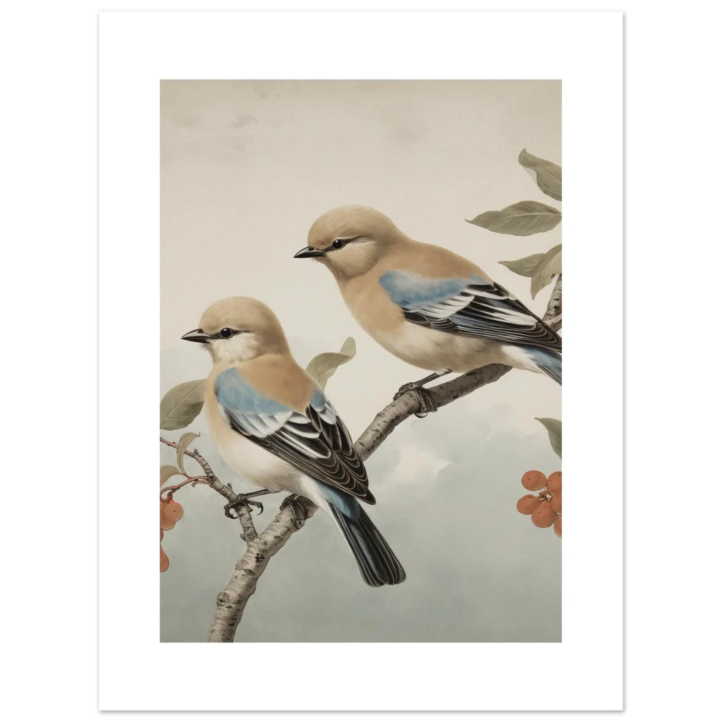 Invite a serene touch of nature and timeless elegance into your home with our captivating ‘Vintage Birds on Branch’ art print. This exquisite piece, featuring two beautifully rendered birds with subtle blue and warm beige tones, evokes a classic naturalist aesthetic. The soft color palette and delicate detailing create a peaceful, sophisticated mood, perfect for enhancing any living space, study, or bedroom with a whisper of the outdoors.